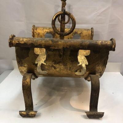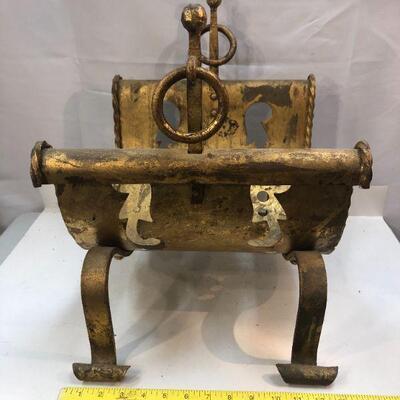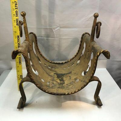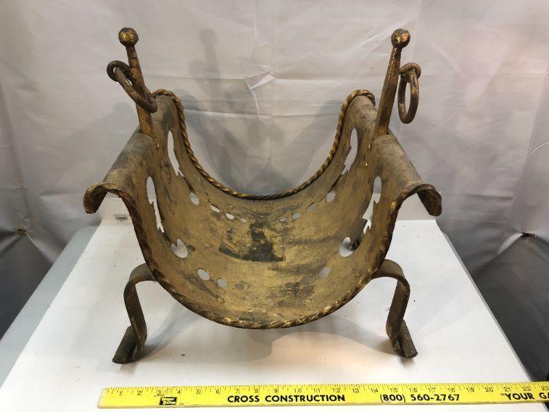 This is a unique piece with a great patina is ready to enhance your fireplace or possibly serve as a magazine rack. The formed metal resembles a sling suspended from two sides that finish with a curl. The four feet curve away from body and end in a curl. There are brass rings attached to posts that rise on either side. The base has various cut out design in two rows. Measures about 20"x17"x14"