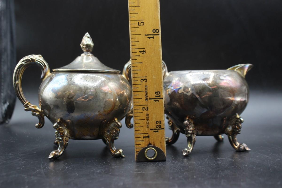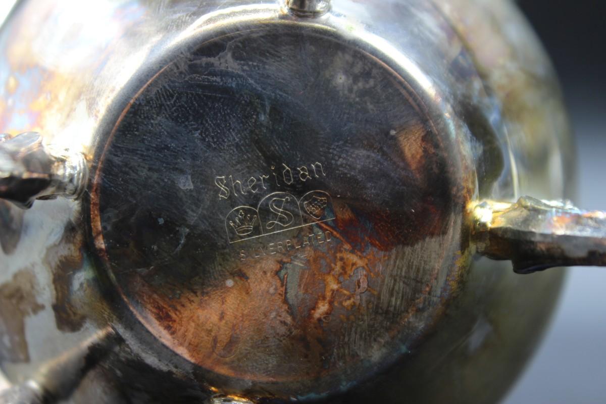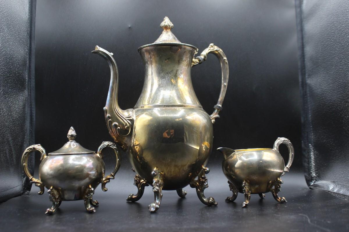 Antique Vintage Sheridan Silver Plate Three Piece Tea Set Pot Creamer Sugar Bowl