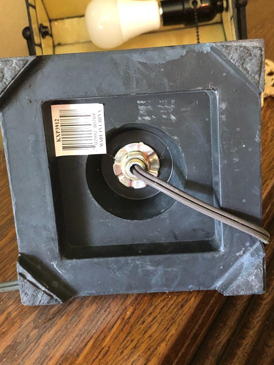 Vintage style desk lamp with metal base, Tiffany-style shade and pull chain on-off switch. Made in China.