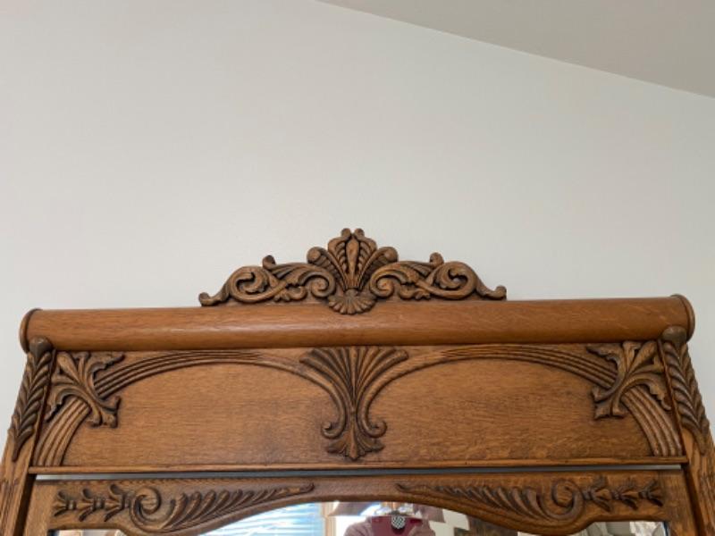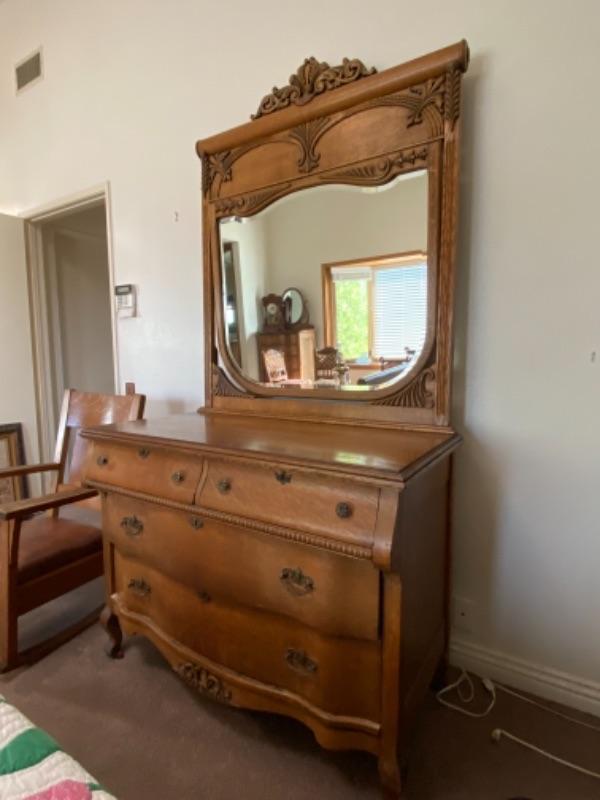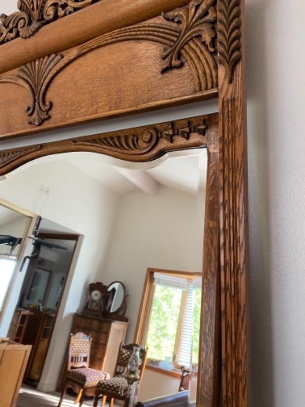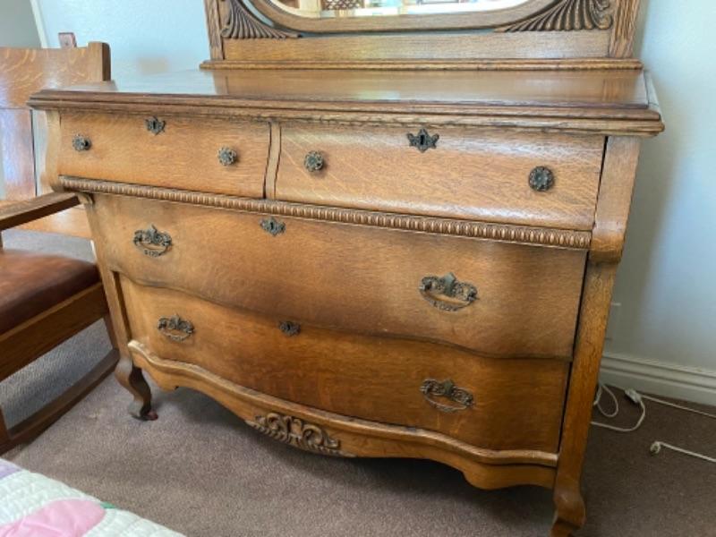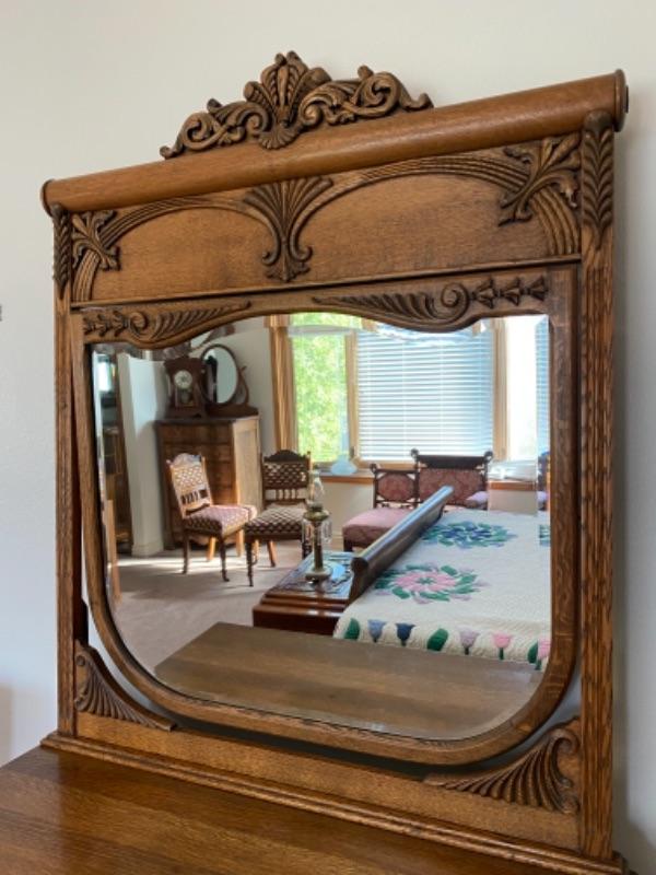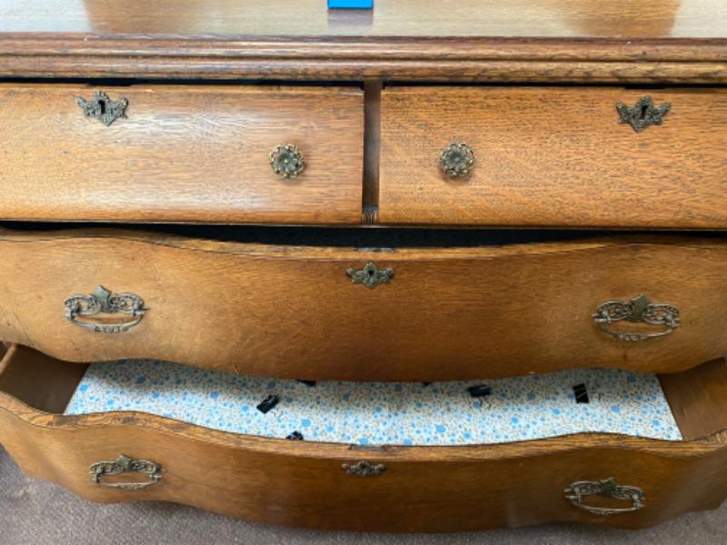 Antique Victorian mirrored dresser. Medium finish oak. Curved front with carved details. Mirror attached can swivel/tilt. 4 drawers, two small, two large. In great condition, well kept. Did not find a name inside of drawers, they do have liner in the bottom.