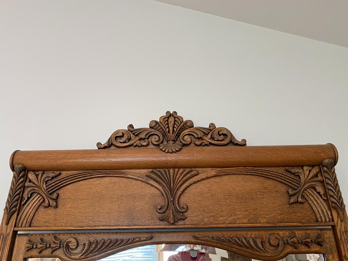 Antique Victorian mirrored dresser. Medium finish oak. Curved front with carved details. Mirror attached can swivel/tilt. 4 drawers, two small, two large. In great condition, well kept. Did not find a name inside of drawers, they do have liner in the bottom. PICK UP WILL BE IN HUNTINGTON BEACH.