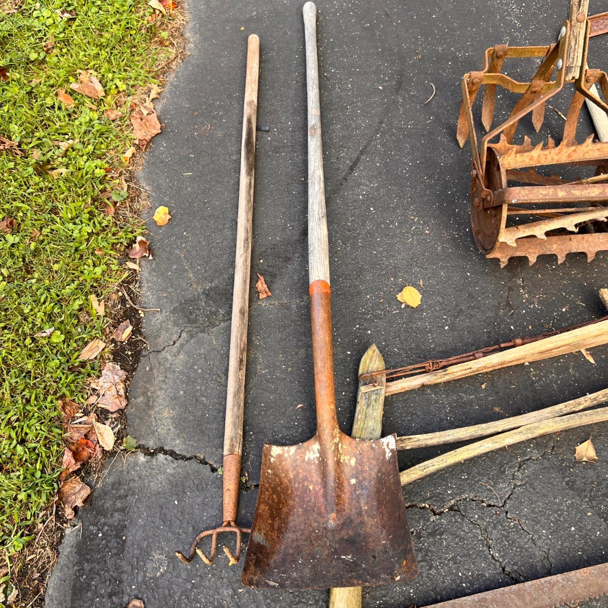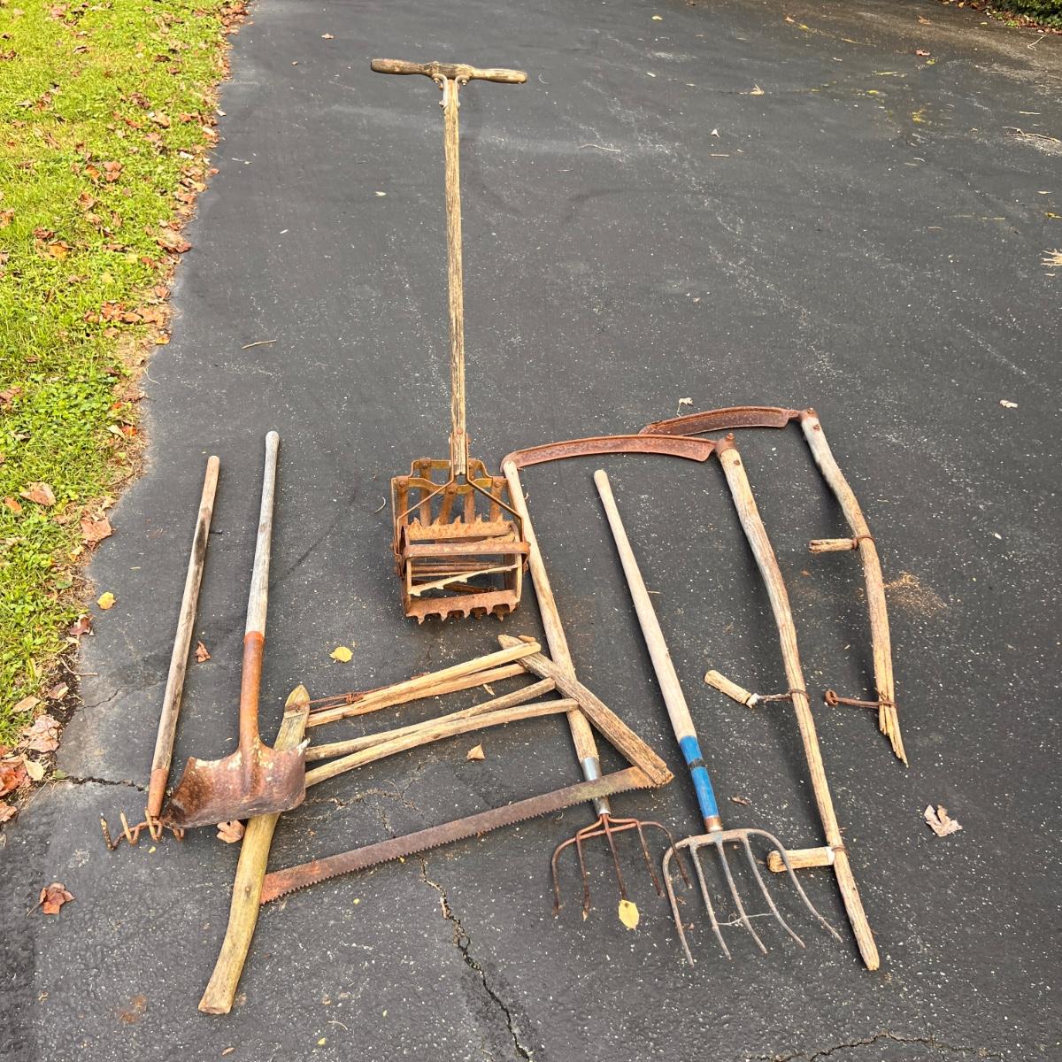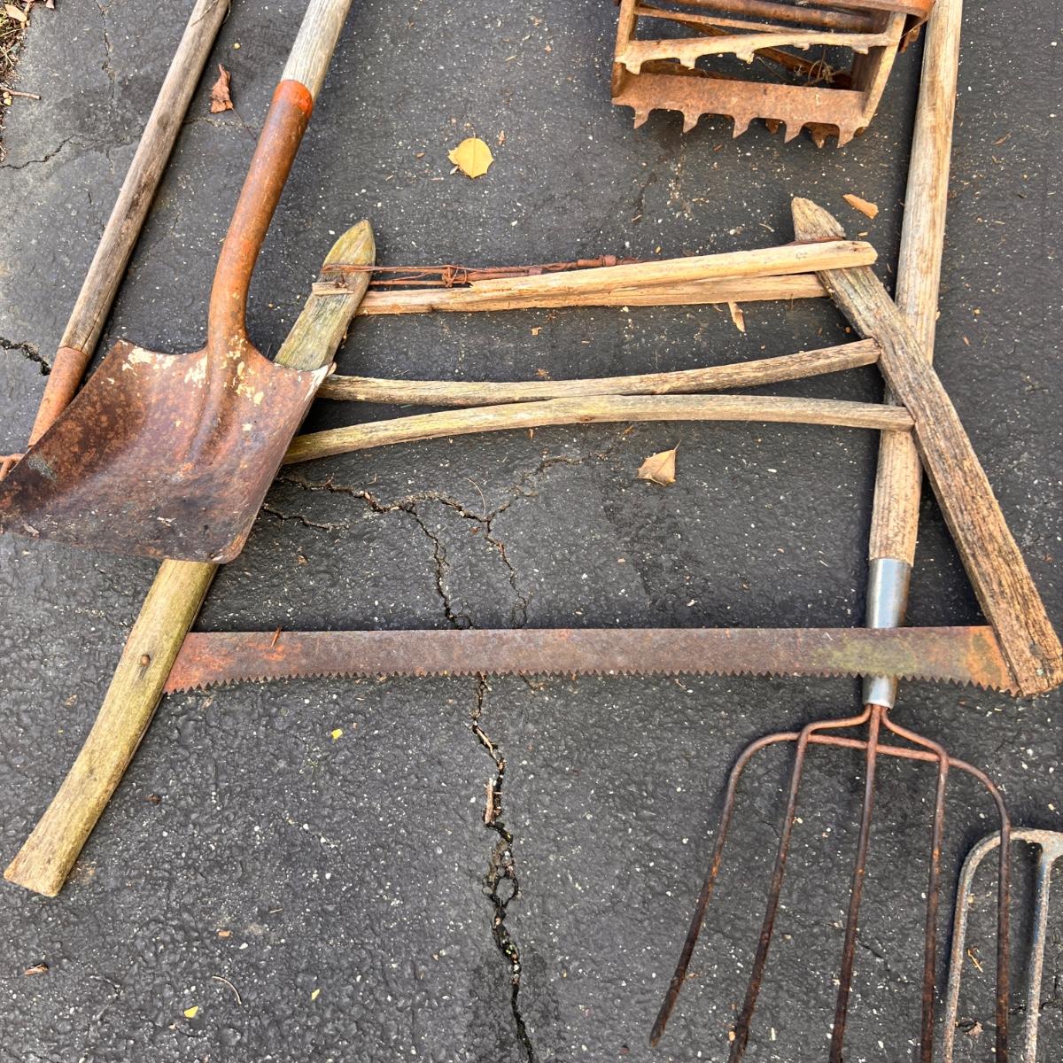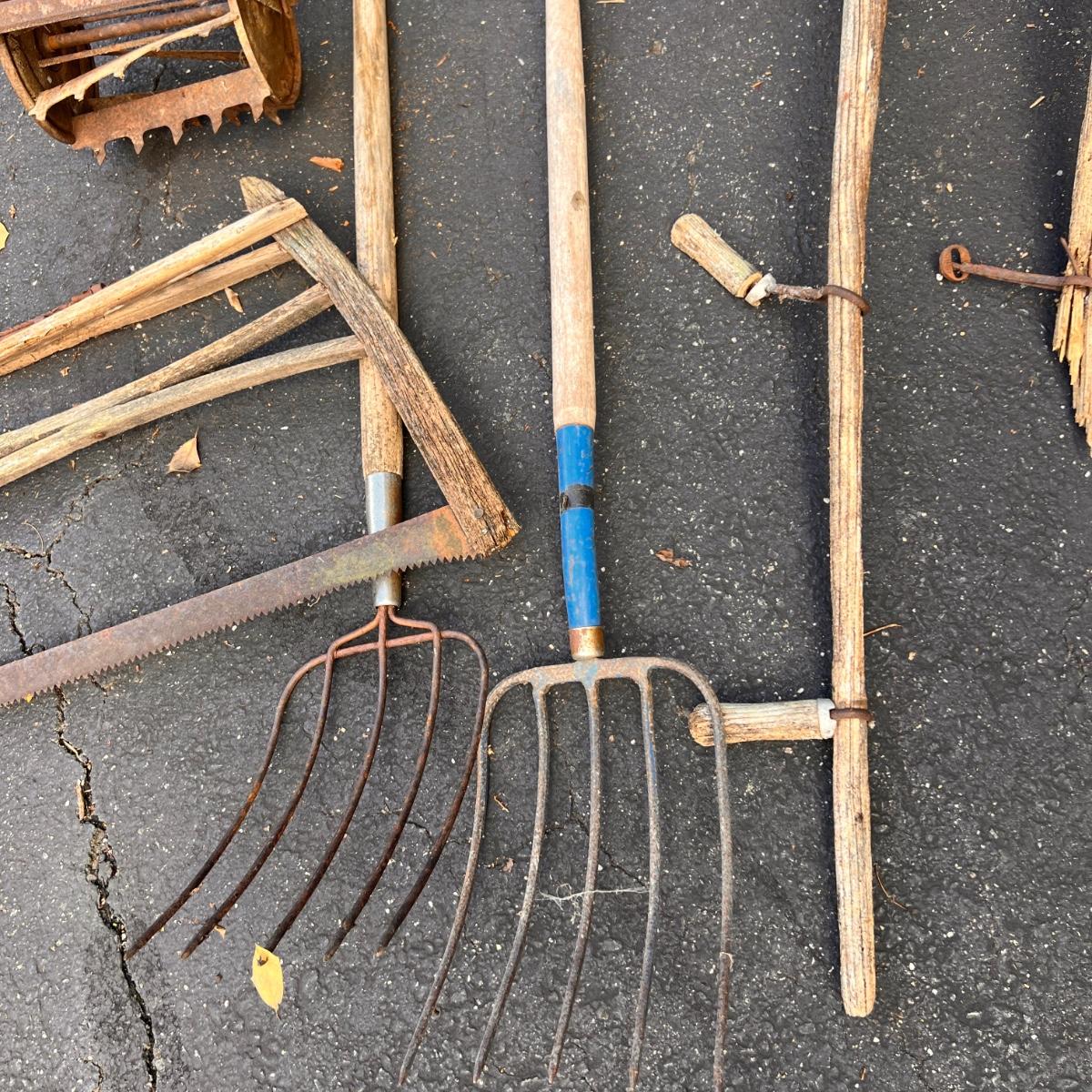 Wood handled tools including scythes (one has broken handle), antique rototiller, pitchforks, shovel, saw. See all pics for conditions.