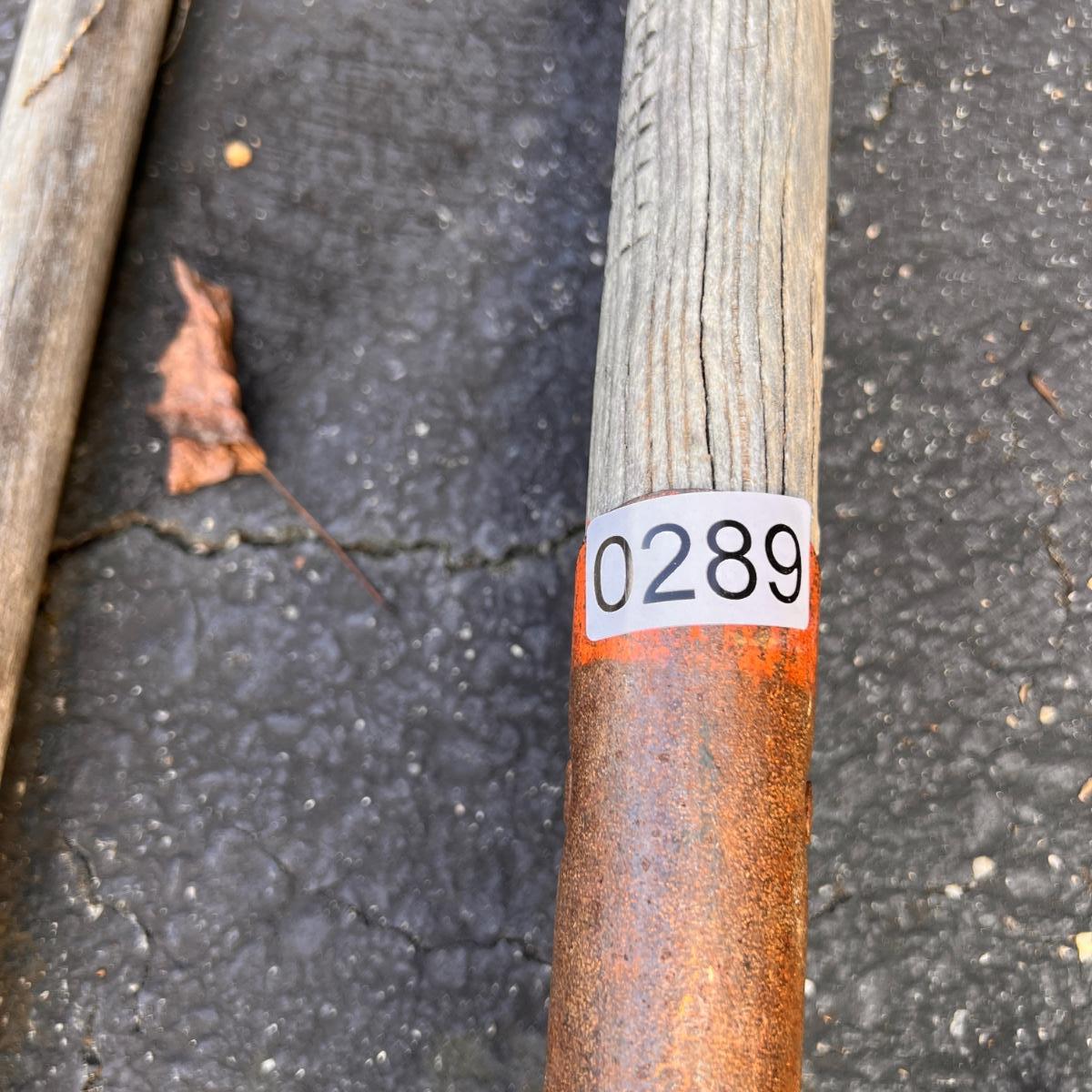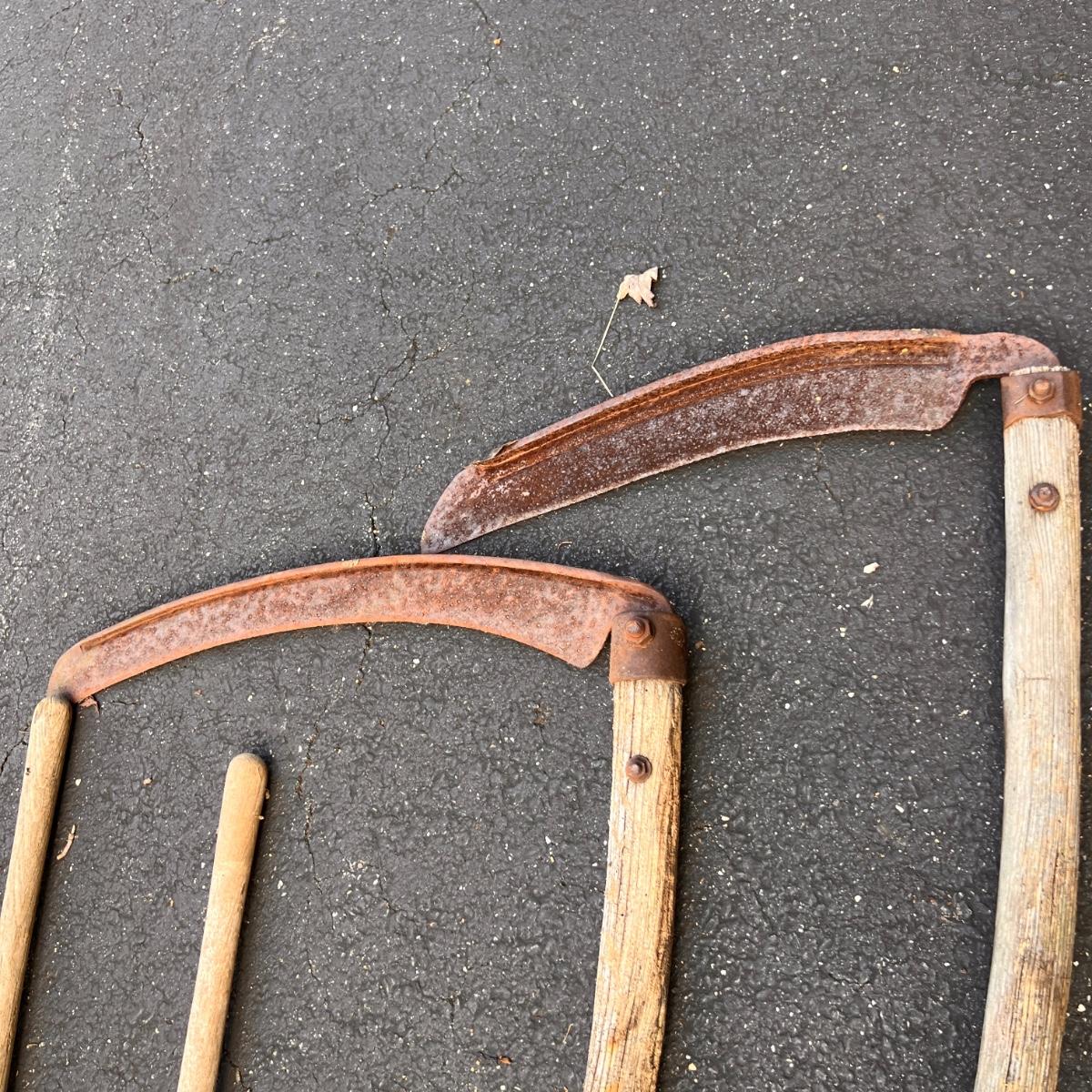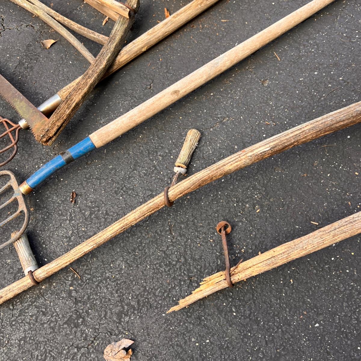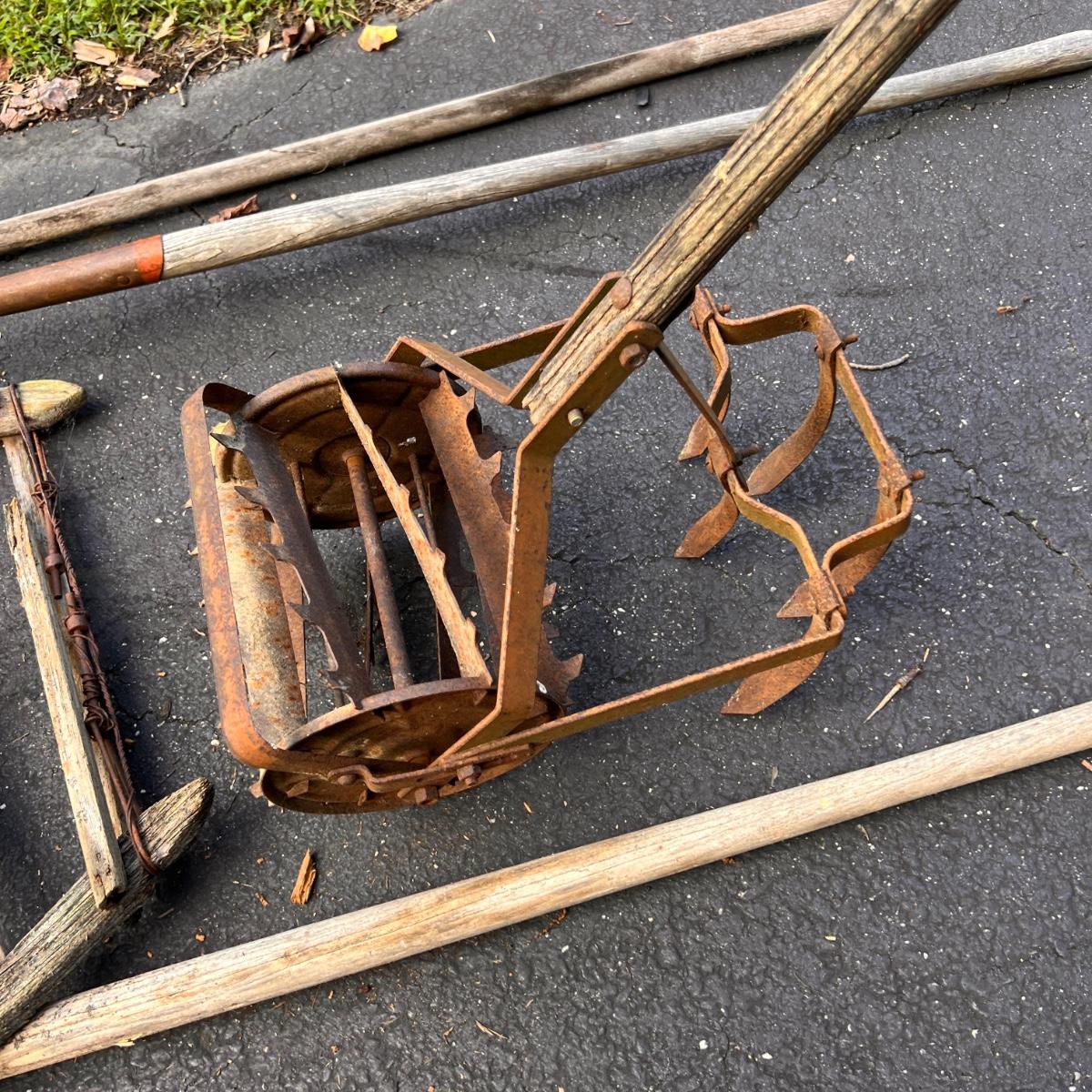 Wood handled tools including scythes (one has broken handle), antique rototiller, pitchforks, shovel, saw. See all pics for conditions.