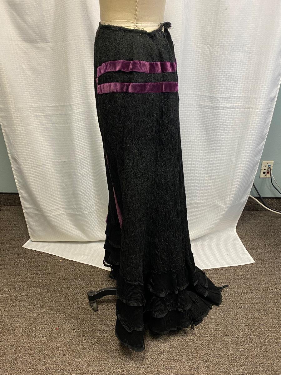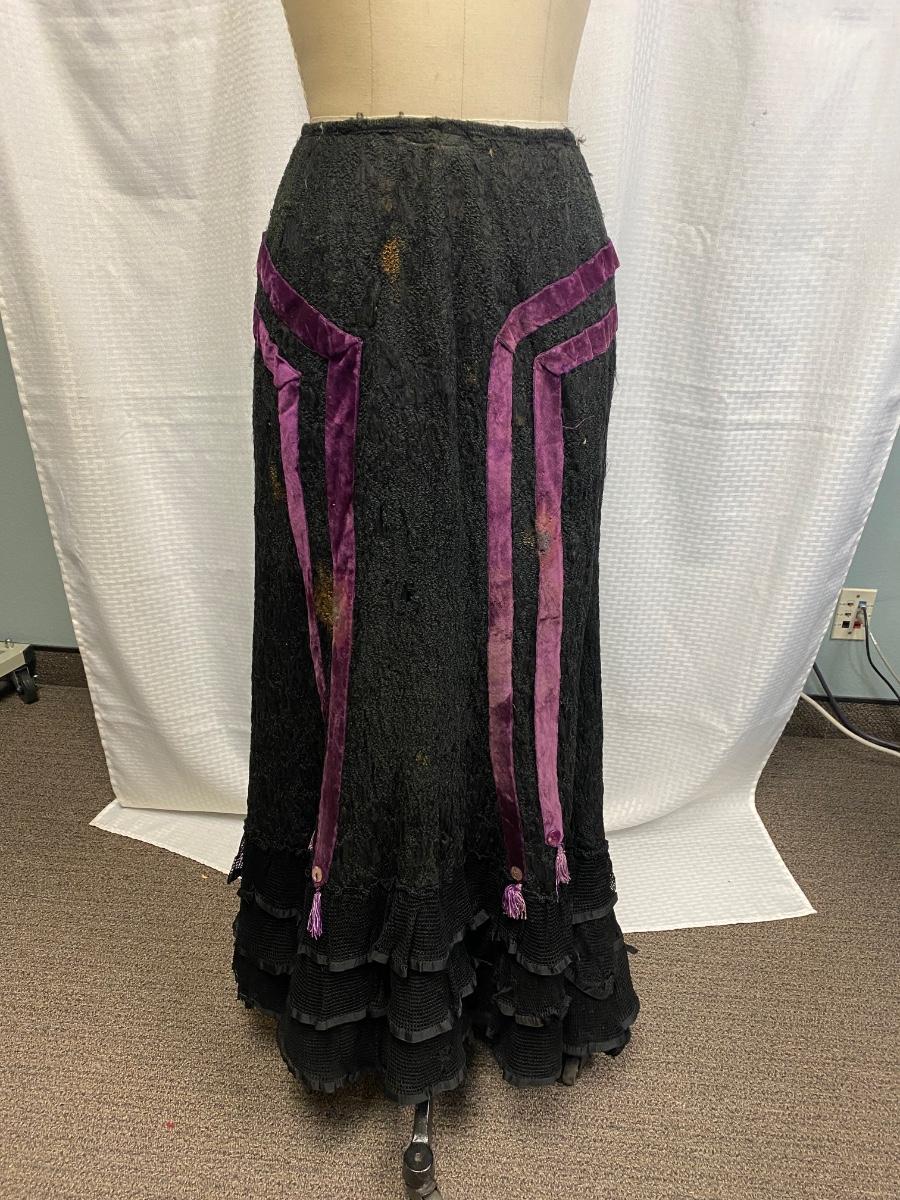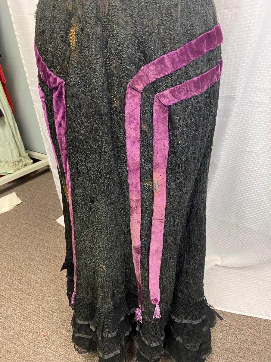 Antique Vintage Victorian Gothic Black Purple Velvet Full Length Skirt. Heavy textured black fabric. There are some bleached out spots and holes. Small through the waist would not fit size 8.