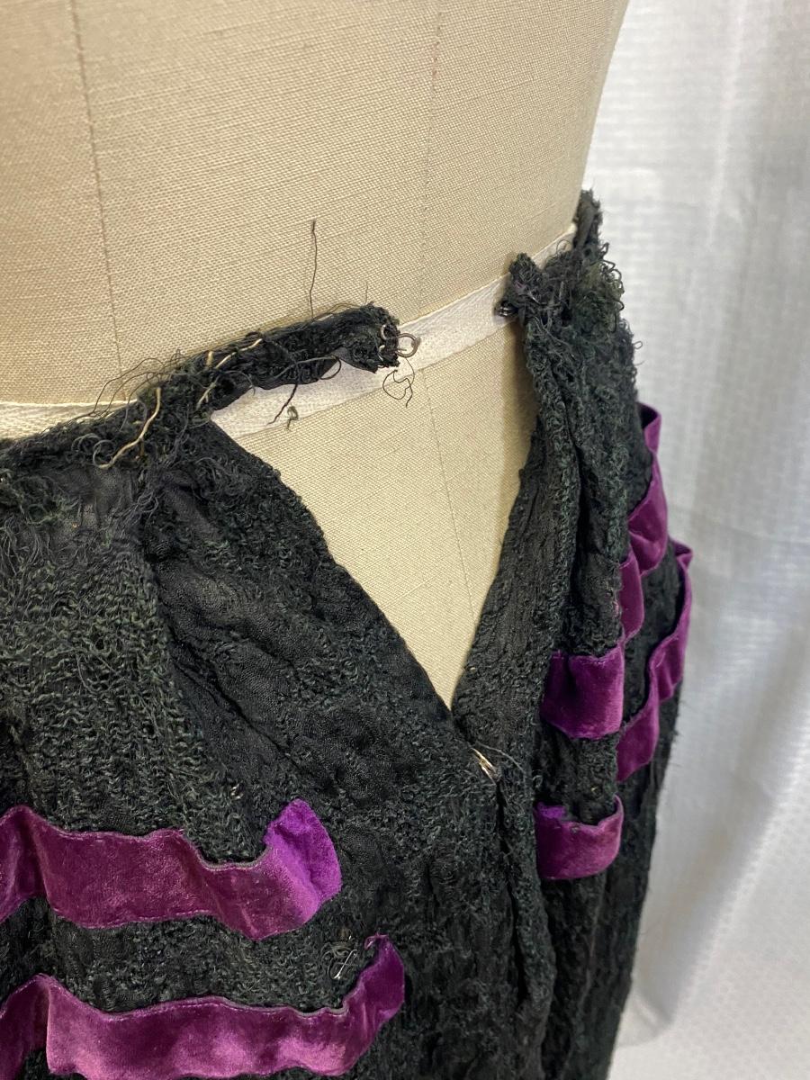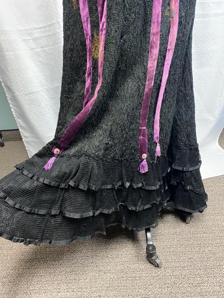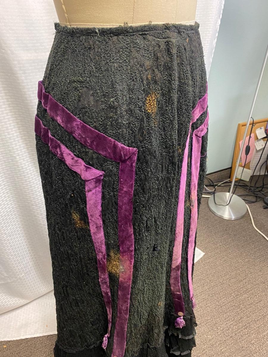 Antique Vintage Victorian Gothic Black Purple Velvet Full Length Skirt. Heavy textured black fabric. There are some bleached out spots and holes. Small through the waist would not fit size 8.