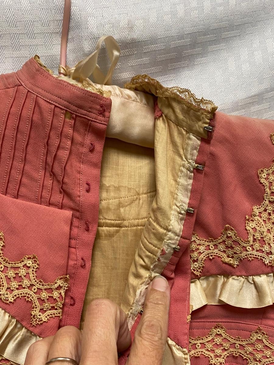 Antique Vintage Victorian Toddler Dark Pink with Lace Dress. Antique condition, there is discolor, light stains, and small moth holes. Hook and eye closure up the back. Toddler/large doll size.