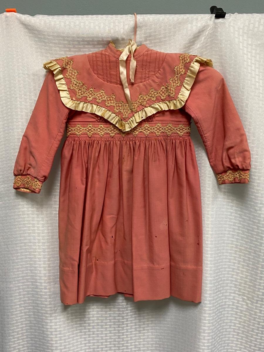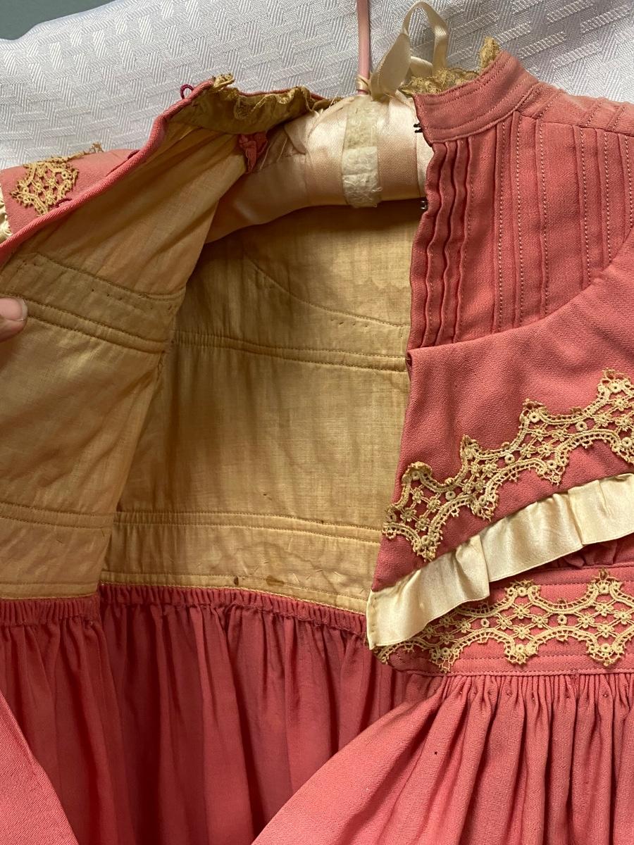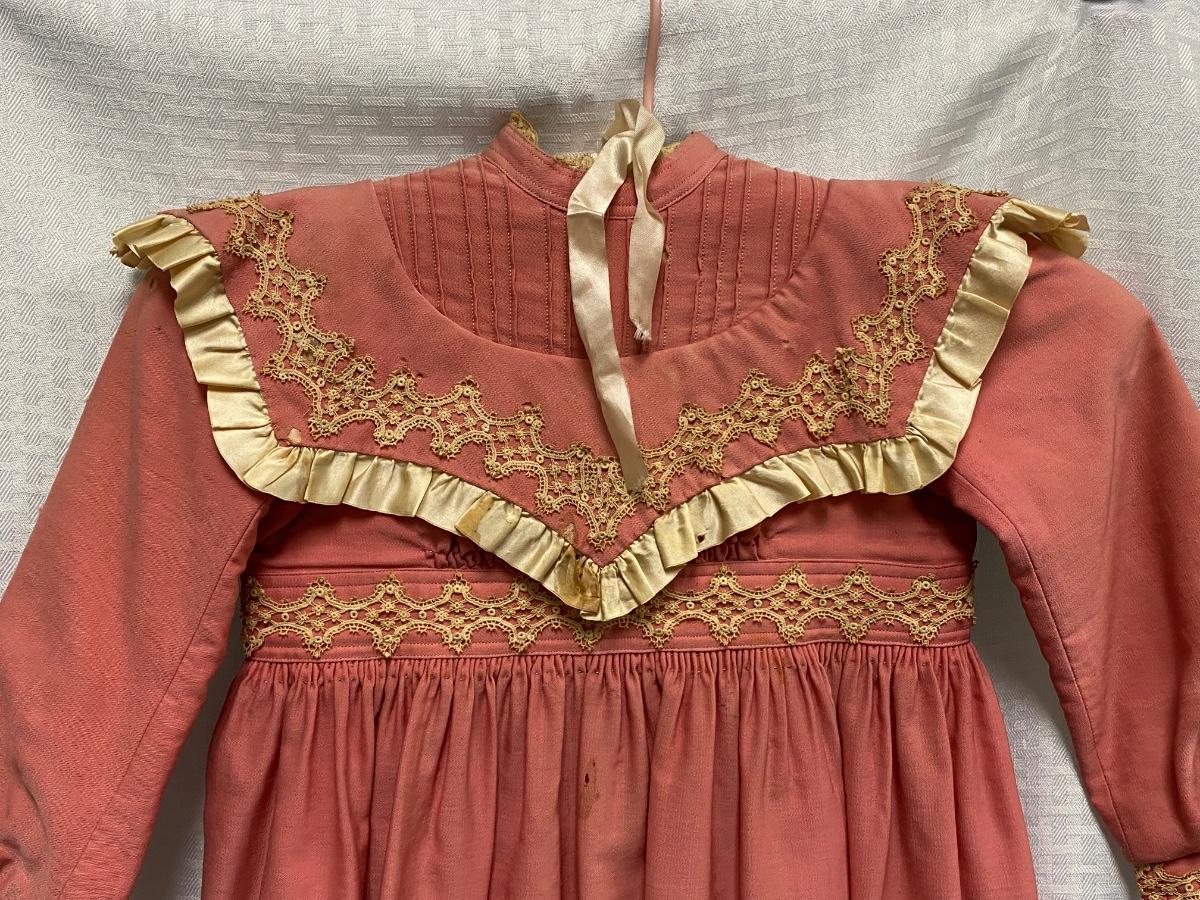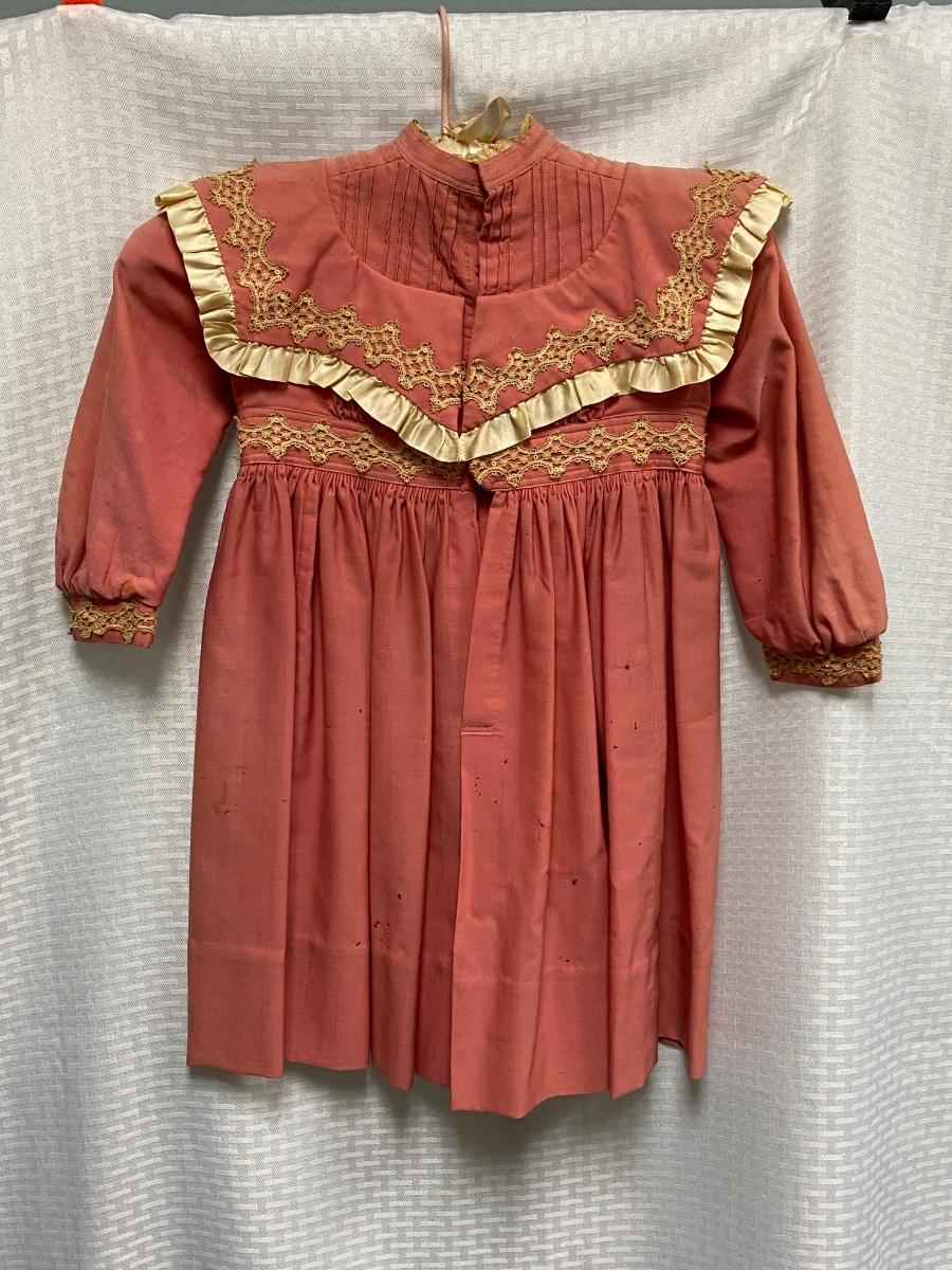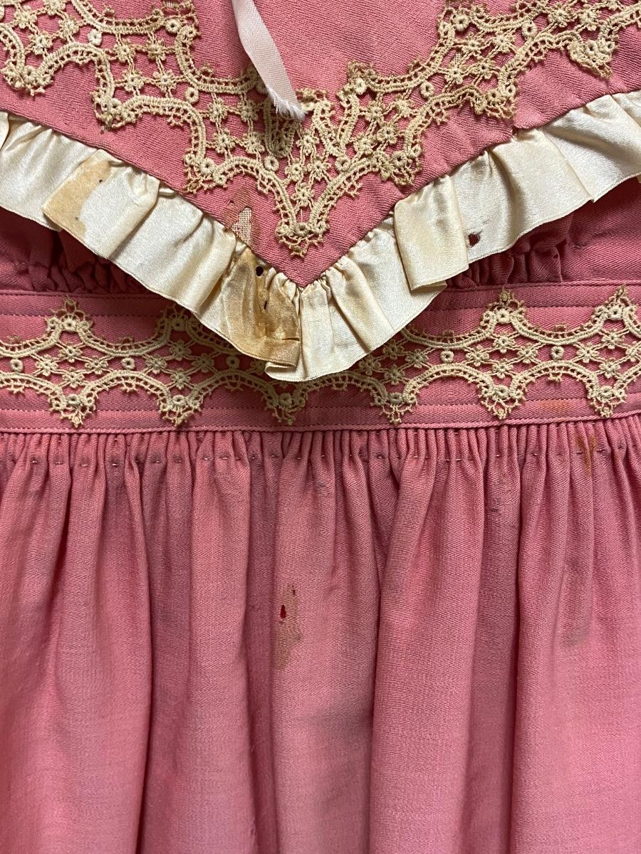 Antique Vintage Victorian Toddler Dark Pink with Lace Dress. Antique condition, there is discolor, light stains, and small moth holes. Hook and eye closure up the back. Toddler/large doll size.