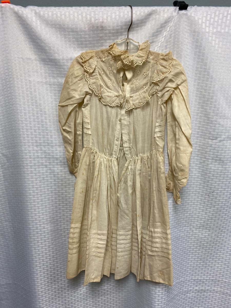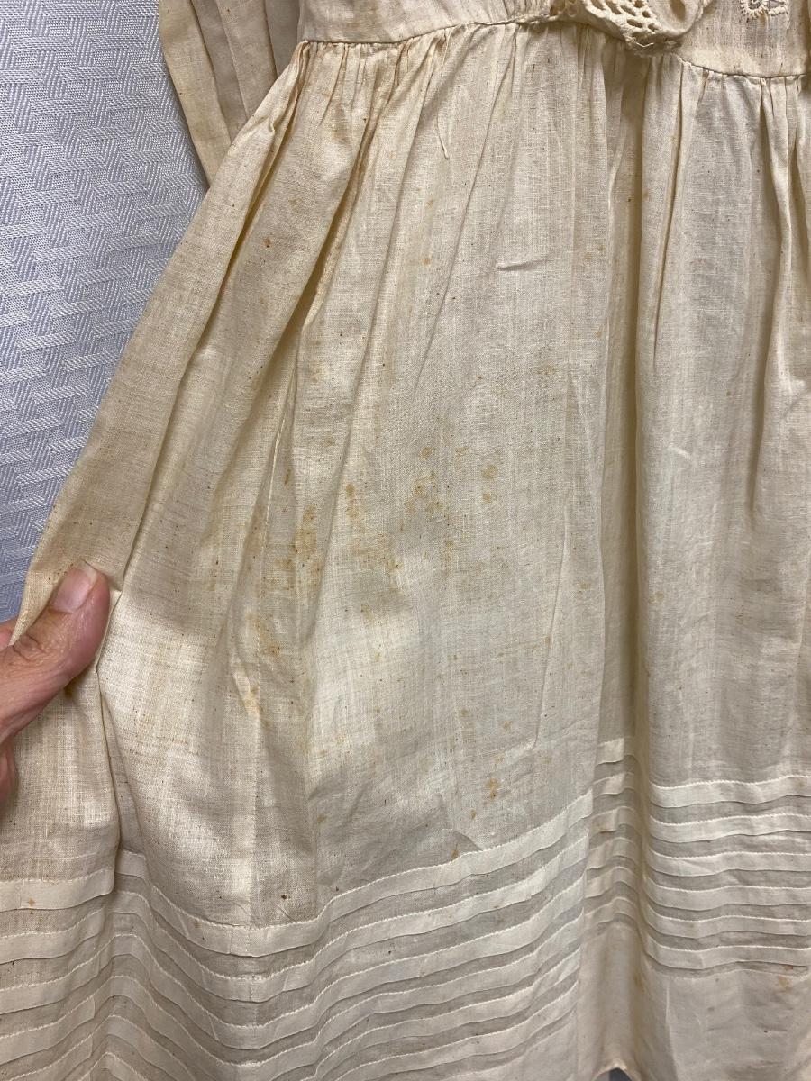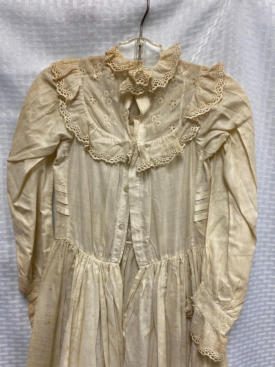 Antique Vintage Victorian White Cotton Young Girl Youth Tea Sun Dress. In good antique condition. There is discolor from age and some spotting but no holes. Buttons up the back.
