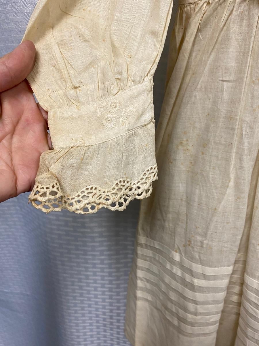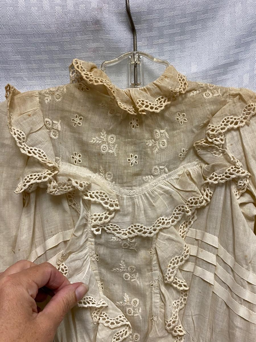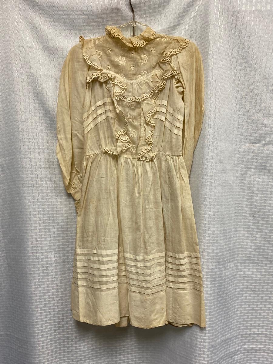 Antique Vintage Victorian White Cotton Young Girl Youth Tea Sun Dress. In good antique condition. There is discolor from age and some spotting but no holes. Buttons up the back.