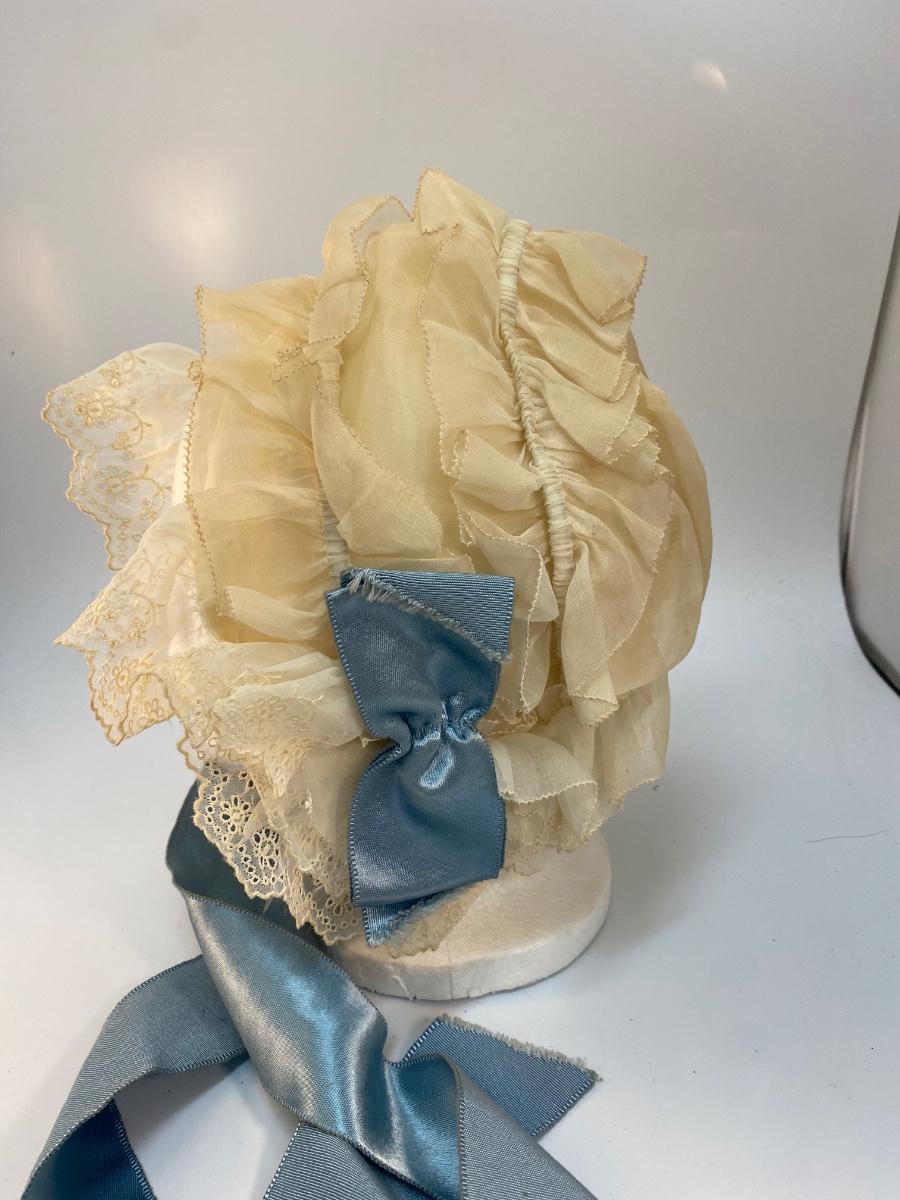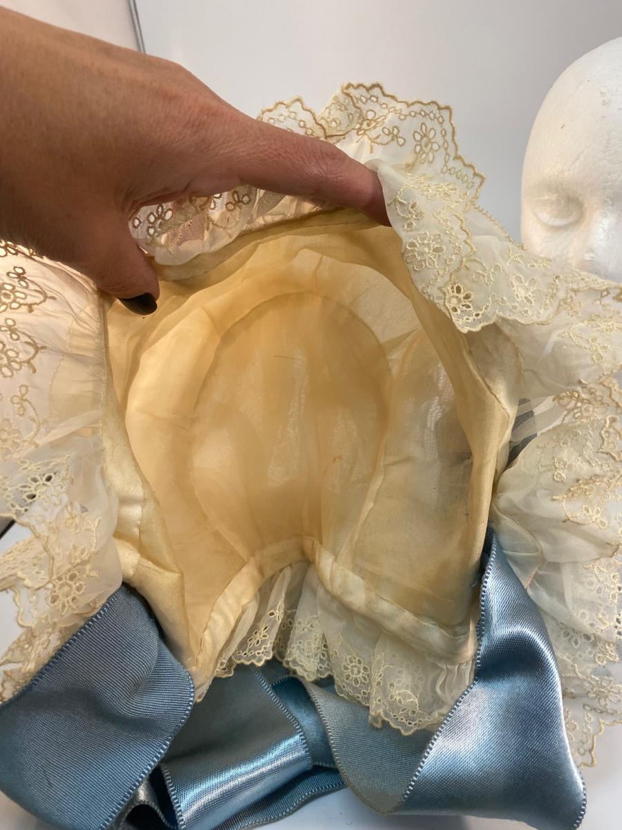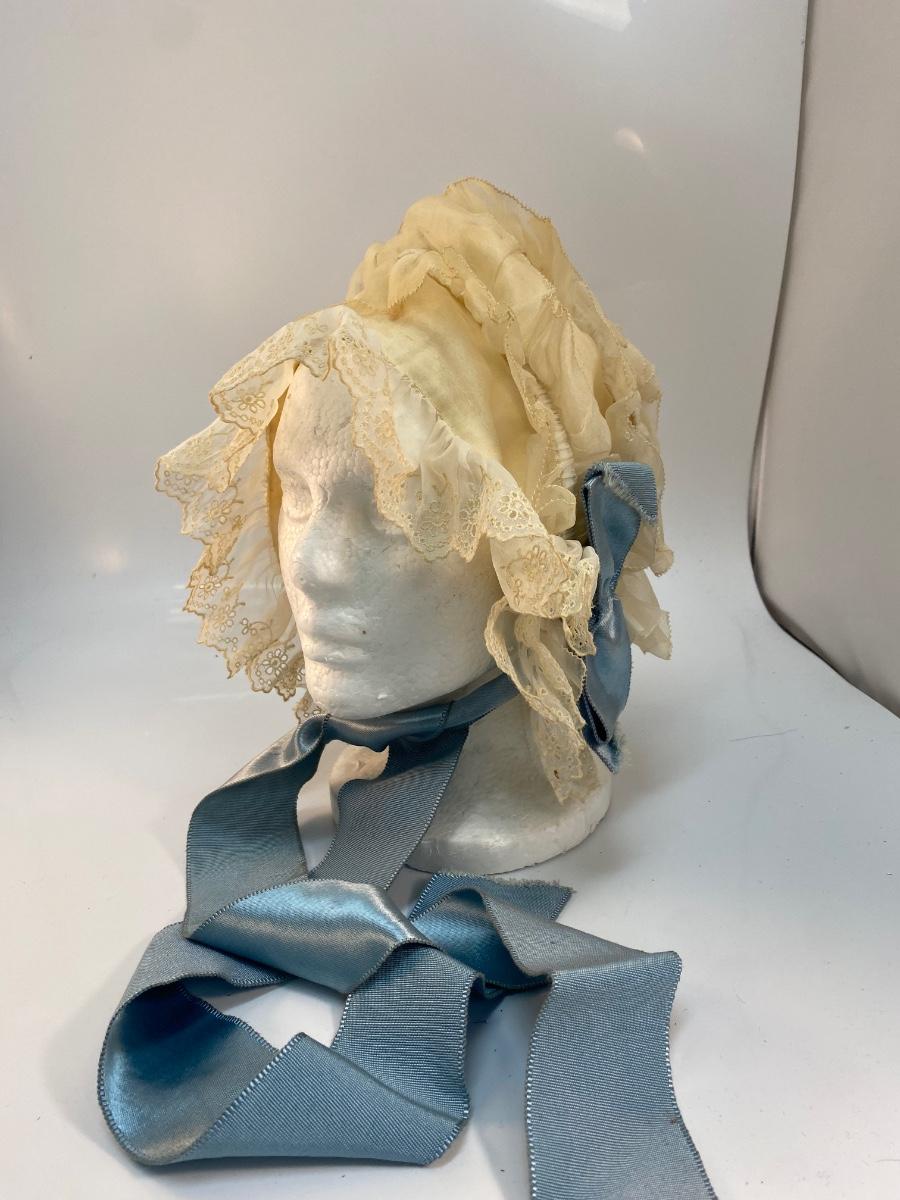 Antique Vintage White Cotton Eyelet Lace Bonnet with Blue Ribbon. There is discolor from age but in overall good condition. Long blue ribbon for tying.