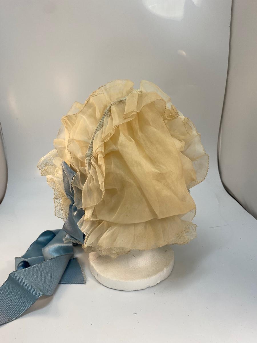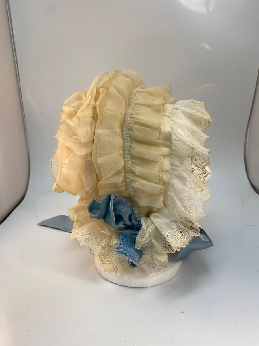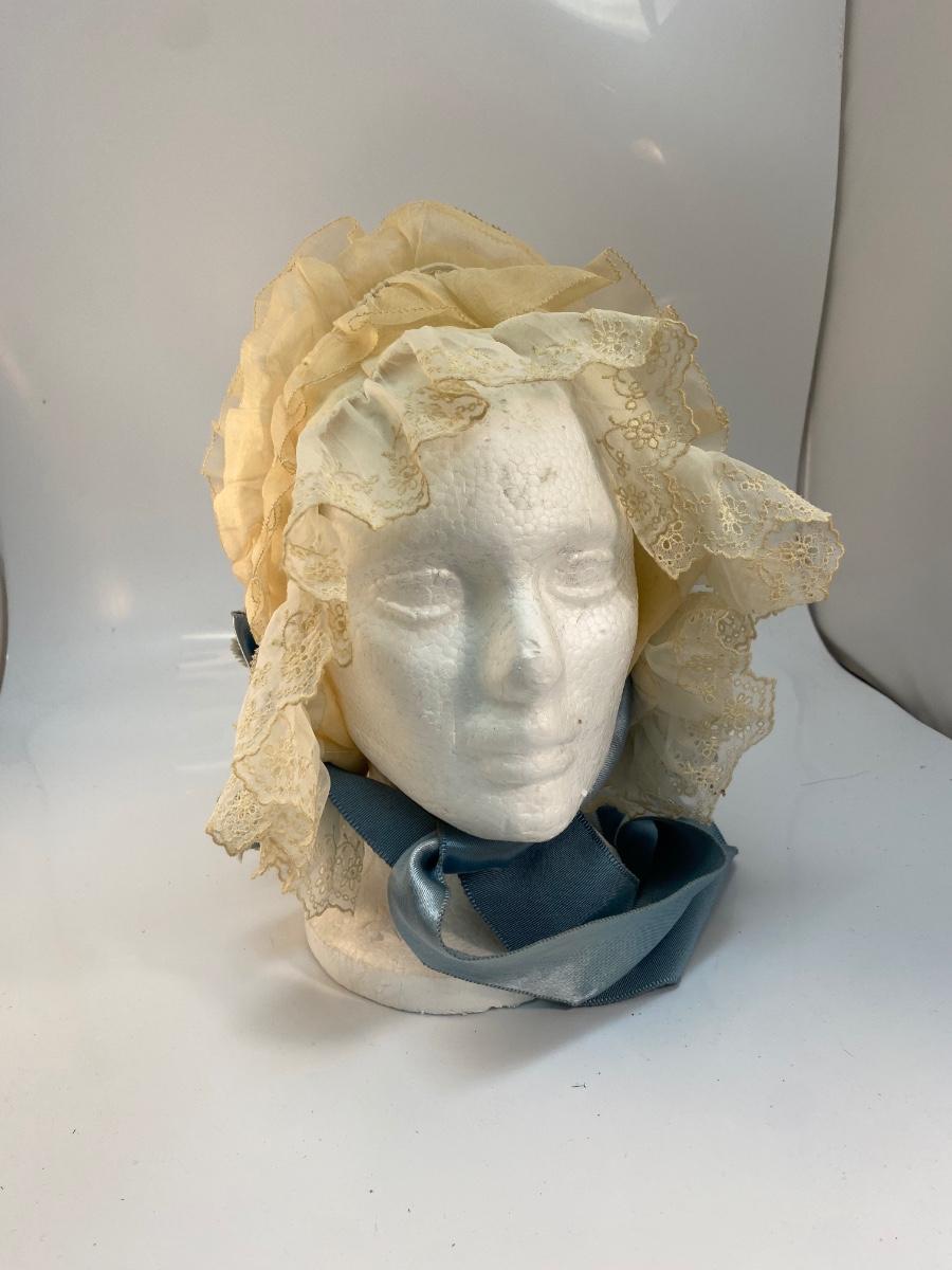 Antique Vintage White Cotton Eyelet Lace Bonnet with Blue Ribbon. There is discolor from age but in overall good condition. Long blue ribbon for tying.
