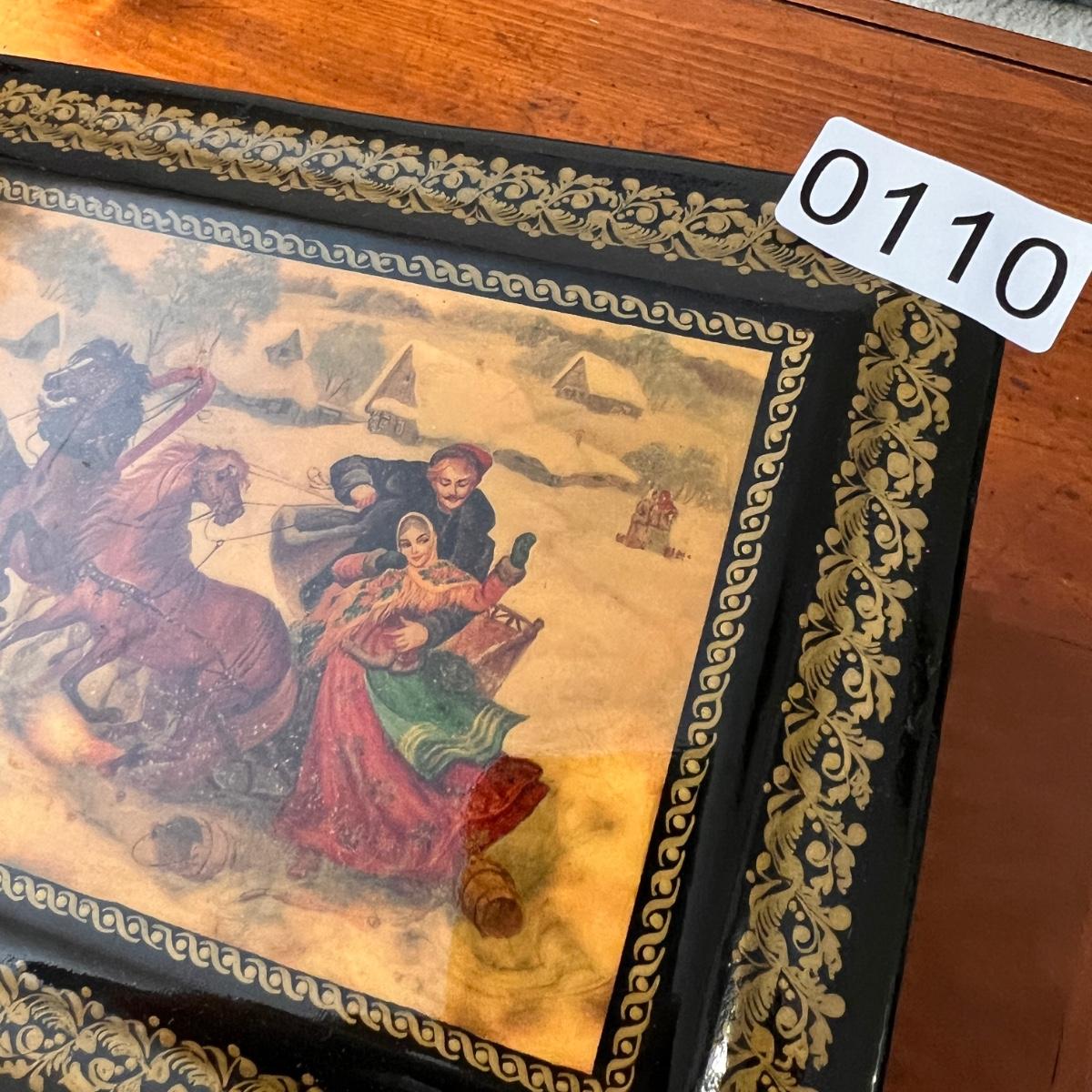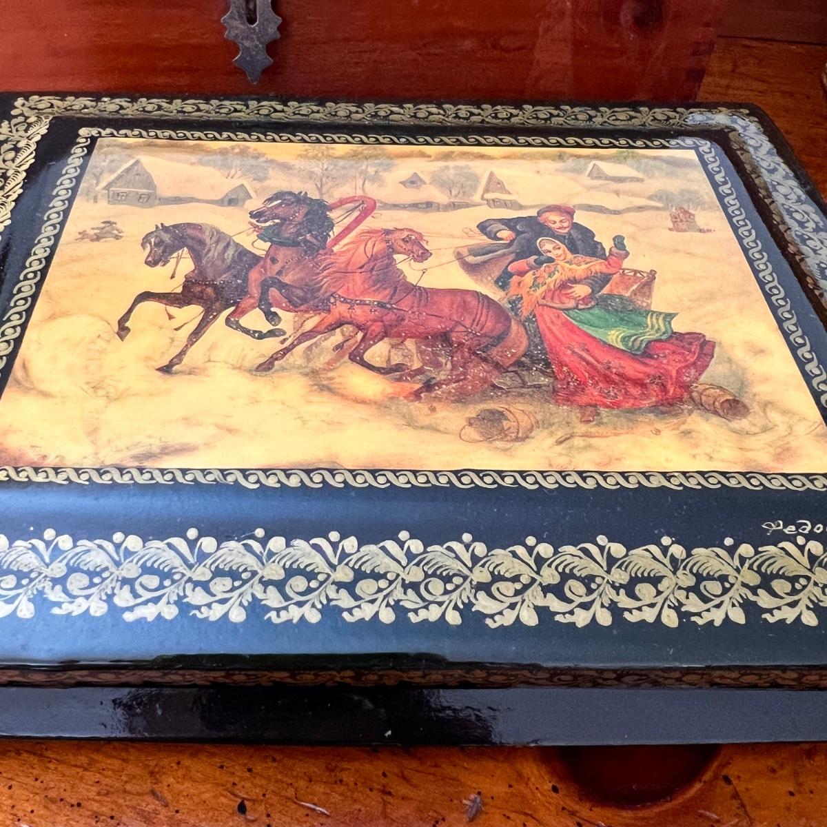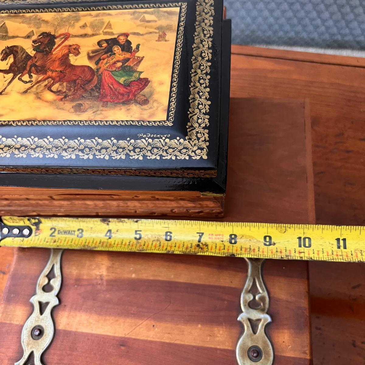 Russian Troika lacquer wooden box, picture window wooden box, Cedarwood box with metal hardware, box with lift out tray.