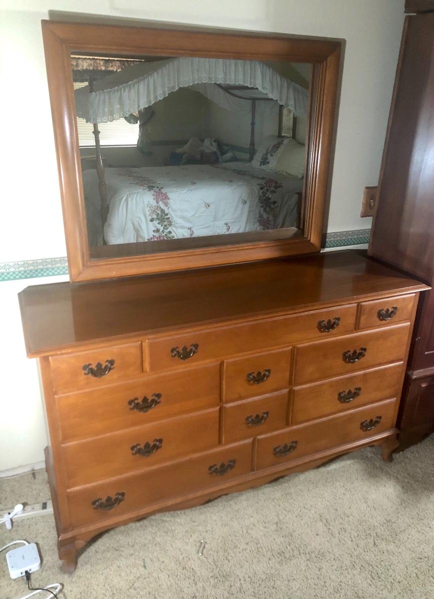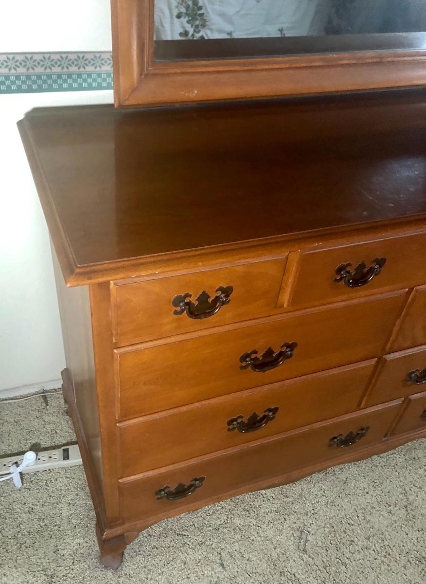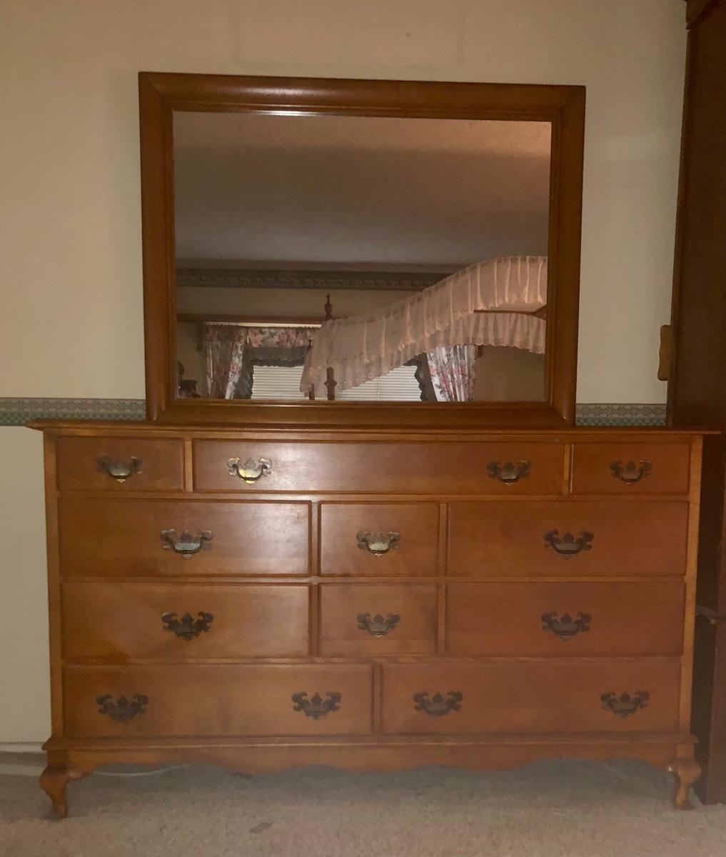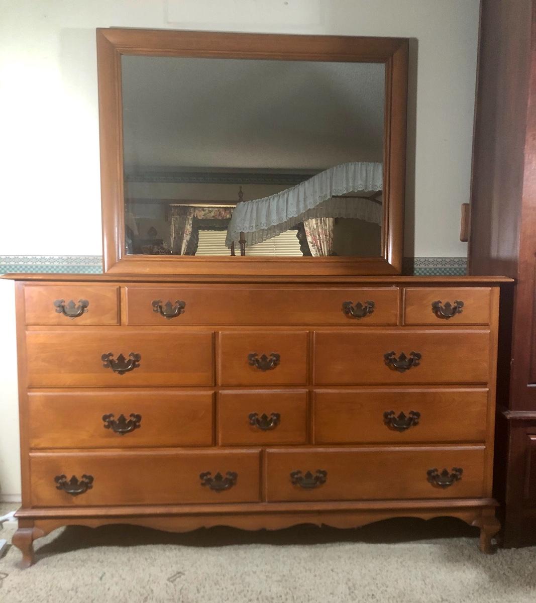 Antique vintage wood dresser with 11 drawers and attached mirror. Made by Cal Shops. Dresser is 34” tall, 60” long and 20” deep. Attached mirror is 33” tall x 43” wide.