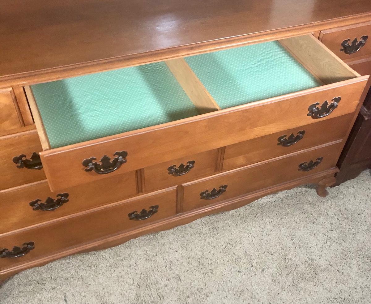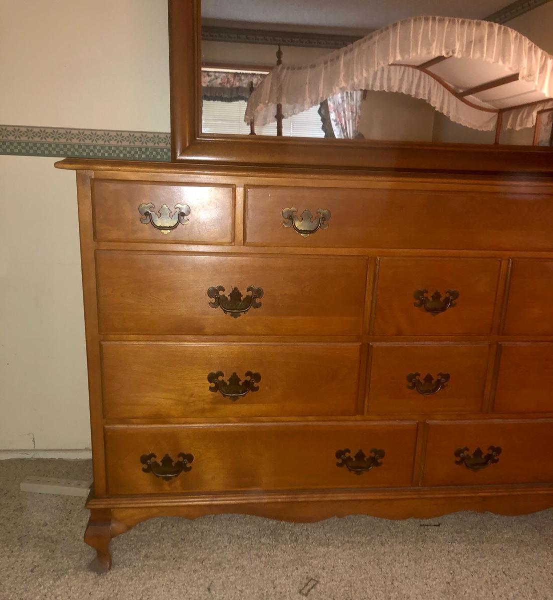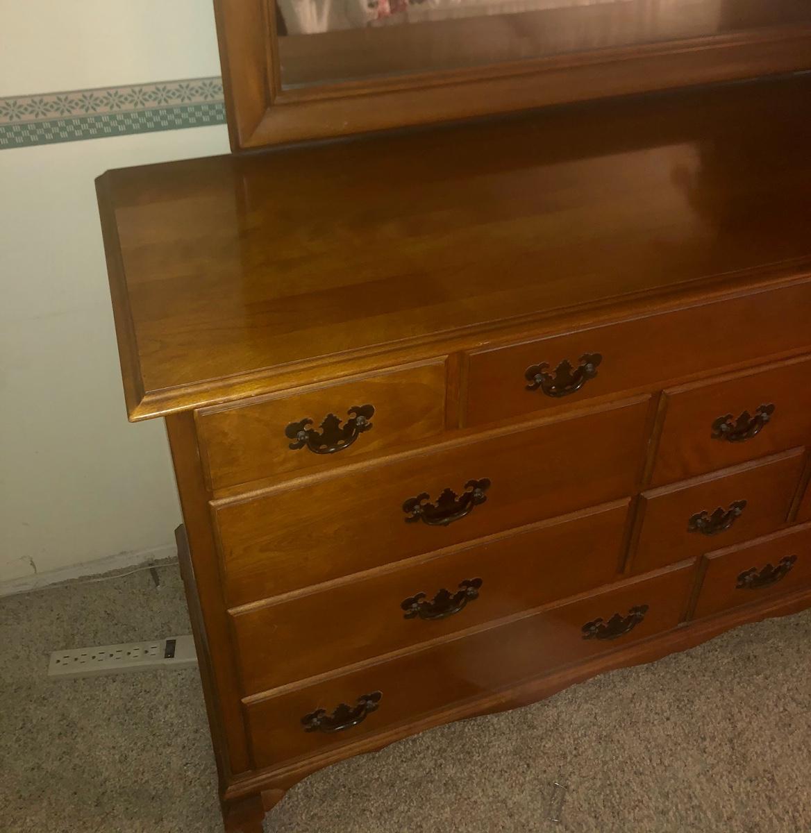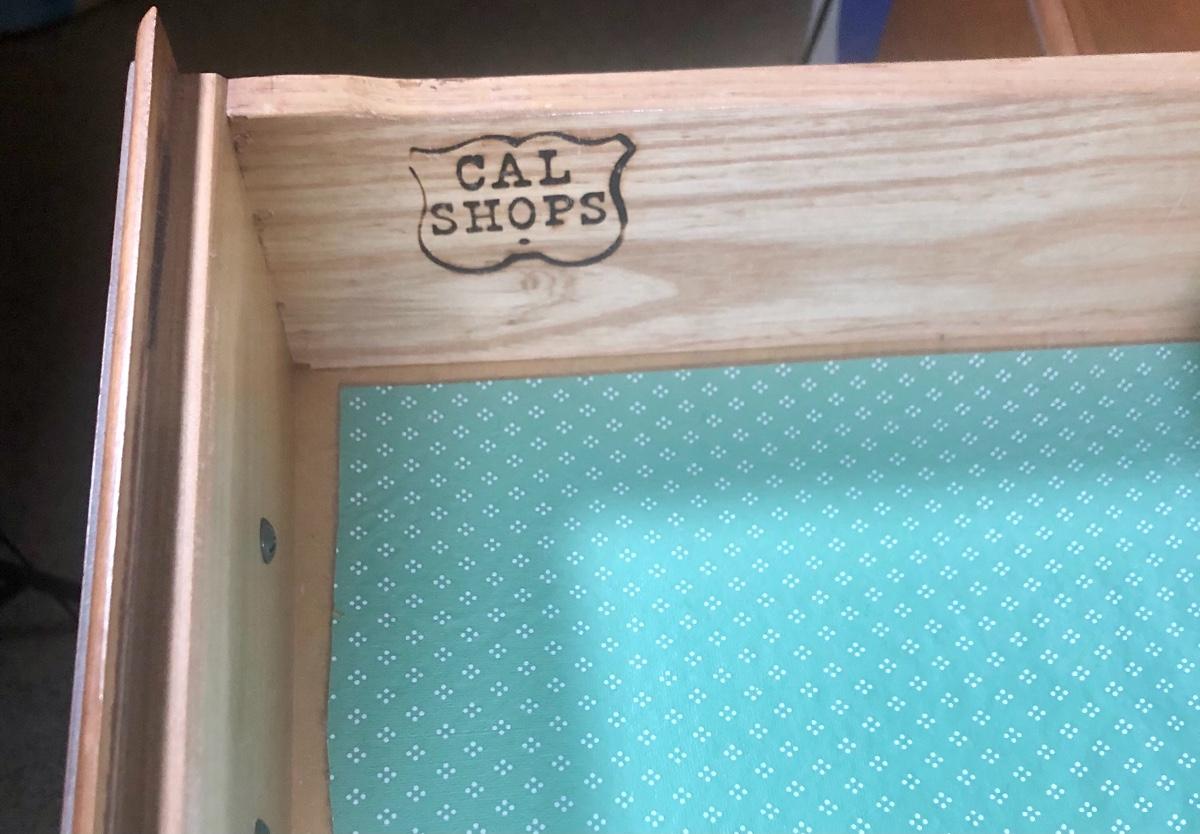 Antique vintage wood dresser with 11 drawers and attached mirror. Made by Cal Shops. Dresser is 34” tall, 60” long and 20” deep. Attached mirror is 33” tall x 43” wide.