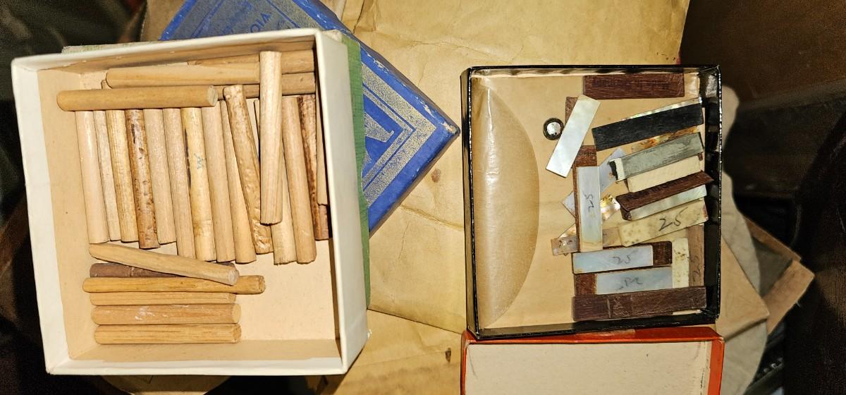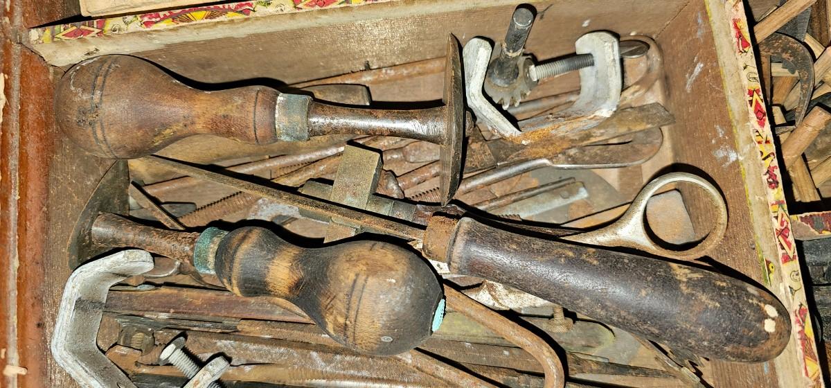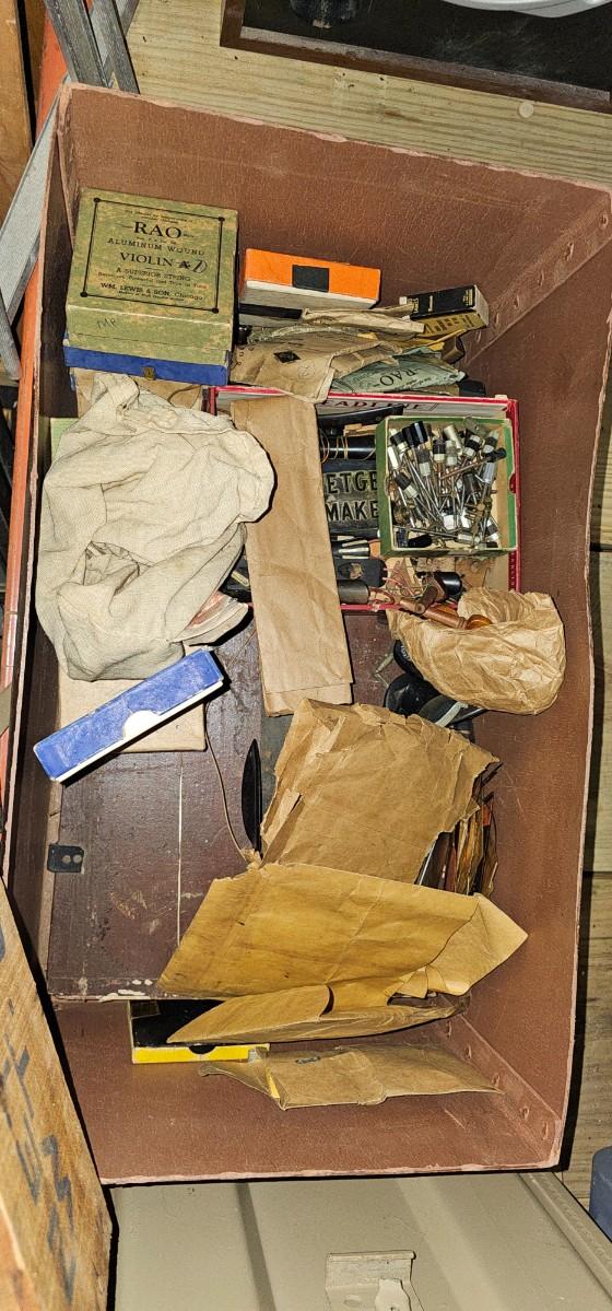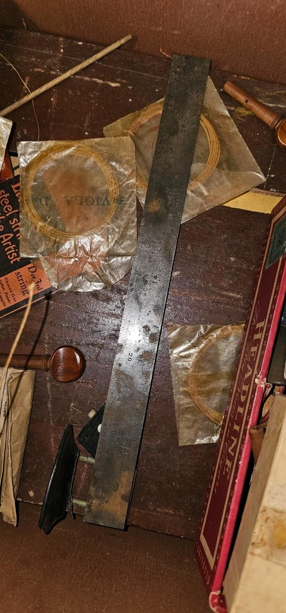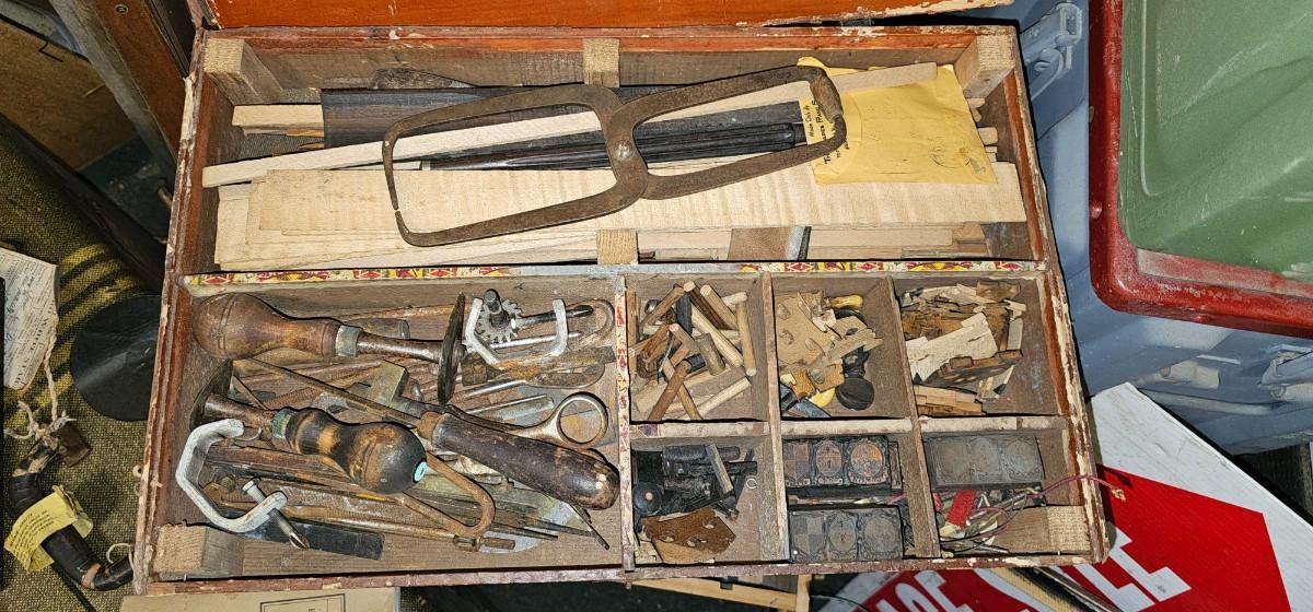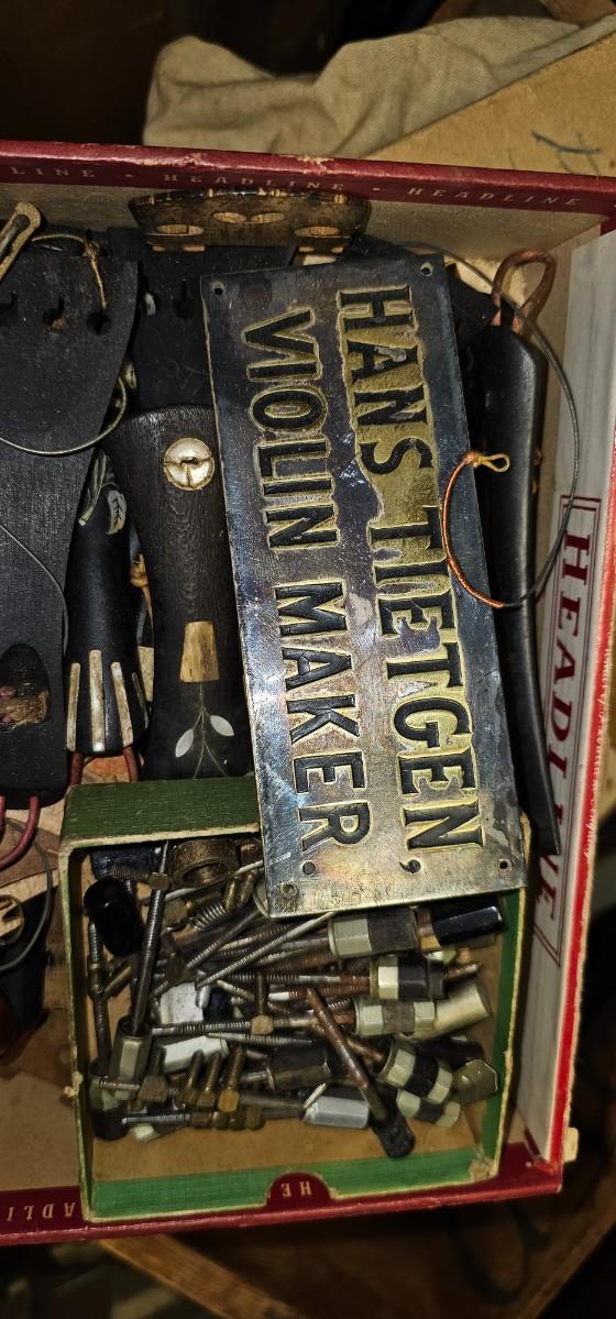 Antique violin maker tools and supplies. Brass name plate "Hans Tietgen Violin Maker"