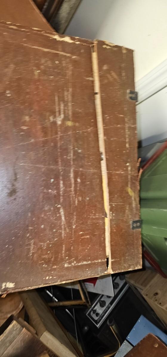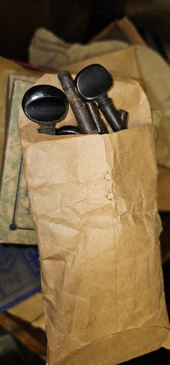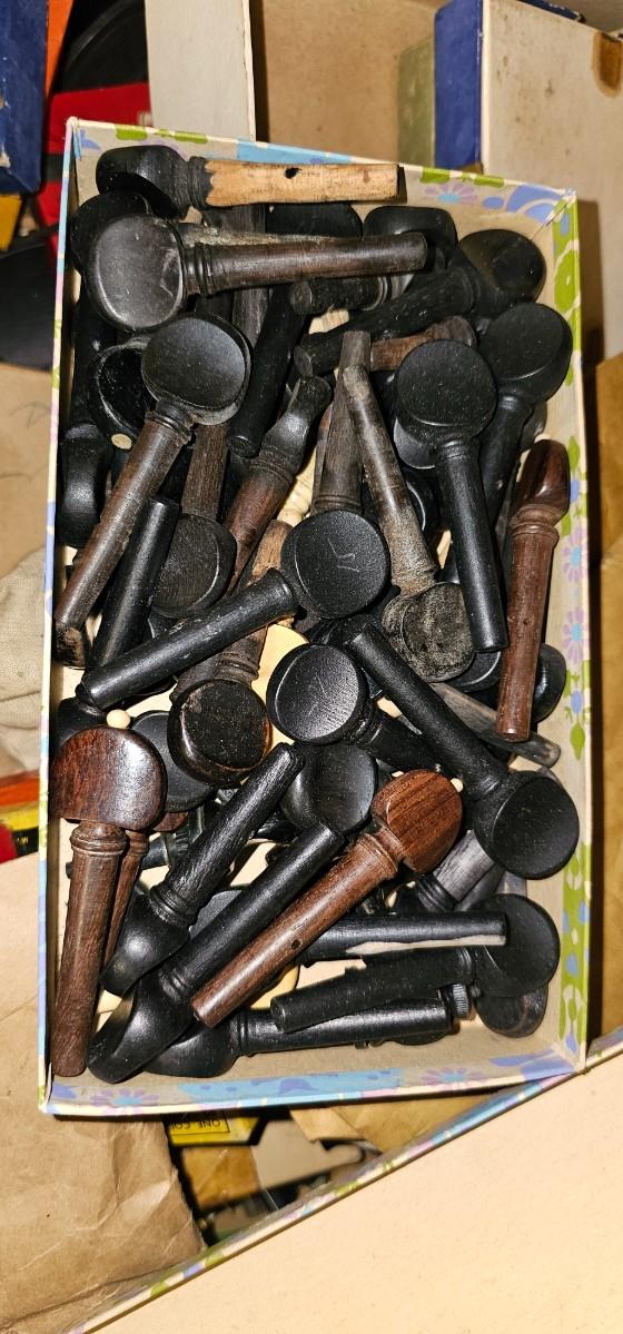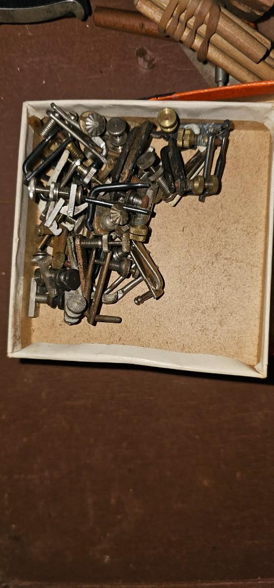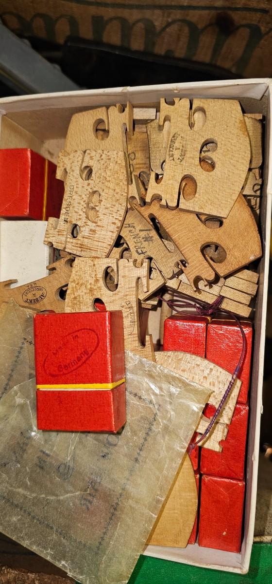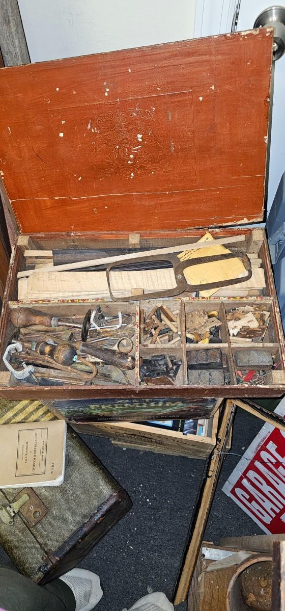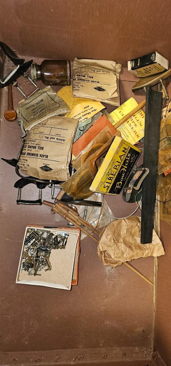 Antique violin maker tools and supplies. Brass name plate "Hans Tietgen Violin Maker"