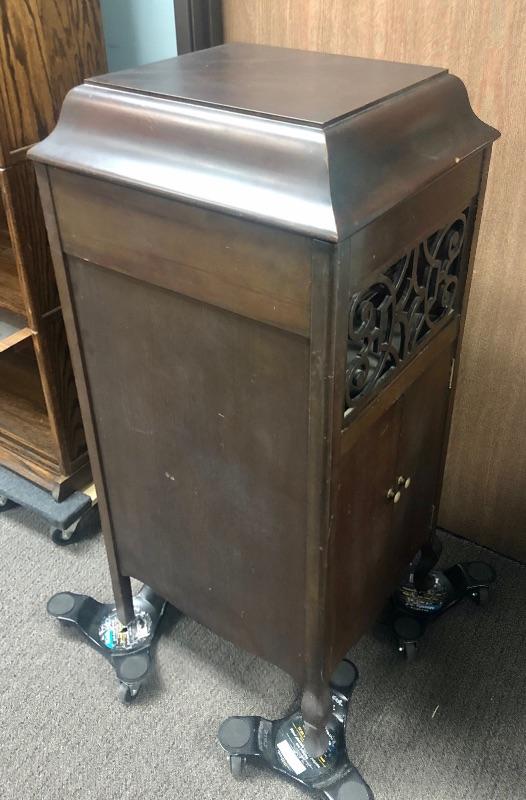 Antique Crank Style Phonograph by Vista Talking Machine Company. Comes with everything pictured. Unsure of working condition. It is 20"x20" and 45" tall. Has signs of age.