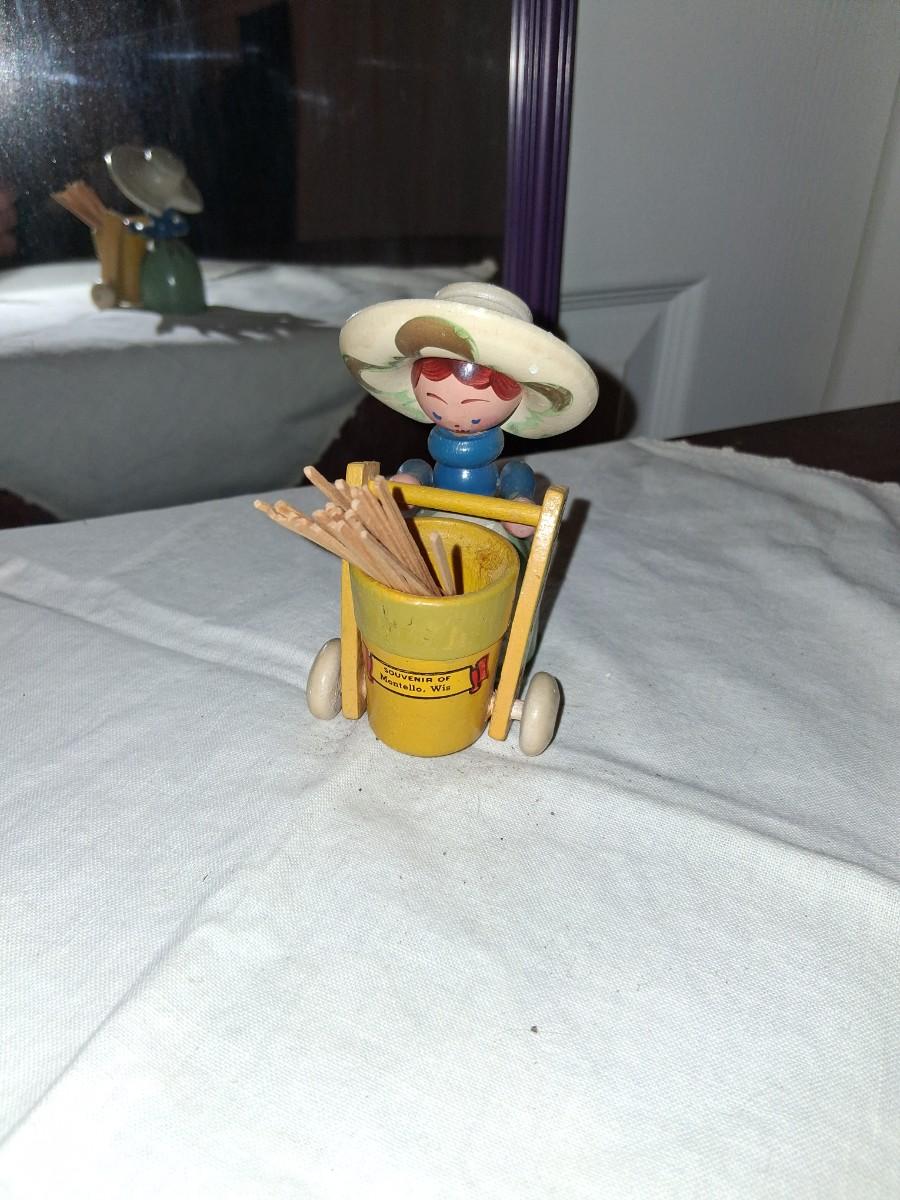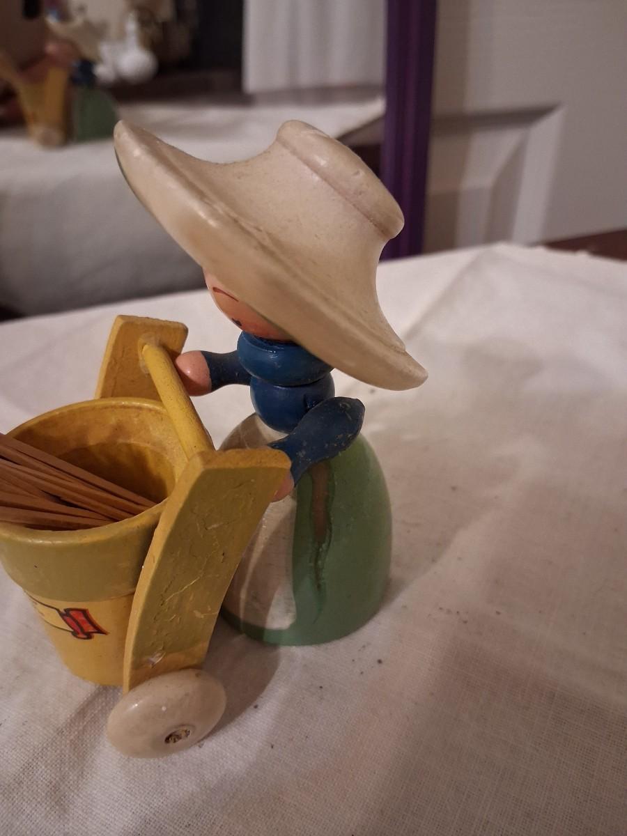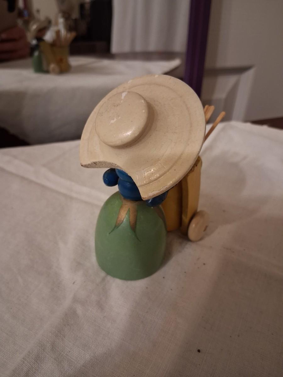 Gorgeous painted Lady with cart with moveable handle. I've always used it for toothpicks.