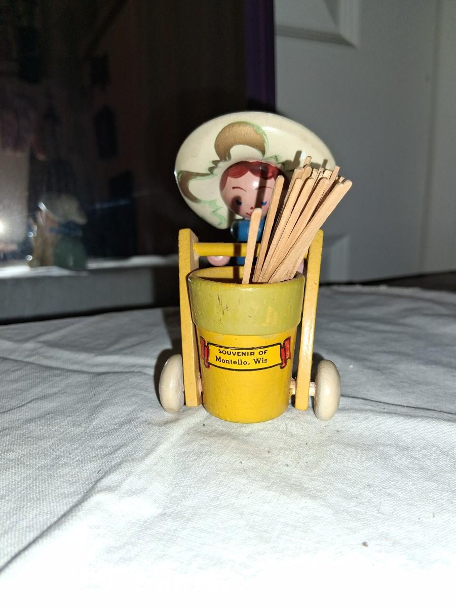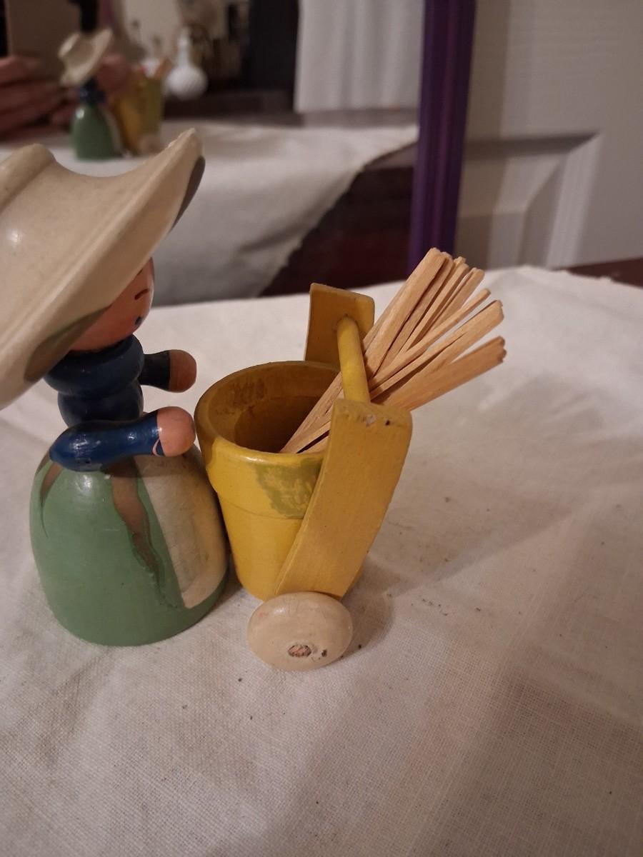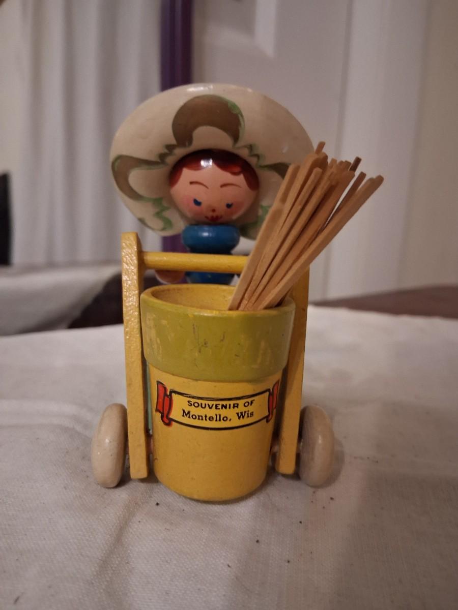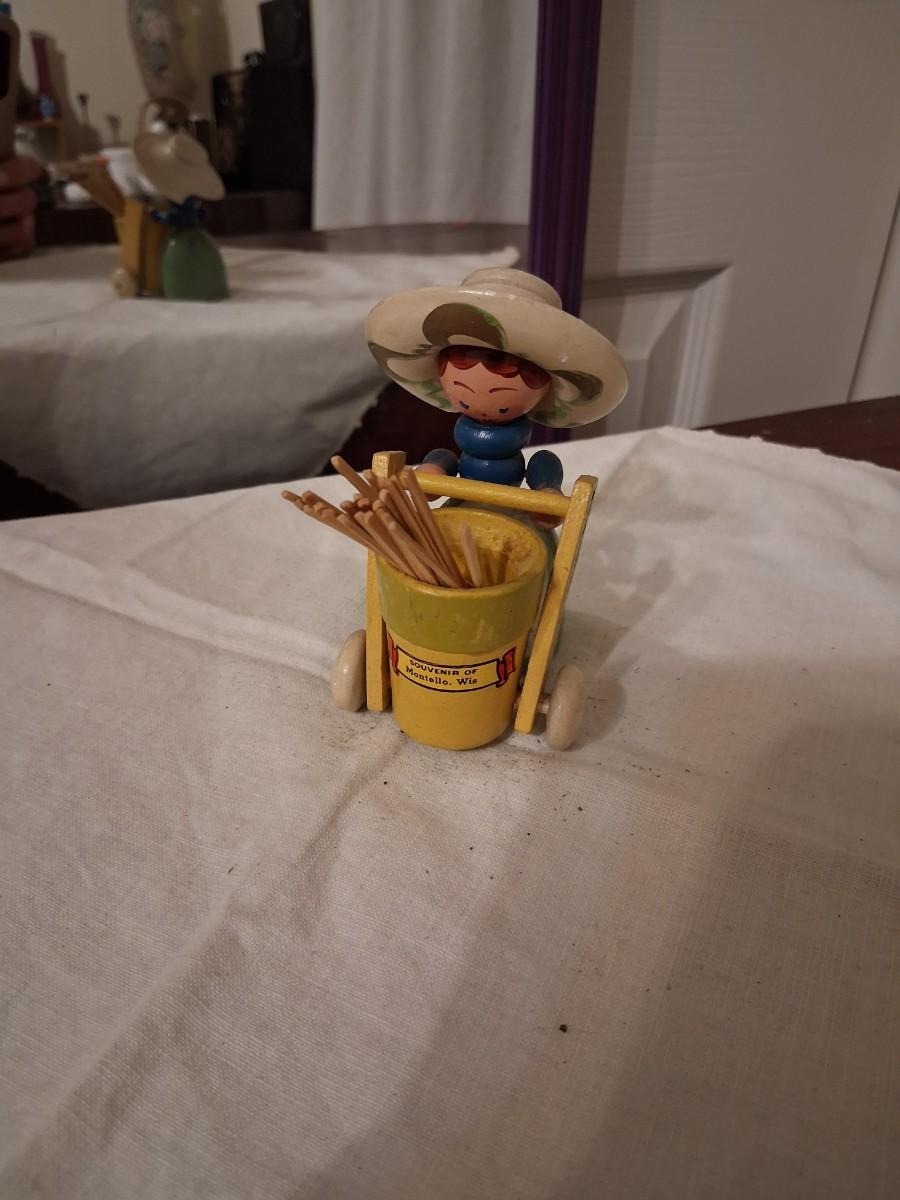 Gorgeous painted Lady with cart with moveable handle. I've always used it for toothpicks.