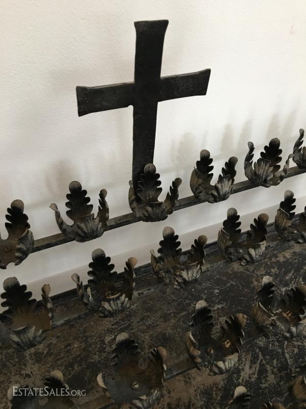 Antique Votive Candle Holder, wrought iron, religious memorabilia. Lot#73. Measures 31" wide, 12" deep and 48" to top of the cross. Made from steel and wrought iron, black and silver paint finish. will hold 36" glass votive candles.