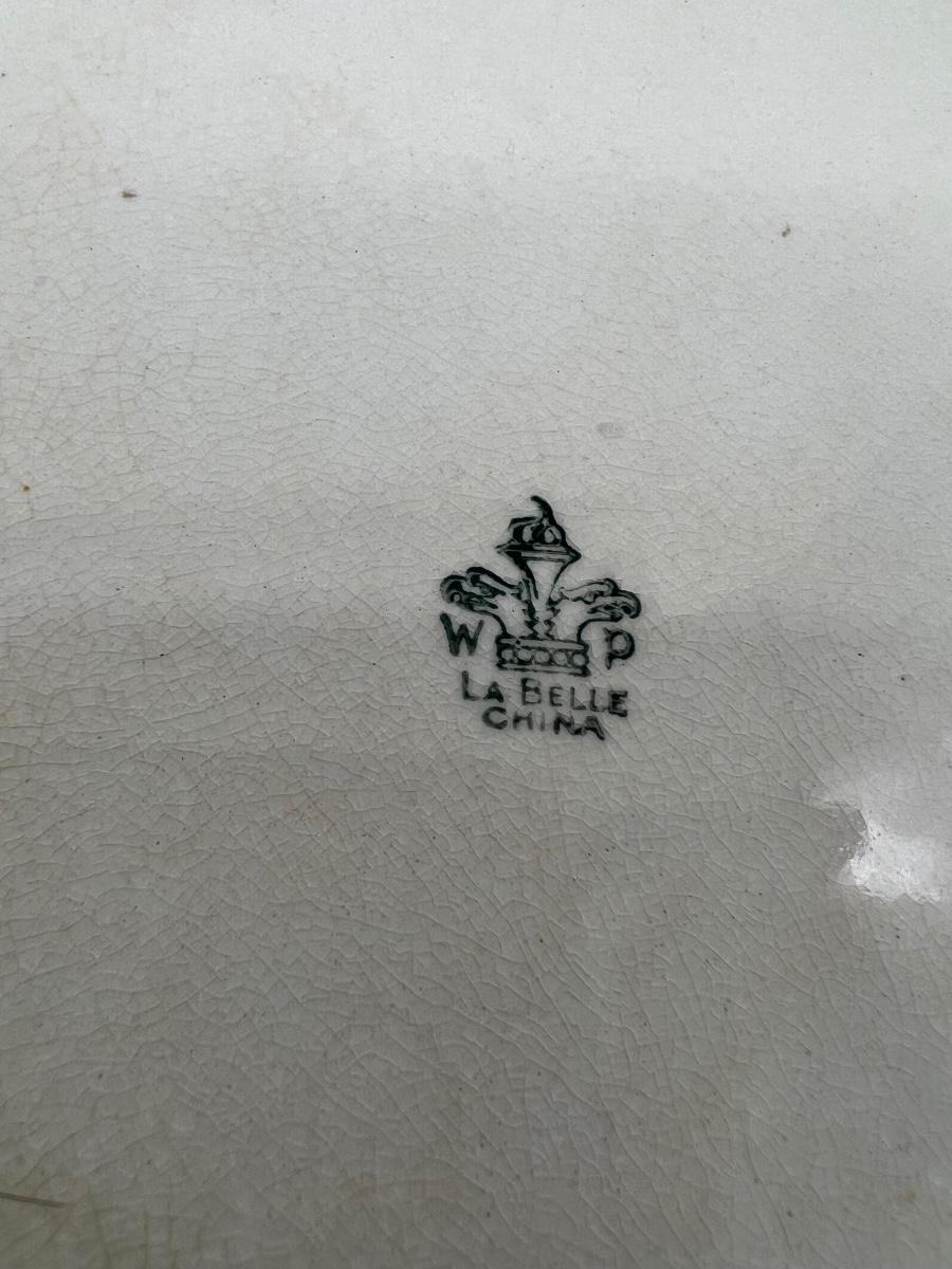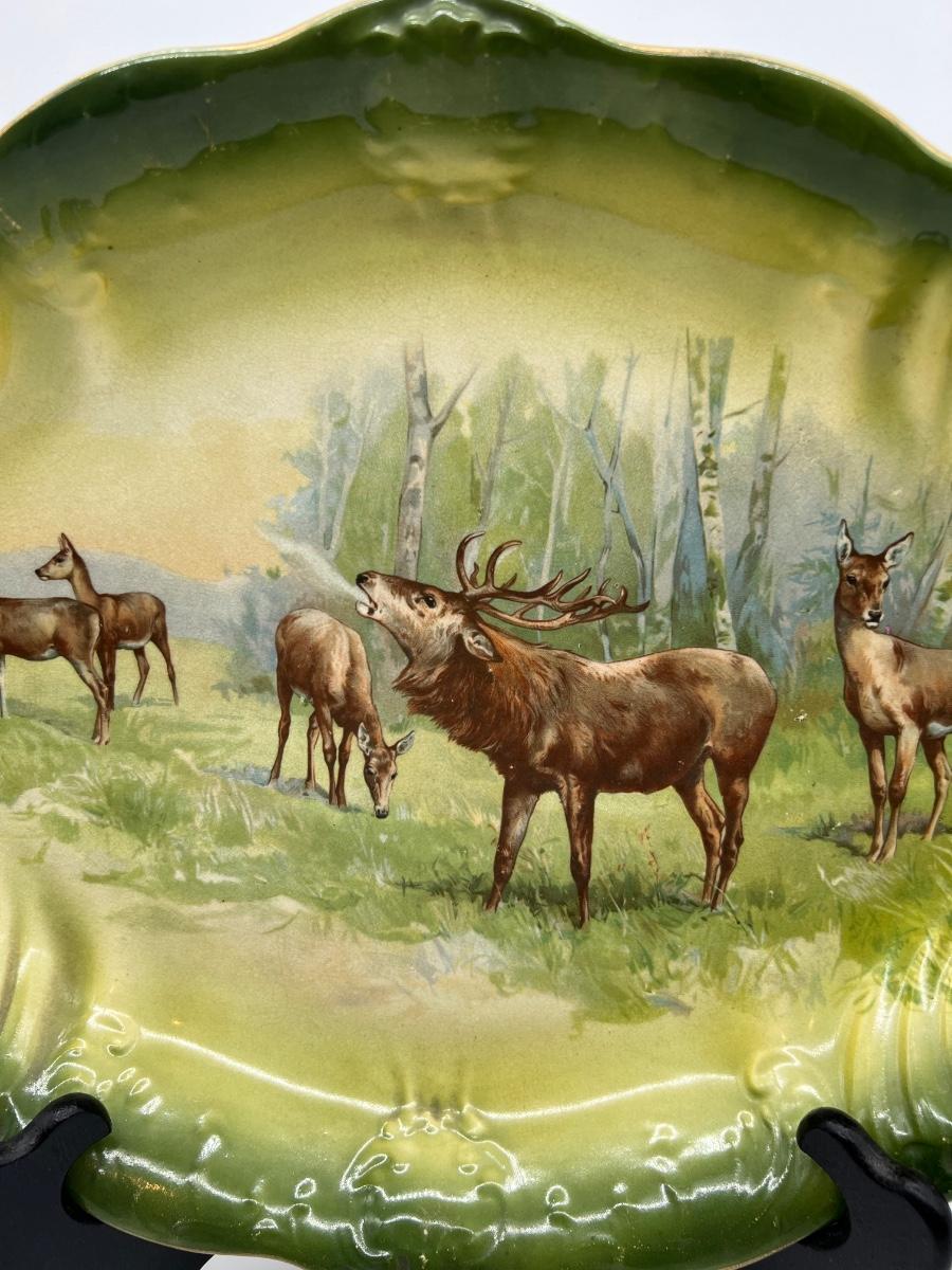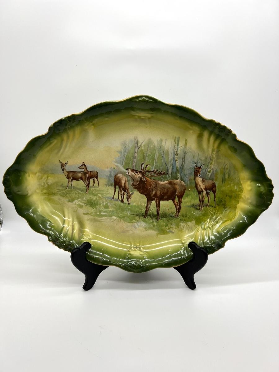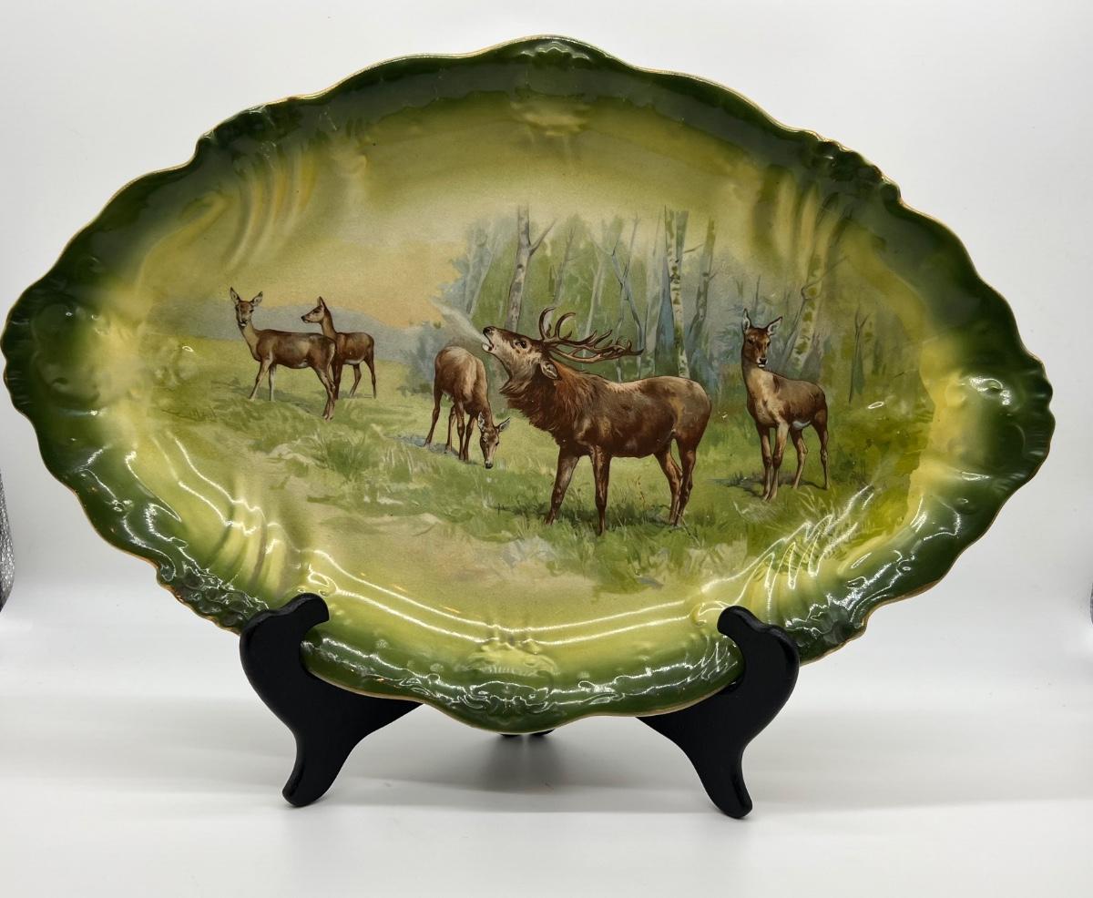 Antique W P La Belle American Porcelain China Elk Woods Pattern Serving Platter Dish with stand. Measures 19 1/2 wide, 13 inches tall and 2 1/2 deep.