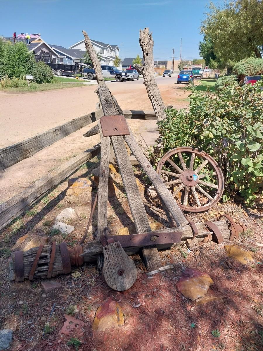 ANTIQUE WAGON AXLE, WHEEL AND A WOODEN PULLEY