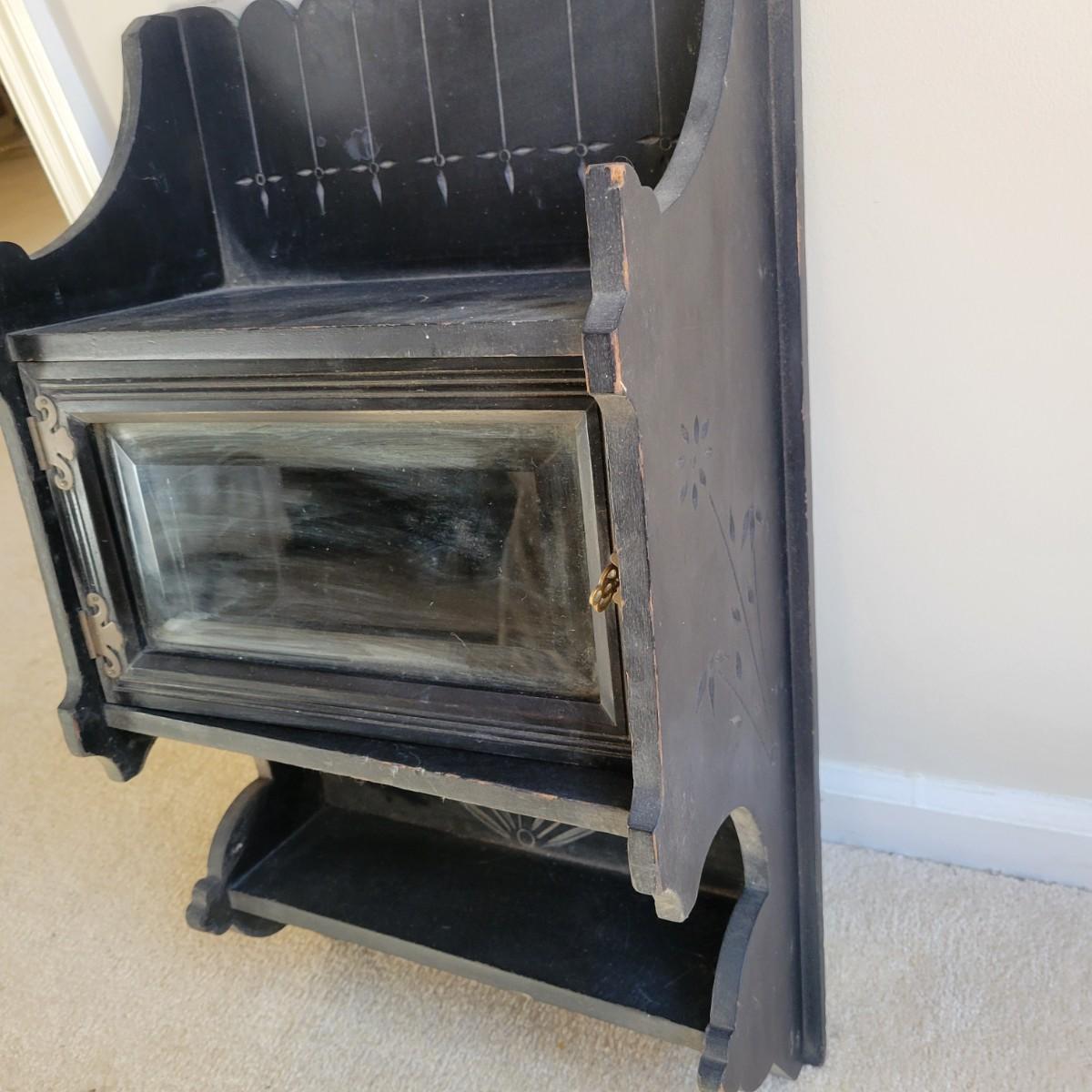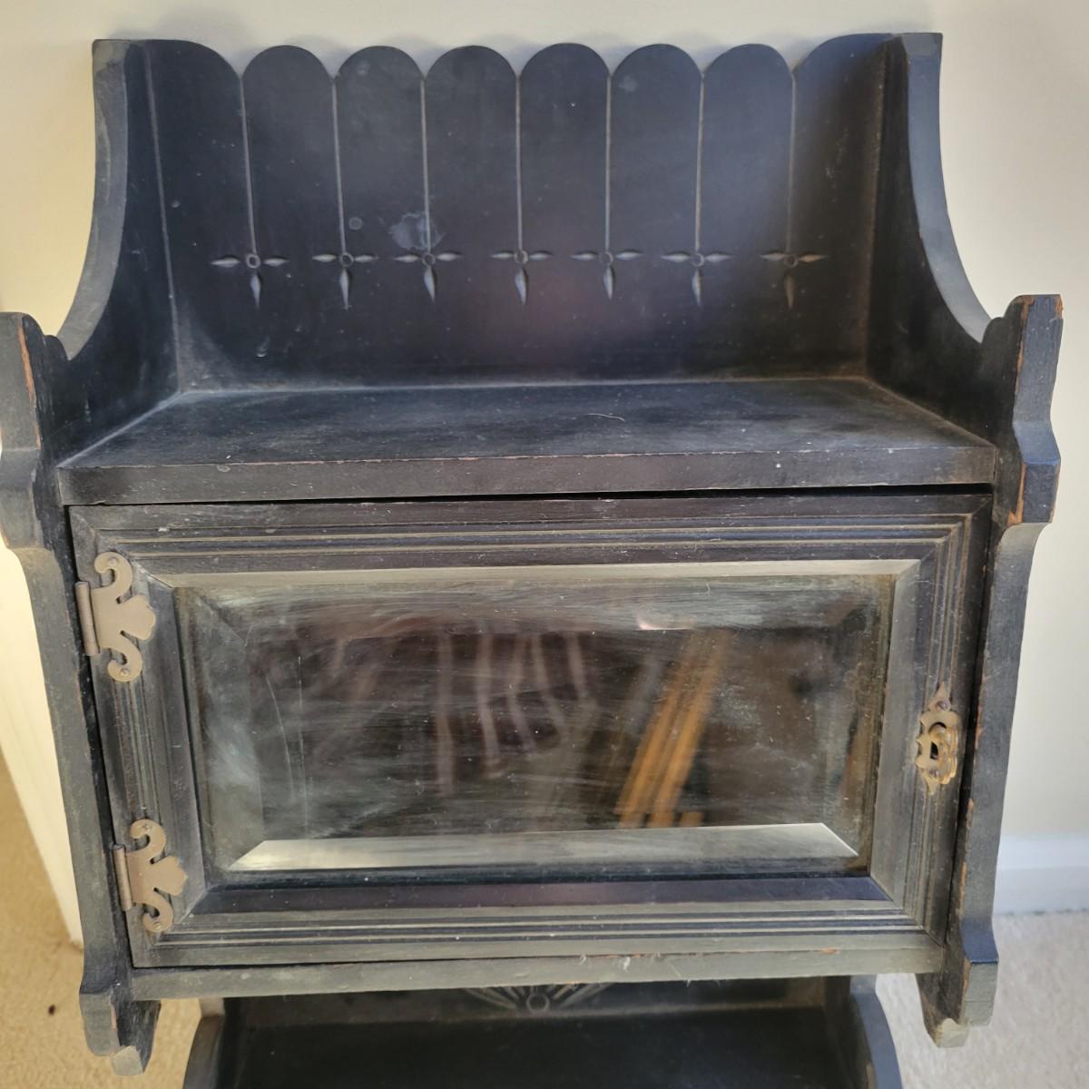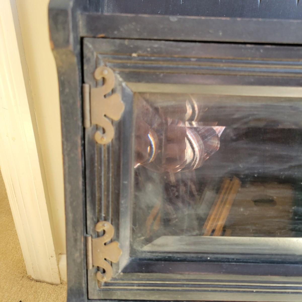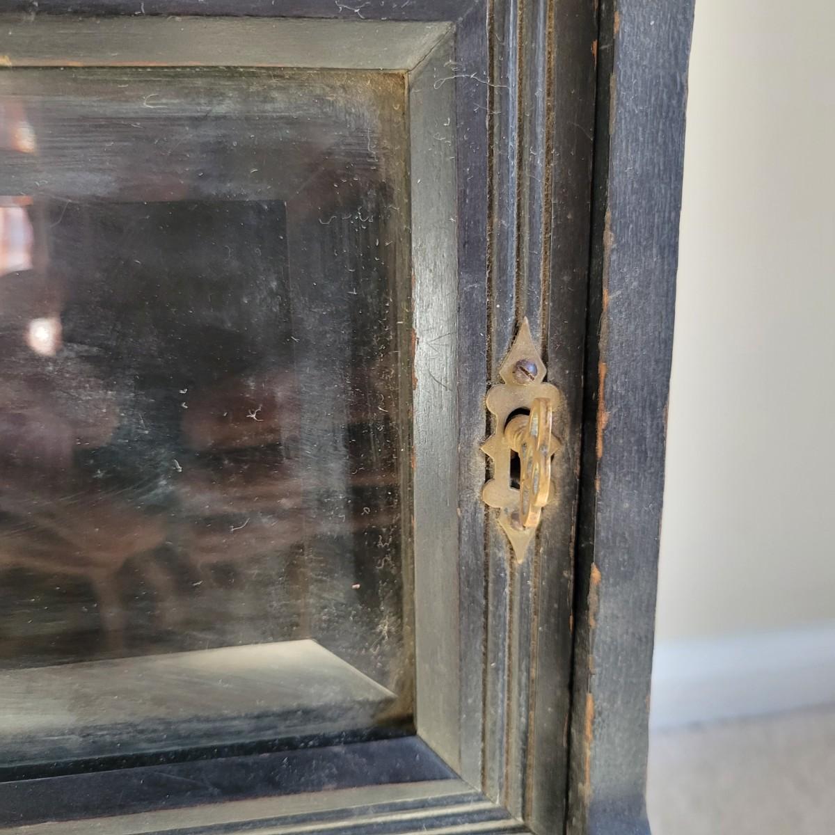 An antique wall cabinet/display case in good condition, although it appears that this piece was being stripped to refinish. This cabinet is solid wood with a black stain and features brass hardware, two shelves and a glass faced door for the cabinet. Glass could use a good cleaning, but is intact. Measures approximately 13" x 7" x 23". Shipping available. Shipping can be costly. We suggest calling our local UPS with dimensions and getting an estimate