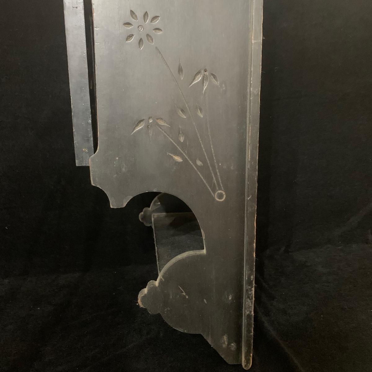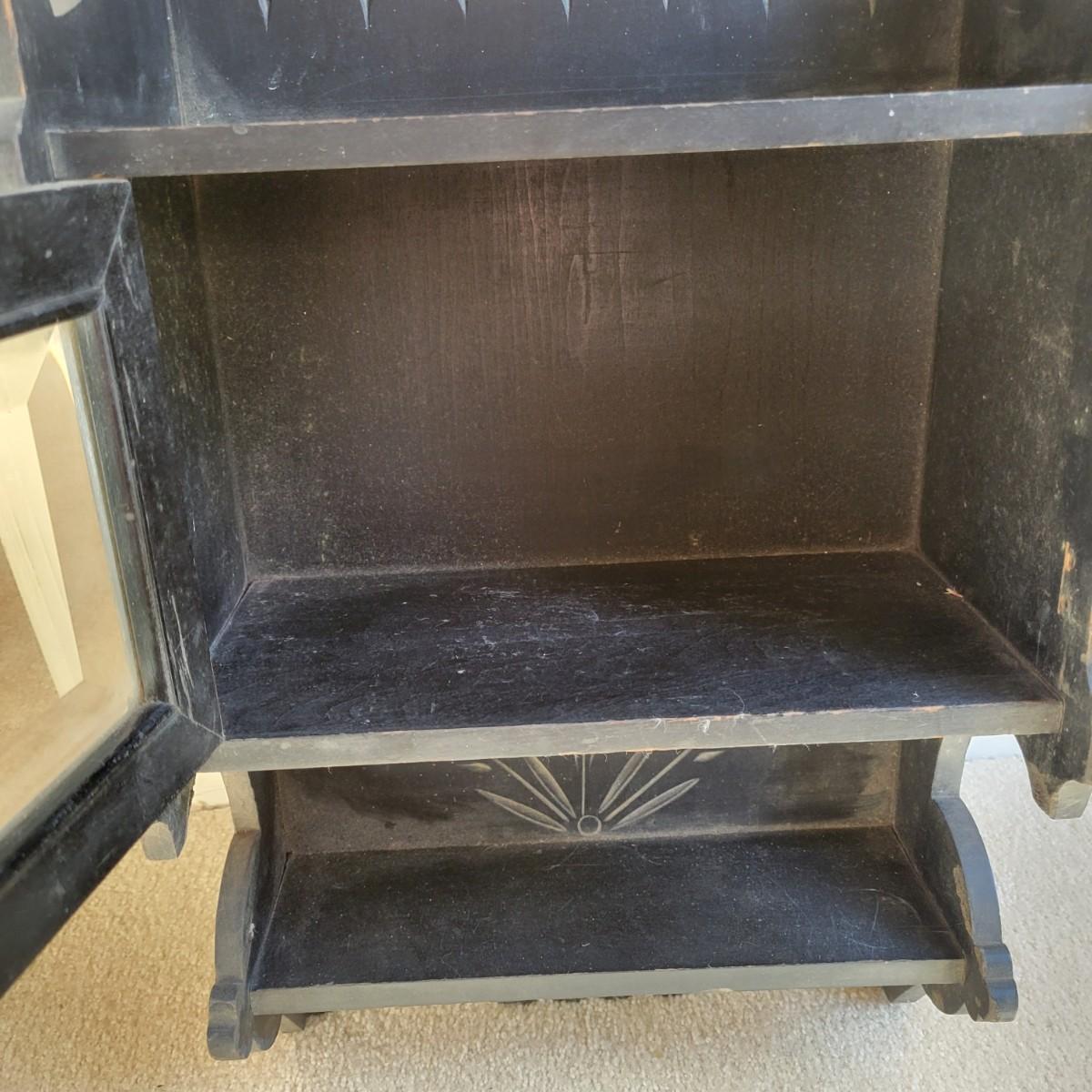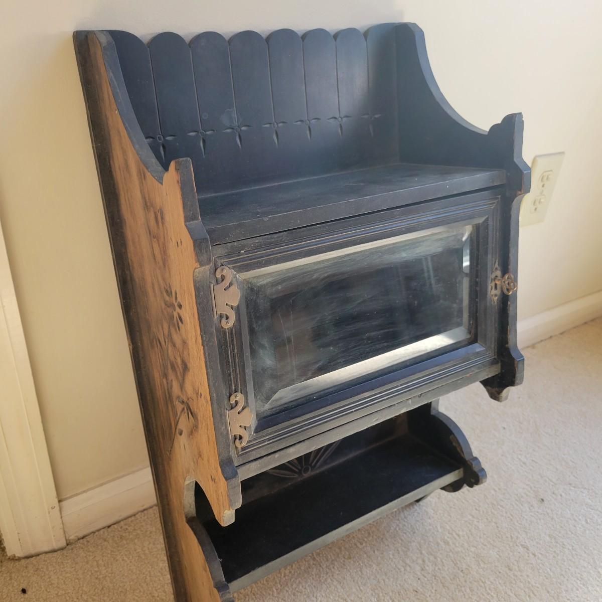 An antique wall cabinet/display case in good condition, although it appears that this piece was being stripped to refinish. This cabinet is solid wood with a black stain and features brass hardware, two shelves and a glass faced door for the cabinet. Glass could use a good cleaning, but is intact. Measures approximately 13" x 7" x 23". Shipping available. Shipping can be costly. We suggest calling our local UPS with dimensions and getting an estimate