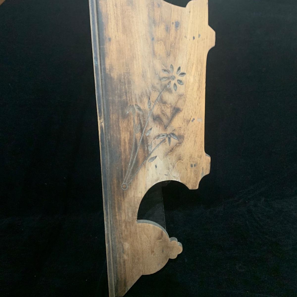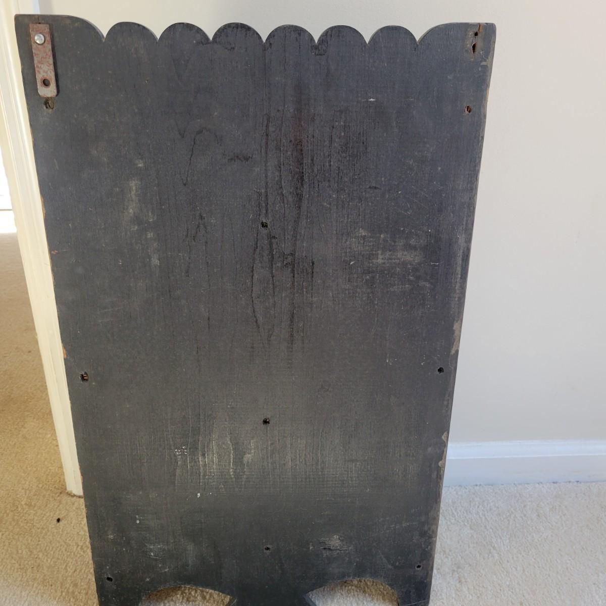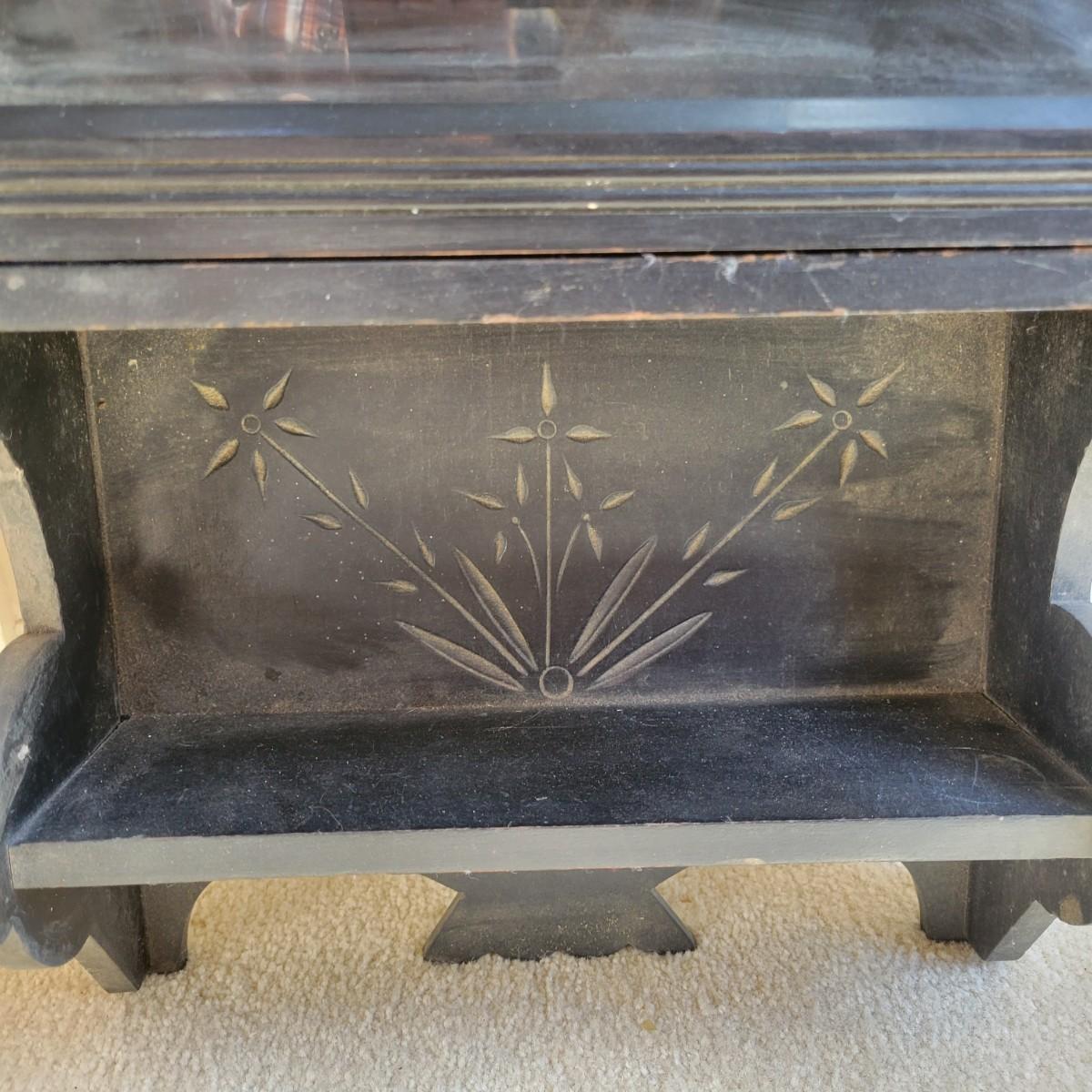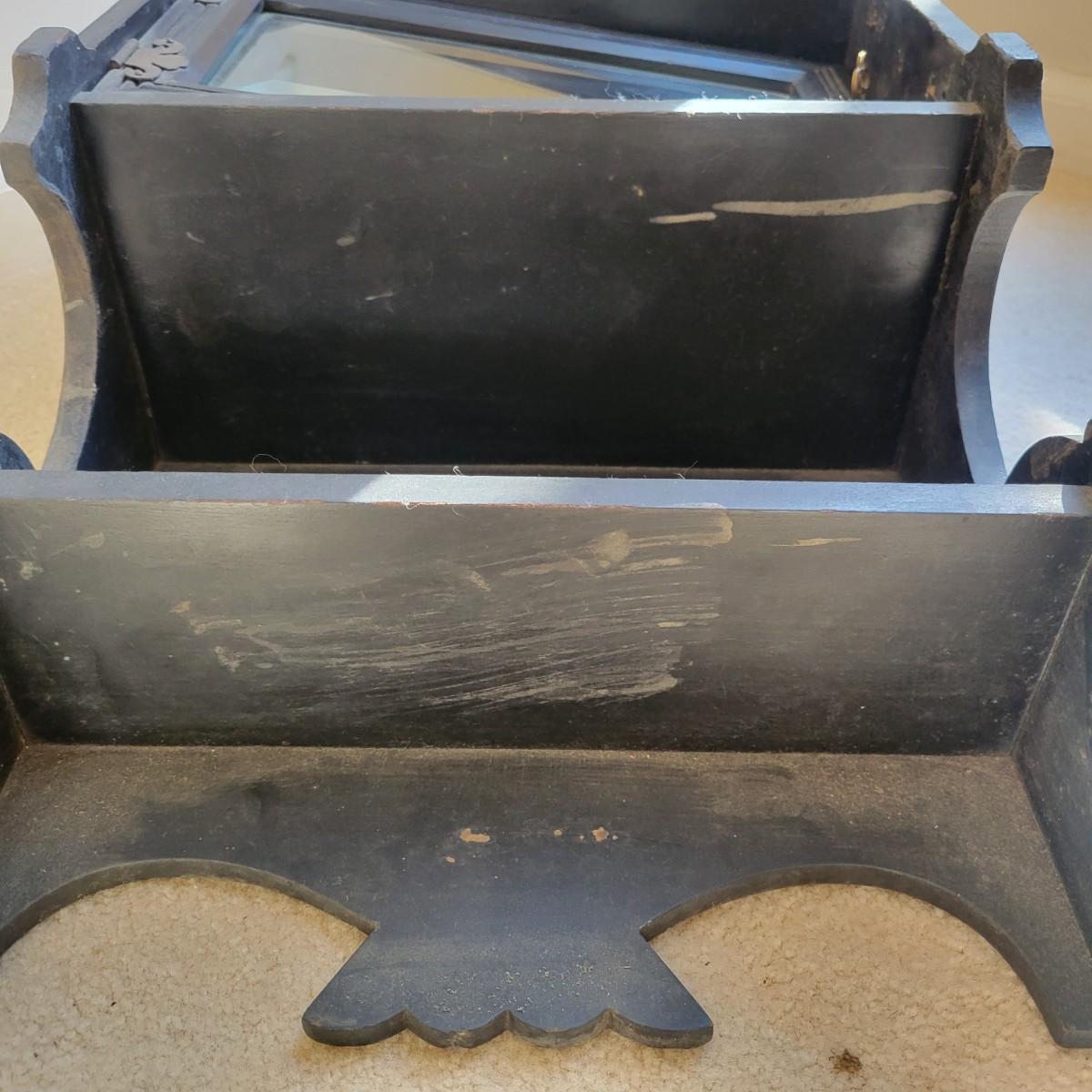 An antique wall cabinet/display case in good condition, although it appears that this piece was being stripped to refinish. This cabinet is solid wood with a black stain and features brass hardware, two shelves and a glass faced door for the cabinet. Glass could use a good cleaning, but is intact. Measures approximately 13" x 7" x 23". Shipping available. Shipping can be costly. We suggest calling our local UPS with dimensions and getting an estimate