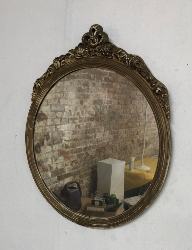 Here is a round antique wall mirror with an ornate border...Good condition...17" diameter...