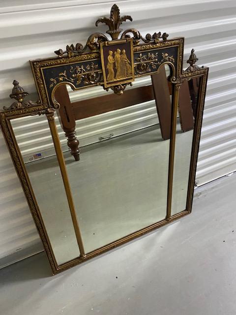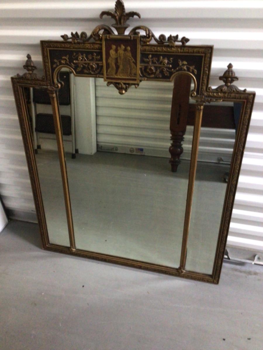 Fleur de lis crest. 34” w x 43”h. Gilt and ebonized wood frame. This is a heavy item. It is in a wooden crate for protection during transport. You must bring help to move this item into your vehicle. Local delivery may be able available at cost to the buyer. If you need an item to be delivered then please coordinate with us once you have purchased the item. Pick Up of Purchased Items will be on Saturday the 16th at Morningstar Storage in Bluffton, SC. 1110 Fording Island Rd, Bluffton, SC 29910. At the end of the sale todayI will send out a SignUpGenius link to the winning bidder to schedule your your pick up time along with a contact phone number.