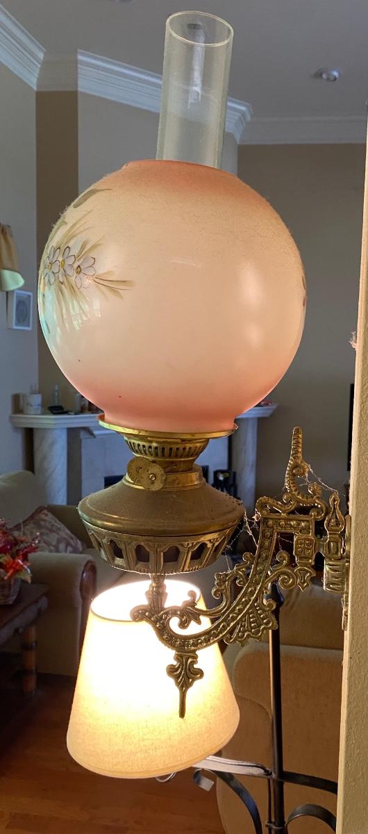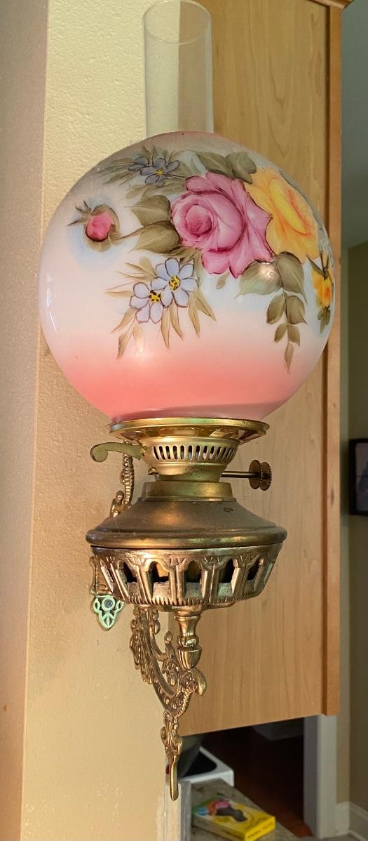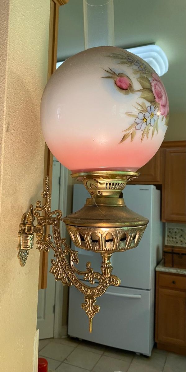 Antique wall-mounted oil lamp, pink floral globe. Excellent. 22h. Globe is 8” dia.