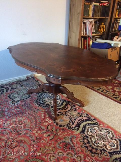 Antique walnut pedestal dining table. English oval dining table, overlaid on wood, pedestal table base with hand carved design. Solid ... more
