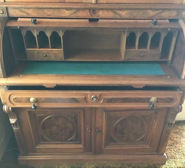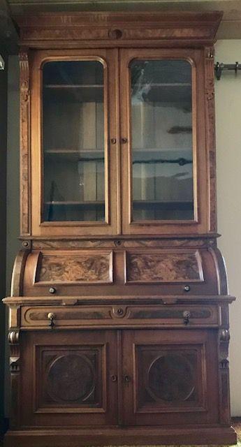 Antique Walnut Victorian Cylinder Roll Secretary with Bookcase Top