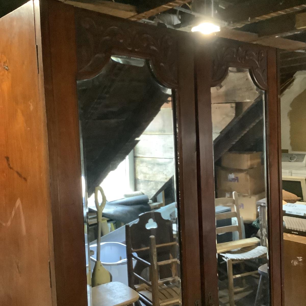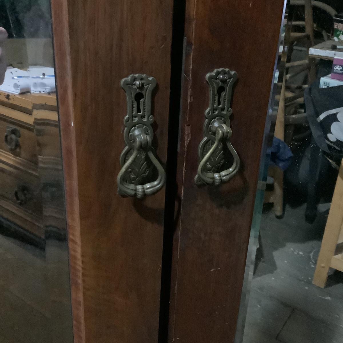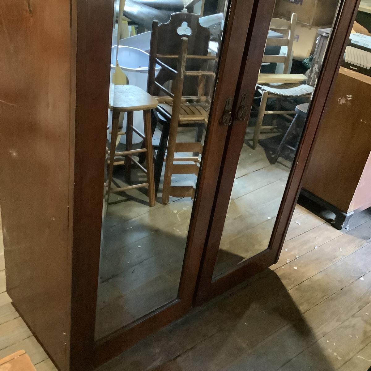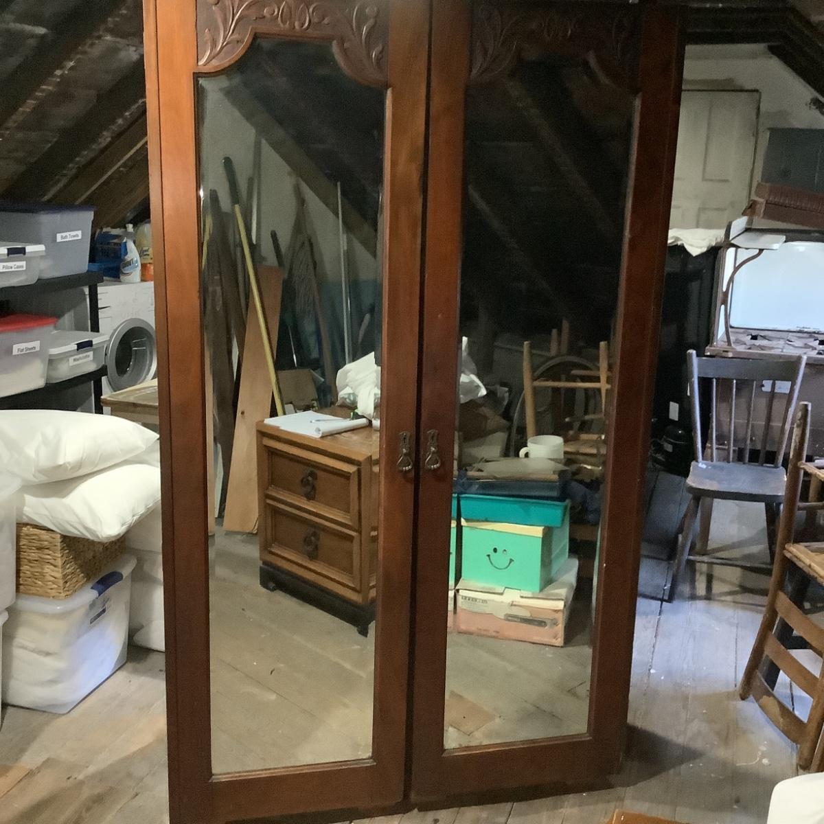 Antique wardrobe with beveled mirrored doors, real wood on the back, ornate, hooks, key holes