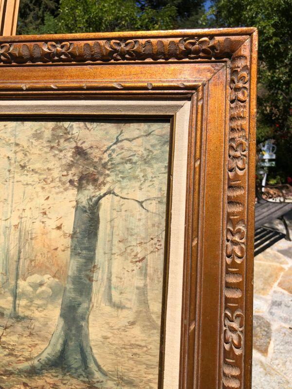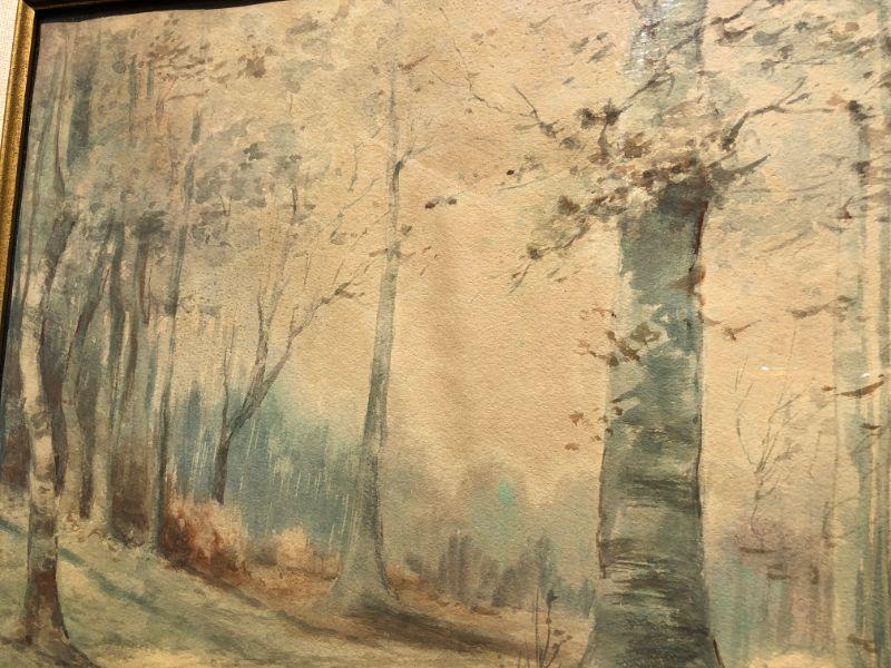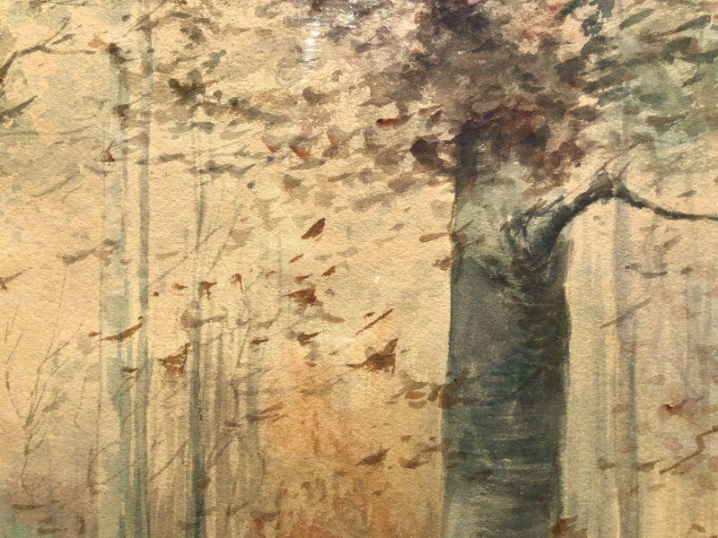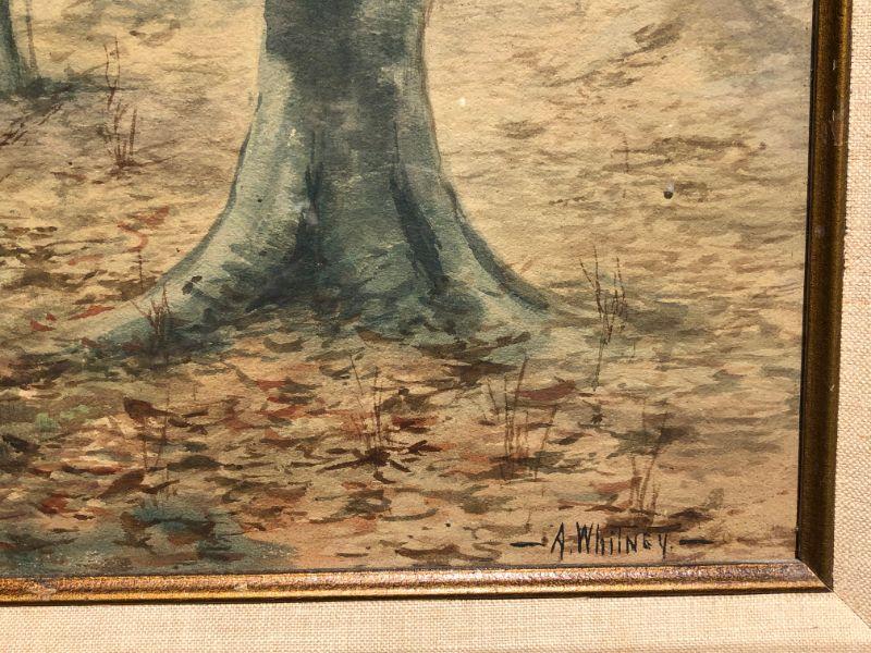 Antique watercolor painting of a forest trail in the woods. Signed A. Whitney. In good condition, with signs of color fading in the painting.