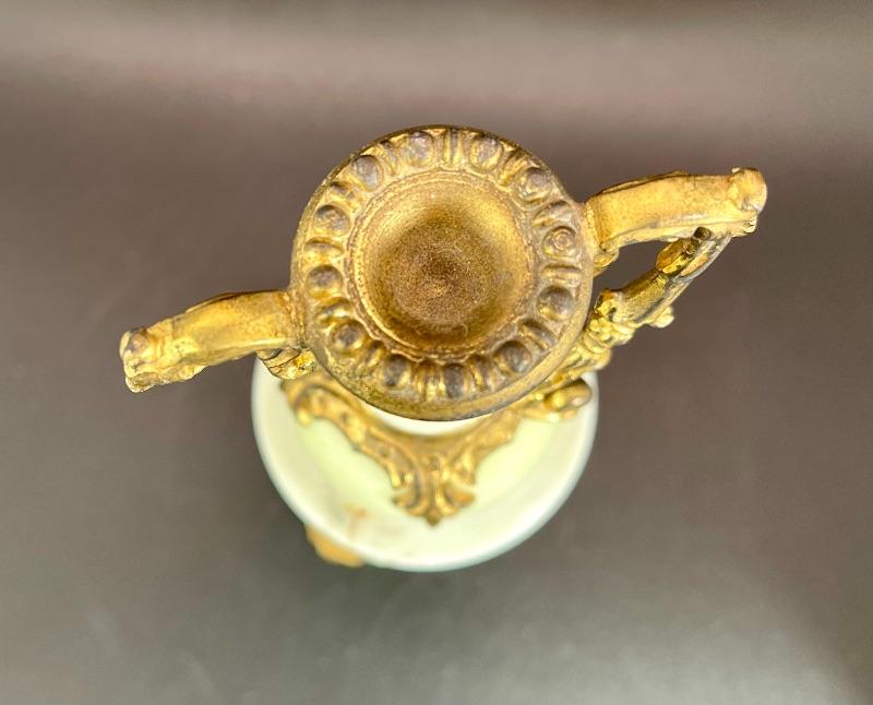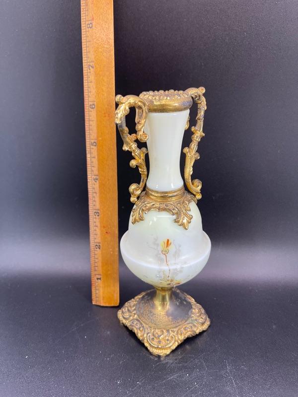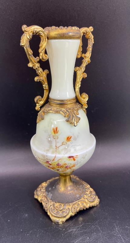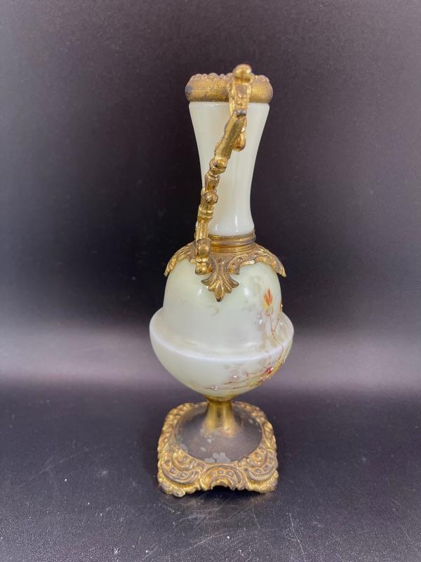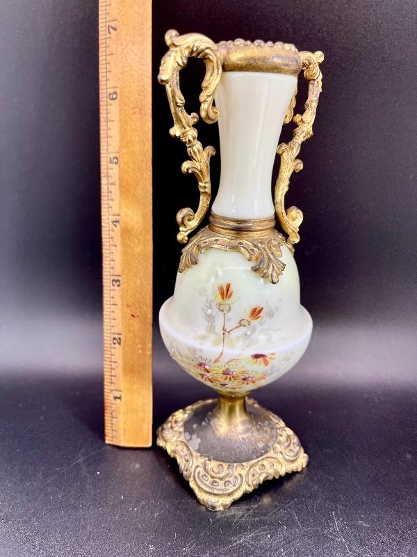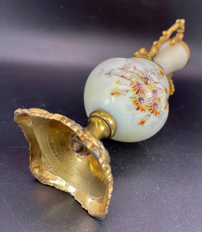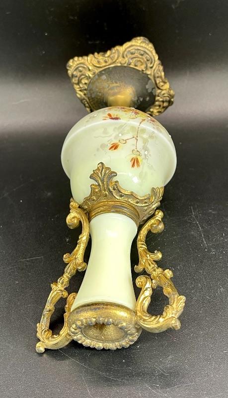 Antique Wave Crest art glass vase. Interesting art nouveau Victorian style satin glass piece. double handle pedestal ormolu with painted flowers. More like a candle holder as the opening at top is shallow. Beautiful piece, displays lovely. About 6.5" tall. #24-20008