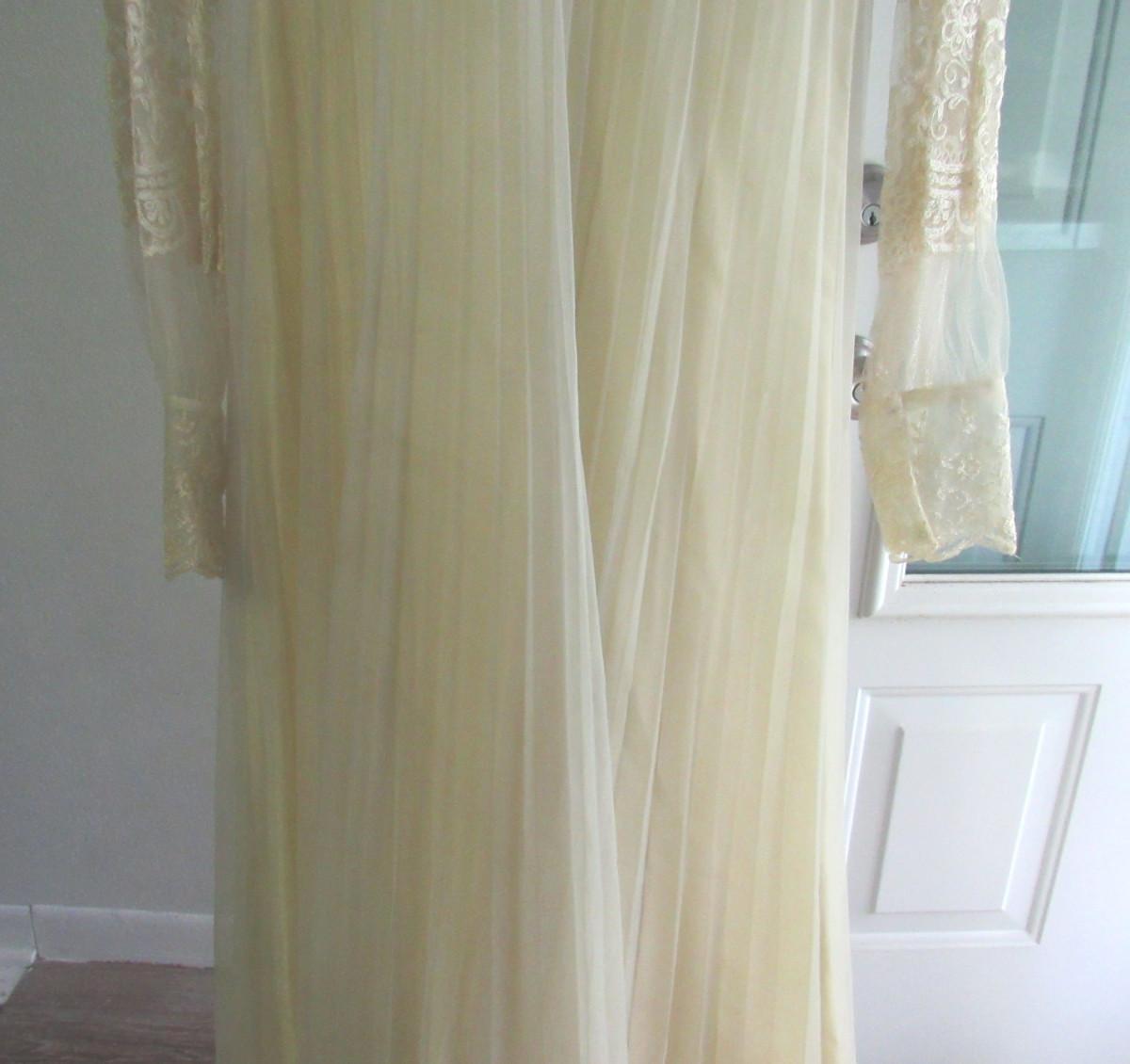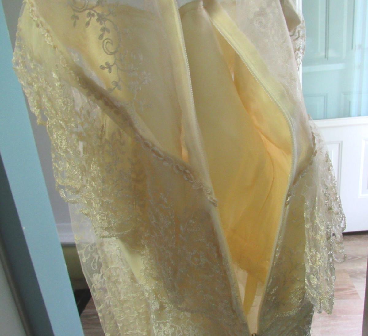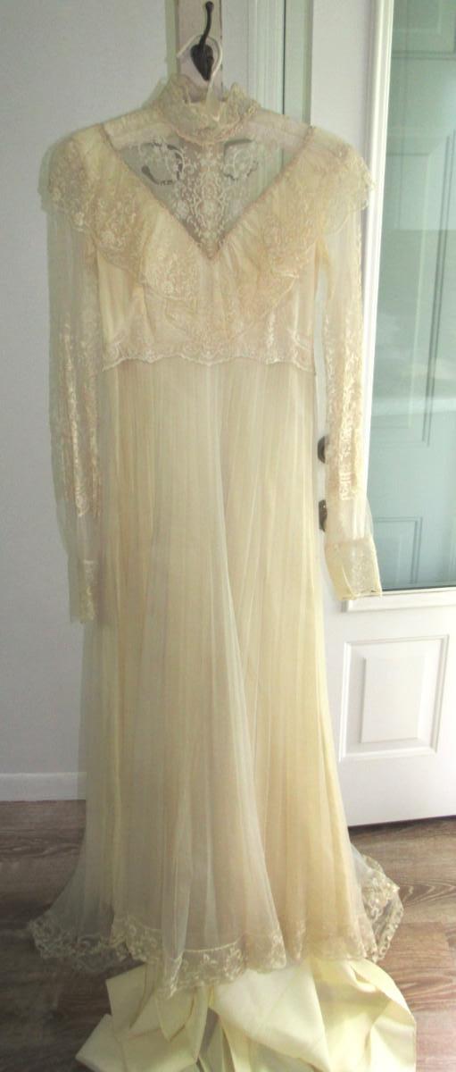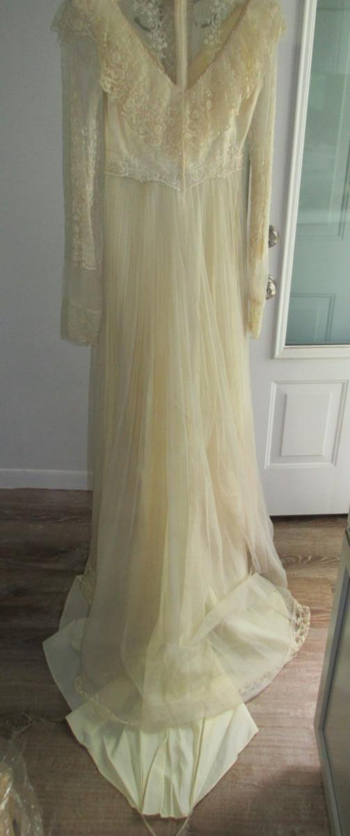 Long sleeve, snaps at cuffs. Back zipper is good. Arms and bodice lace nice, didn't see any obvious damage. Good skirt and overskirt, nice train. No labels, size unknown but very small. Lots of fabric to repurpose!!! Shipping available at shipping cost plus $5.00 per box handling fee. No returns or refunds. See our terms for details.