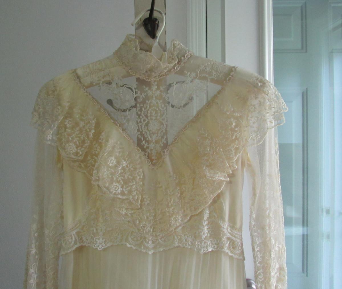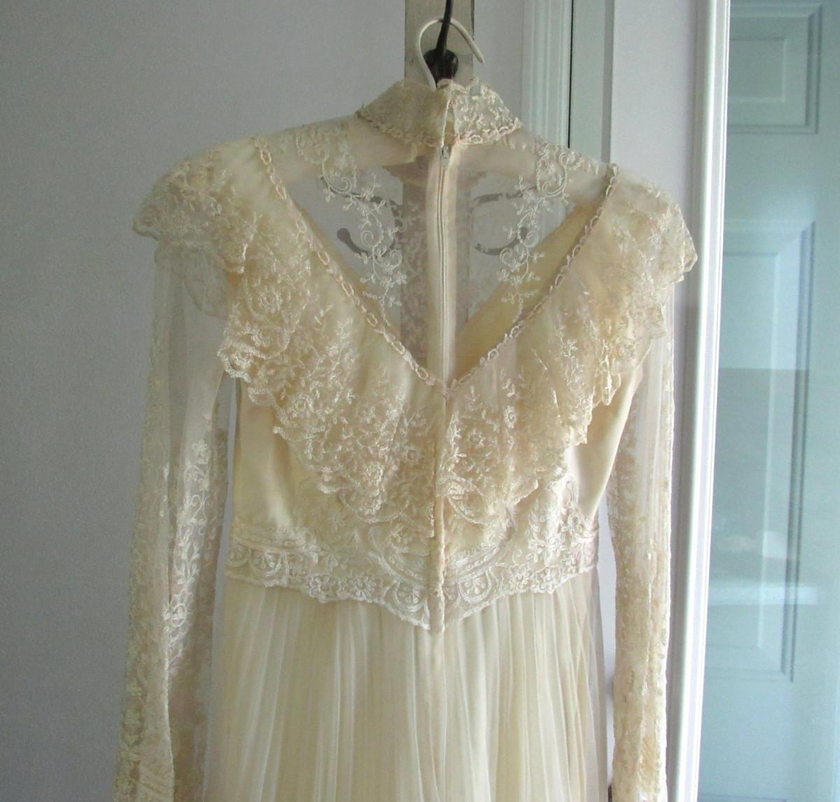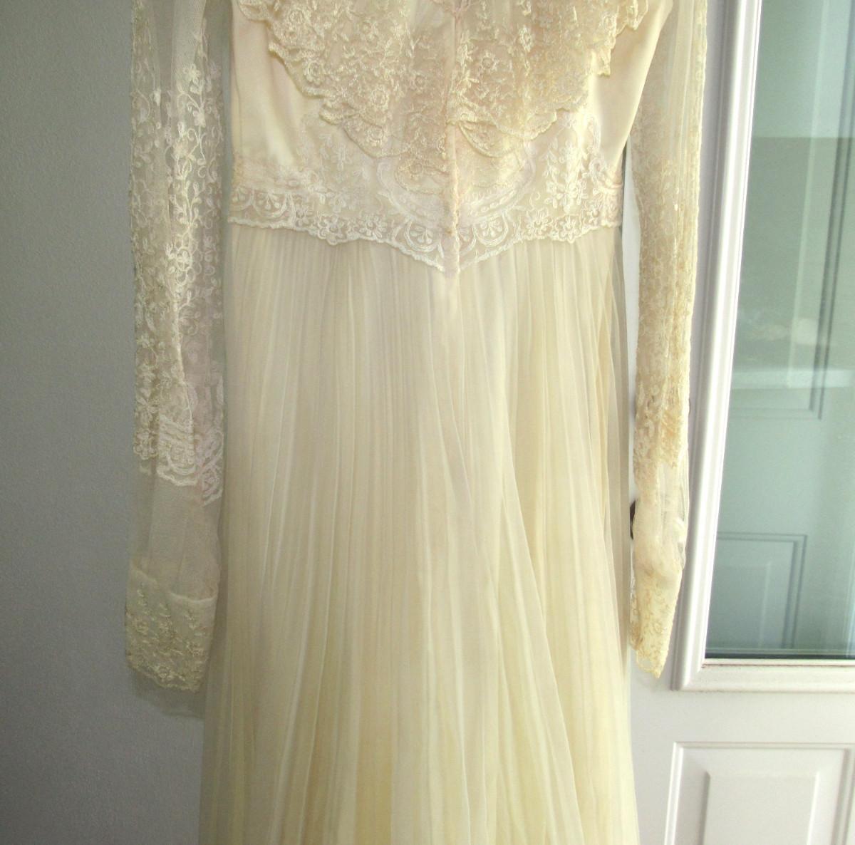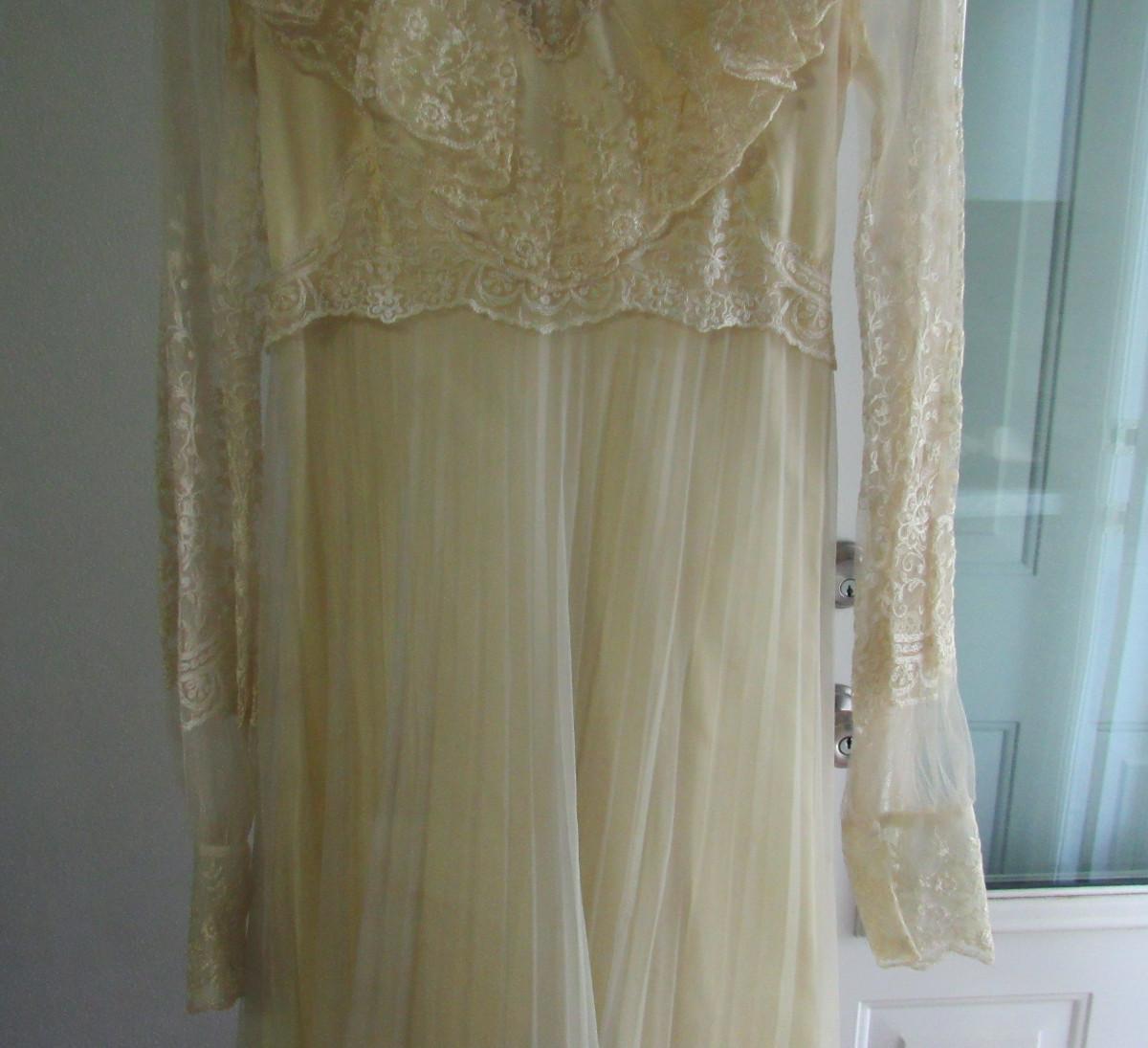 Long sleeve, snaps at cuffs. Back zipper is good. Arms and bodice lace nice, didn't see any obvious damage. Good skirt and overskirt, nice train. No labels, size unknown but very small. Lots of fabric to repurpose!!! Shipping available at shipping cost plus $5.00 per box handling fee. No returns or refunds. See our terms for details.