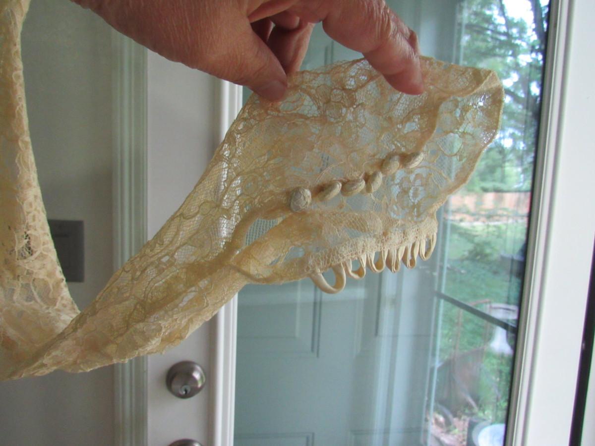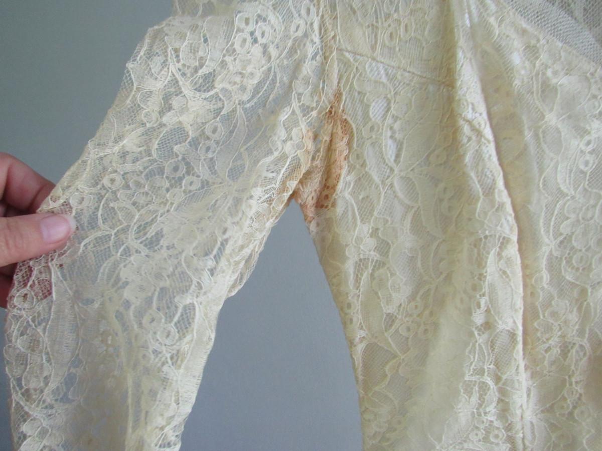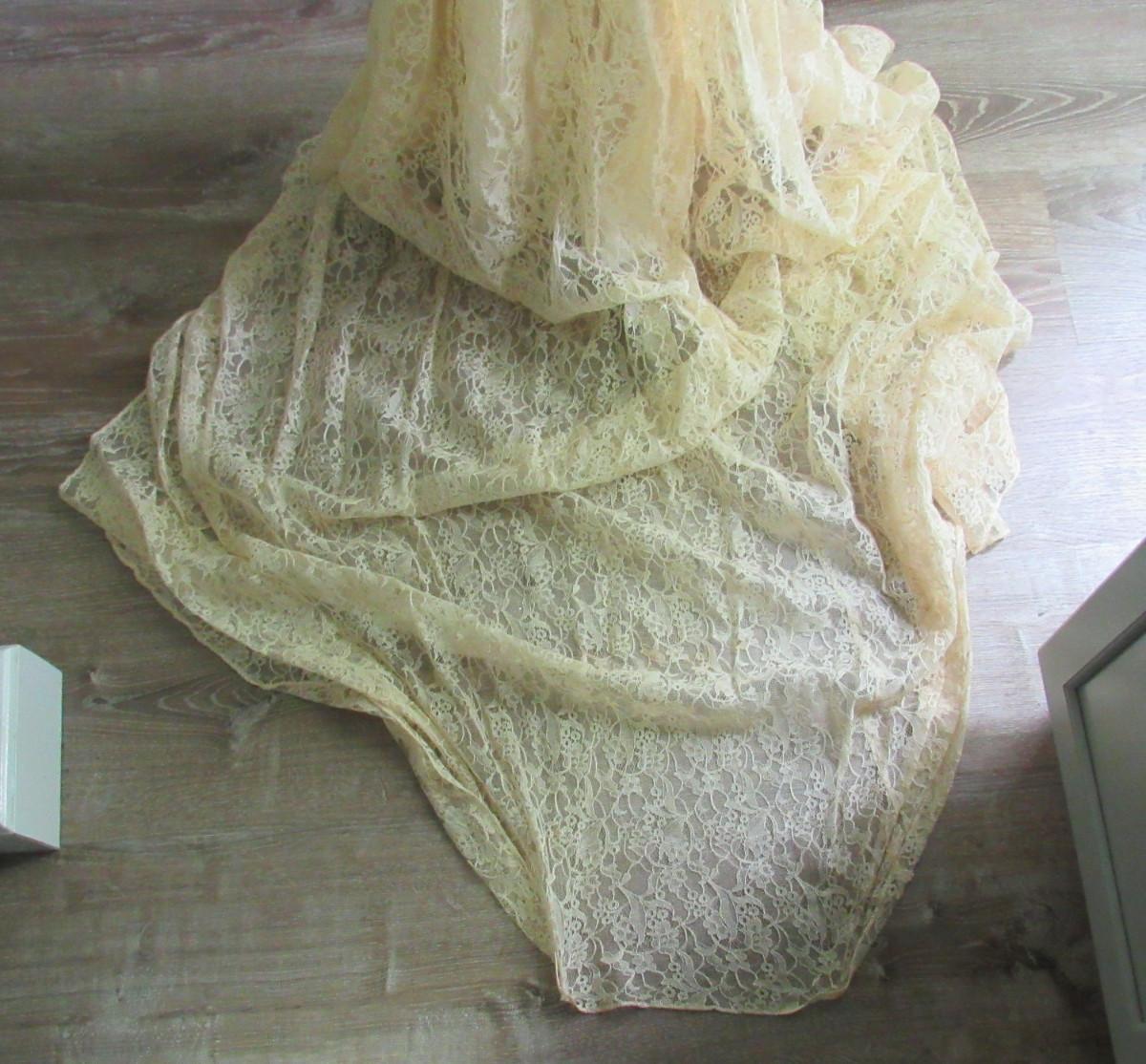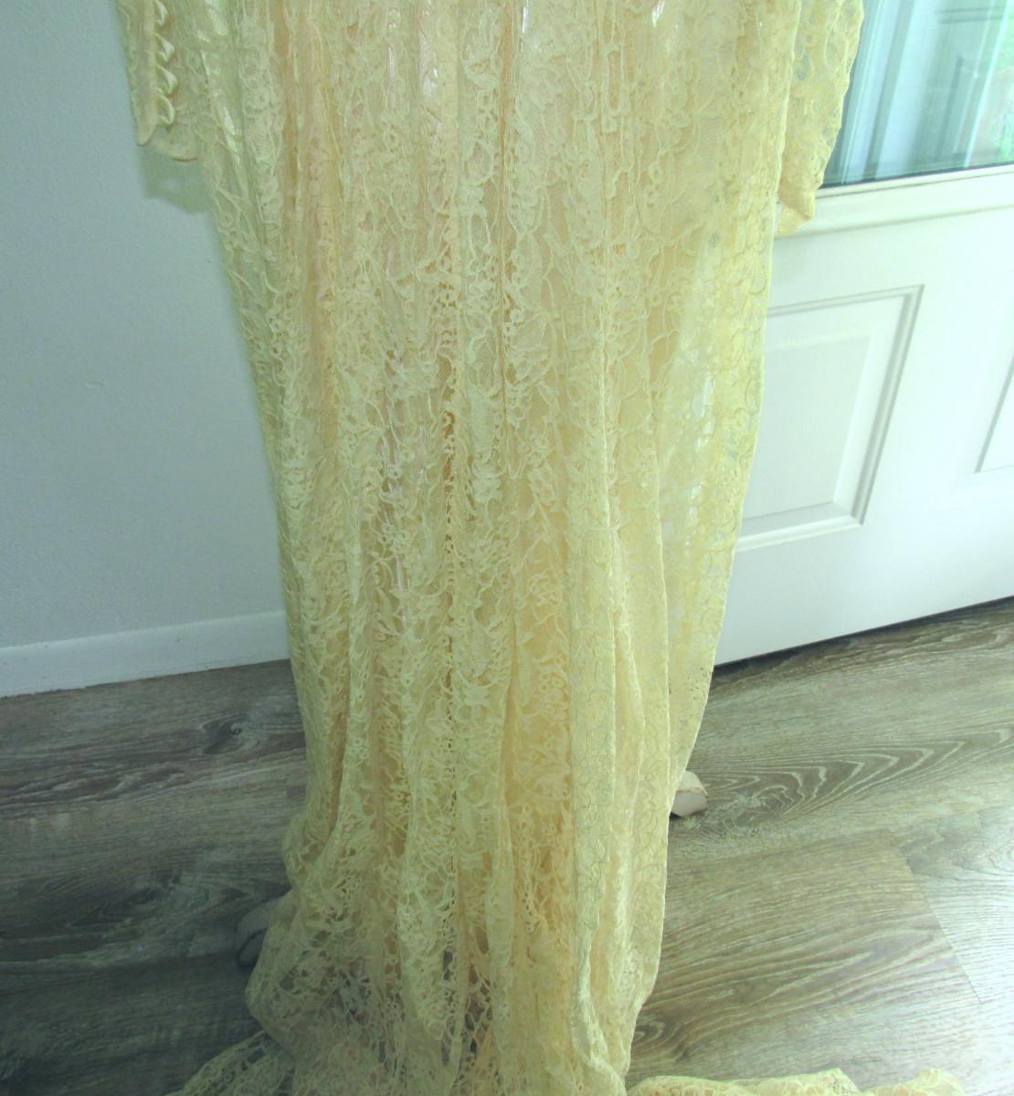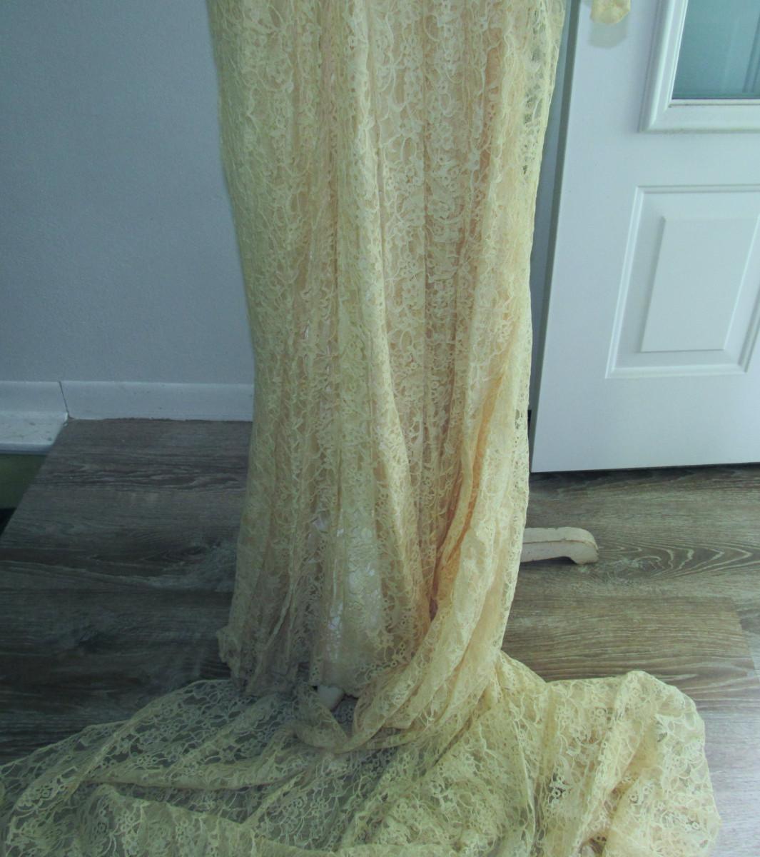 No labels, size unknown, but it is small. Nice train. Some holes in the mesh fabric short collar. Sleeves look good, all buttons/loops. Side zipper good. Unfortunately it has stains in arm pits. Tons of skirt lace, looks good, didn't see any obvious holes. Hemline is dirty. Underskirt looks good, I see one small stain. Overall intact and pretty, so much lace, would be great for repurposing on a new dress! Shipping available at shipping cost plus $5.00 per box handling fee. No returns or refunds. See our terms for details.