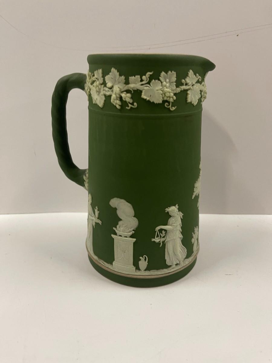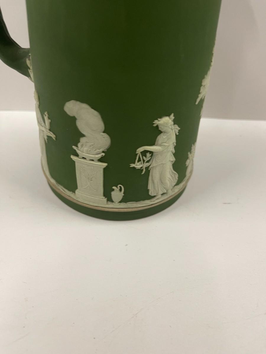 Antique Wedgwood Sage Green Jasperware Pitcher. Appears to be in very good condition with no chips, cracks or repairs. Please examine photos carefully. Approx 6 1/4" high. Marked Wedgwood England on the bottom.