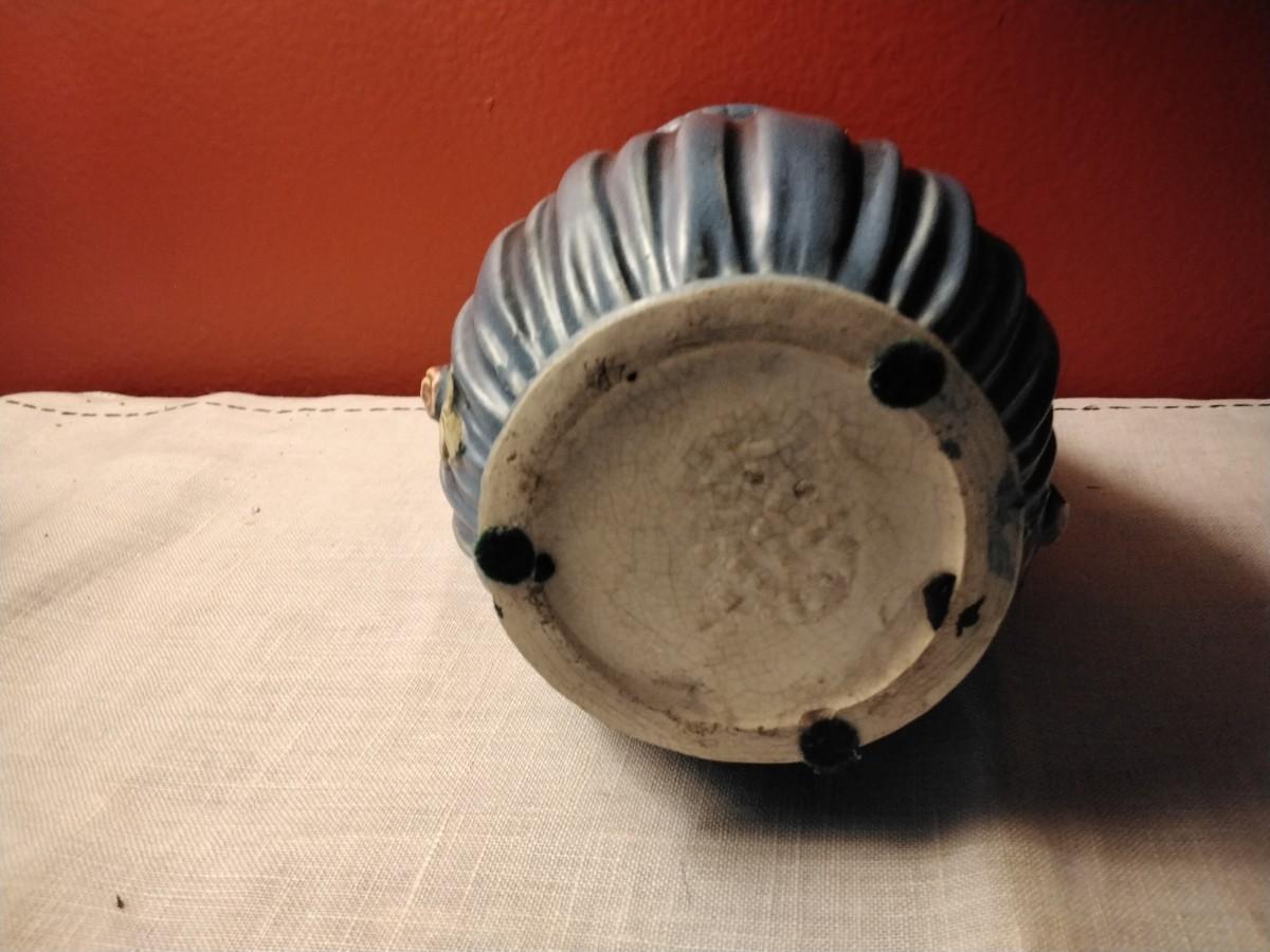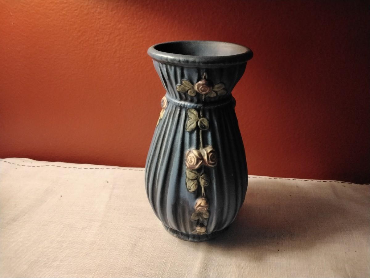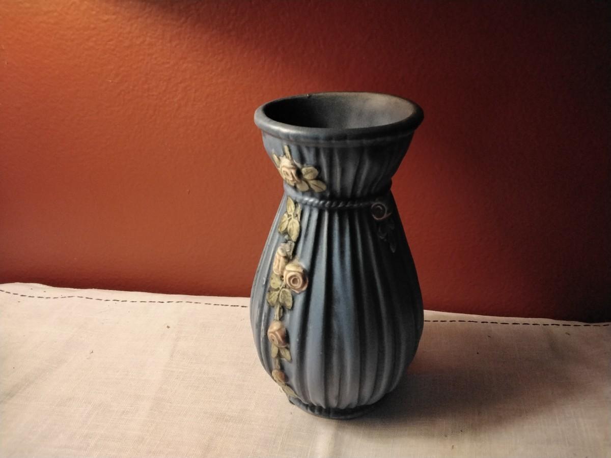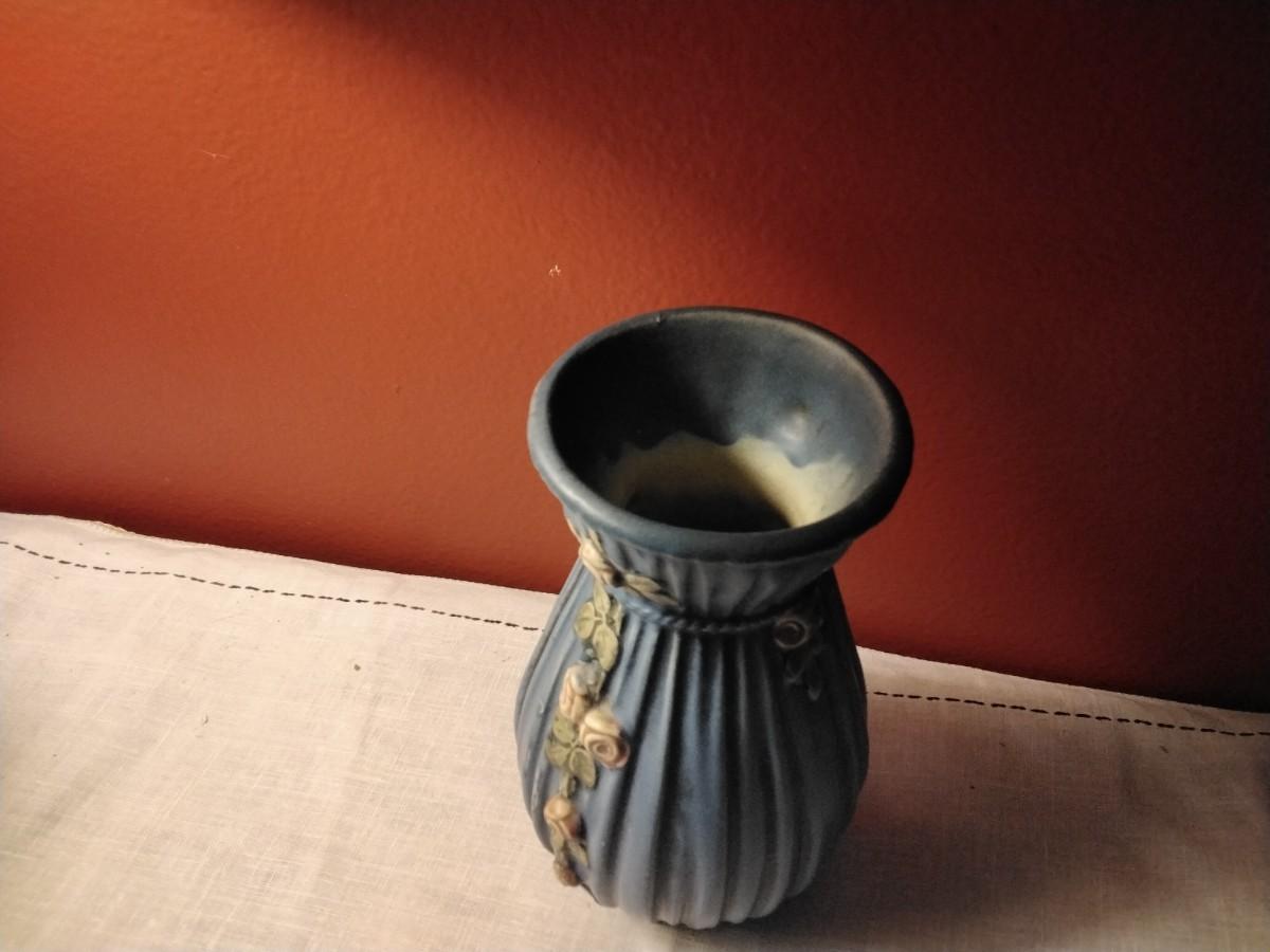Beautiful antique vase from Weller Pottery dating from 1900-1925 in the Art Nouveau style. Featuring a 'drape' or 'gathered' effect around the entire piece, with decorative pink roses, green vines and leaves running down the center of the piece. It also features a matte blue glaze which edges into the gray blue spectrum in certain light. Incised 'WELLER' on the bottom with additional marks.8"