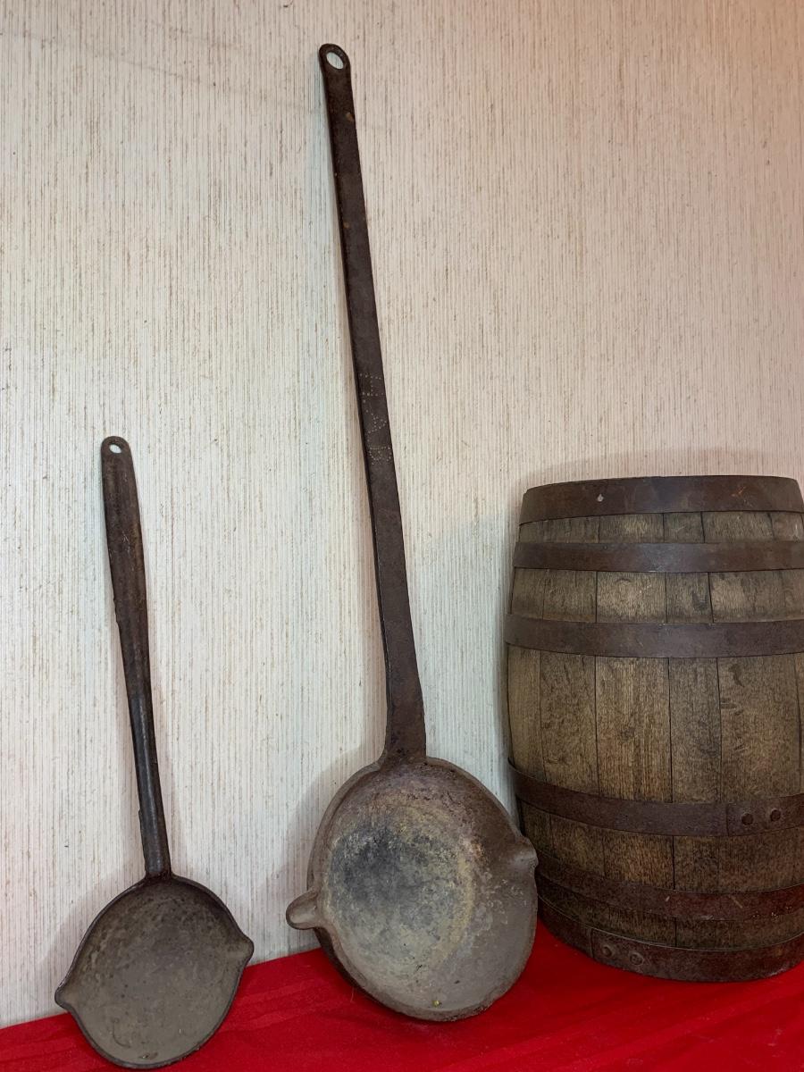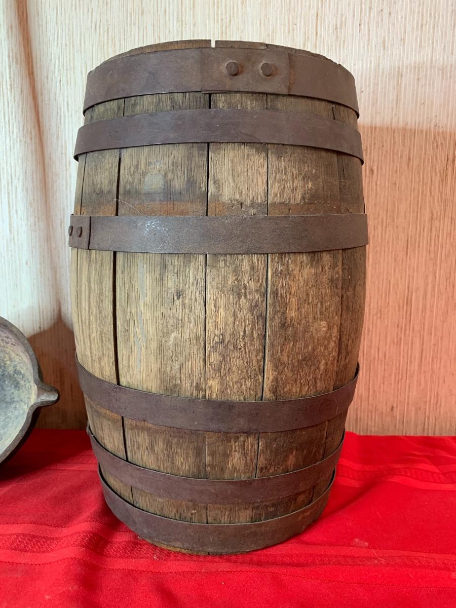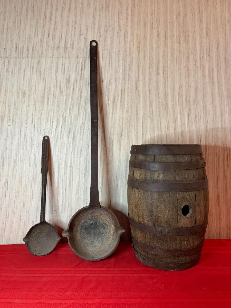 Two antique iron cooking pieces (small- 19 1/2 inches, large- 36 inches) and one wooden barrel (17 inches in height with 10 inches in diameter)