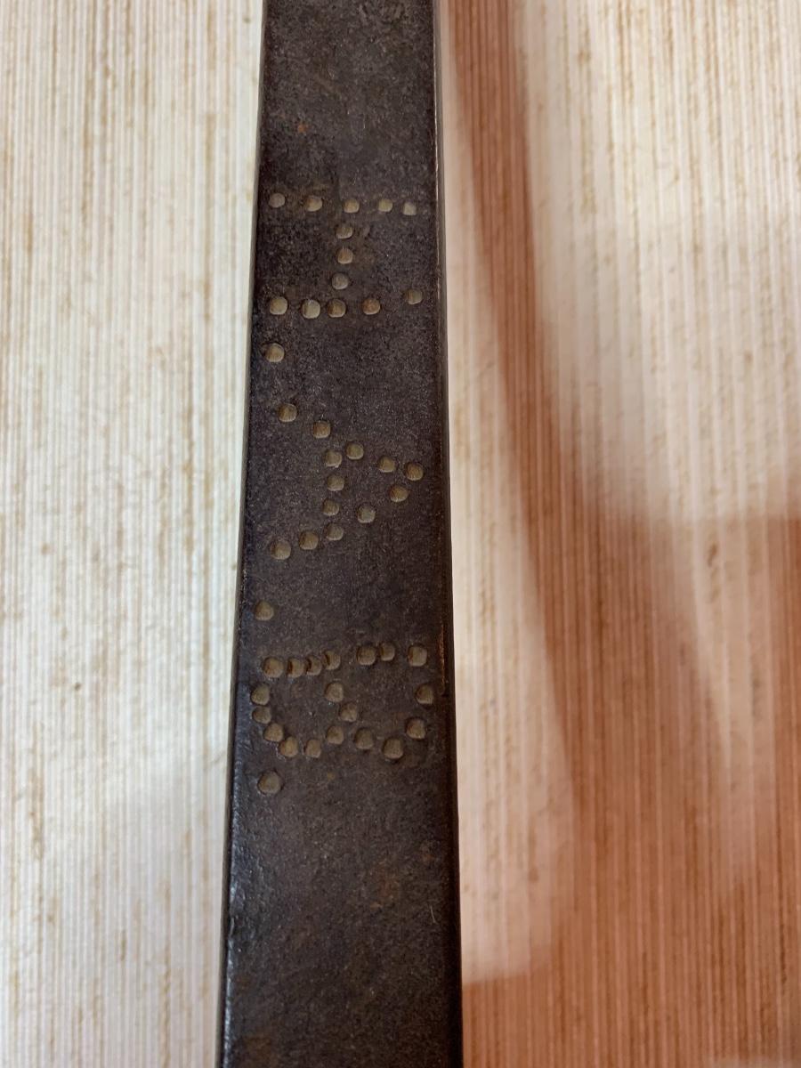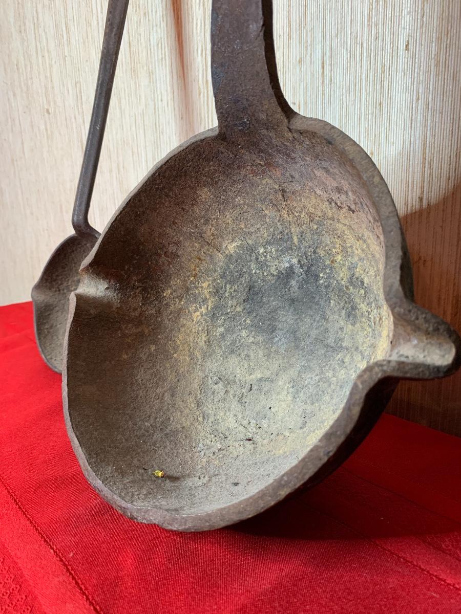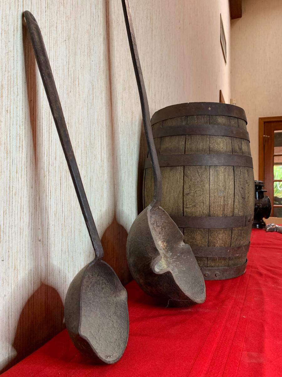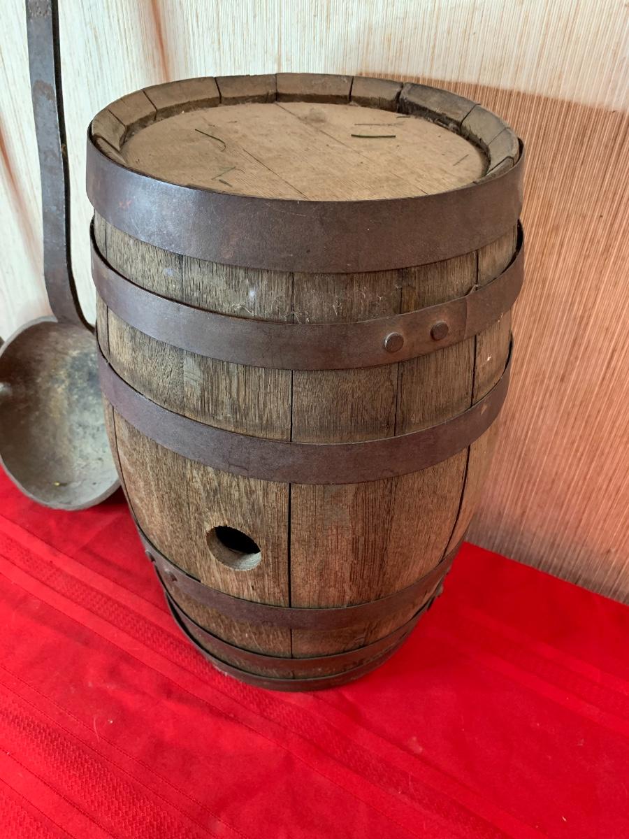 Two antique iron cooking pieces (small- 19 1/2 inches, large- 36 inches) and one wooden barrel (17 inches in height with 10 inches in diameter)
