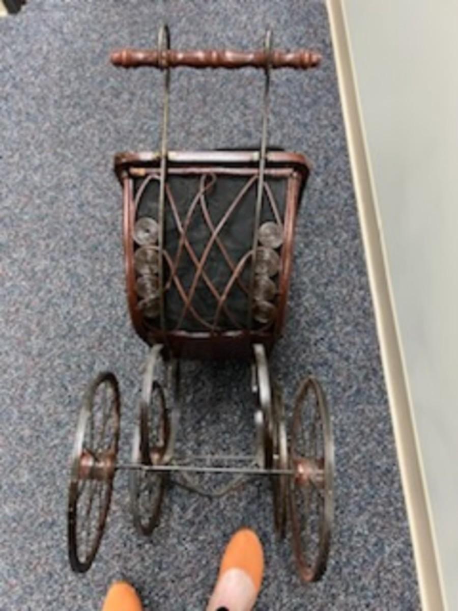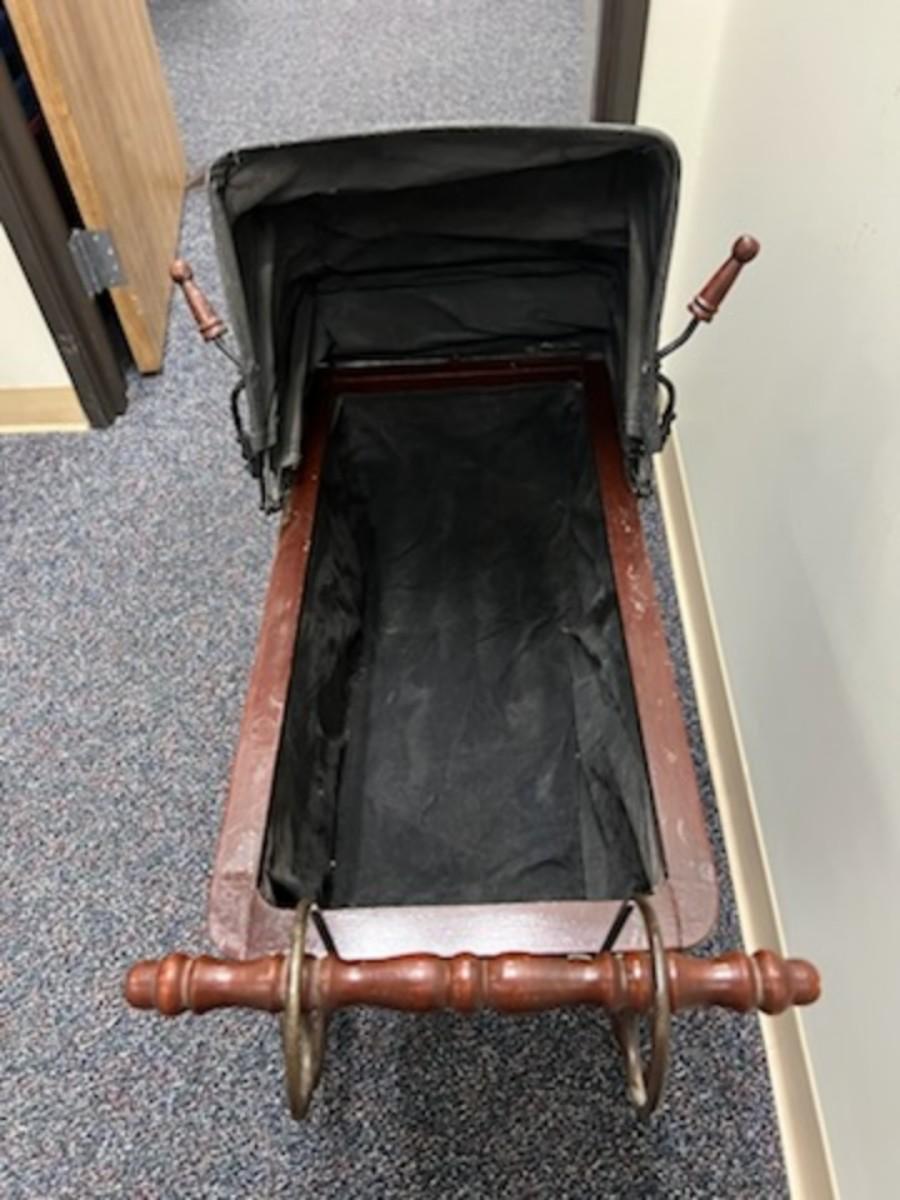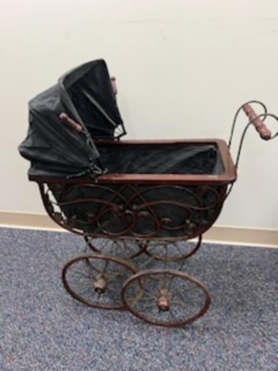 This is a classic, from the Washoe Estate. Wonderful old doll stroller with leather hood and canvas lining. This item is in good condition. It would look wonderful with your favorite doll or with holiday characters.