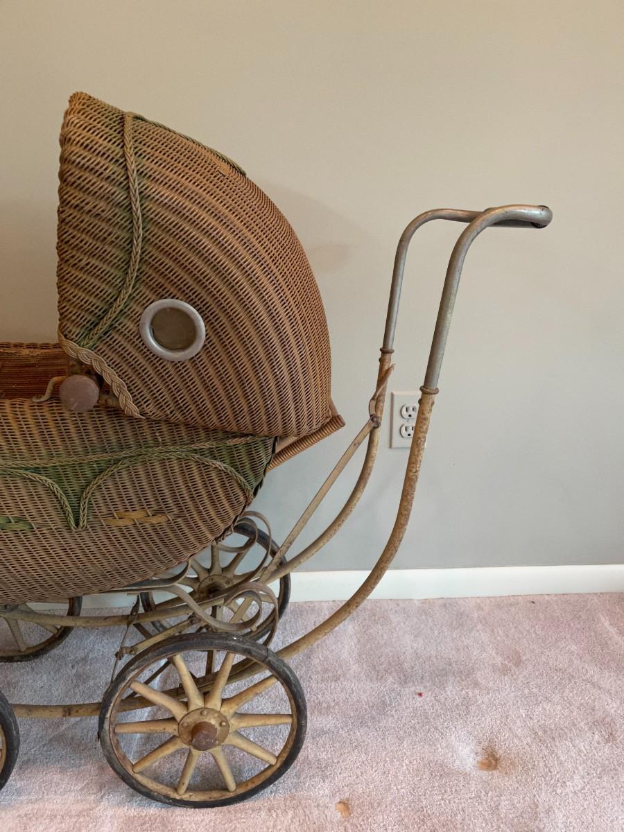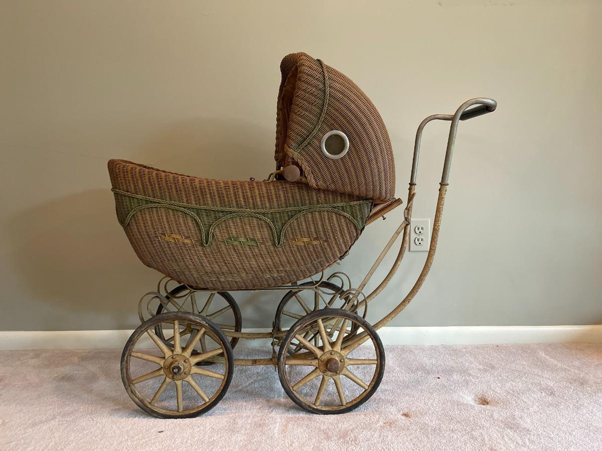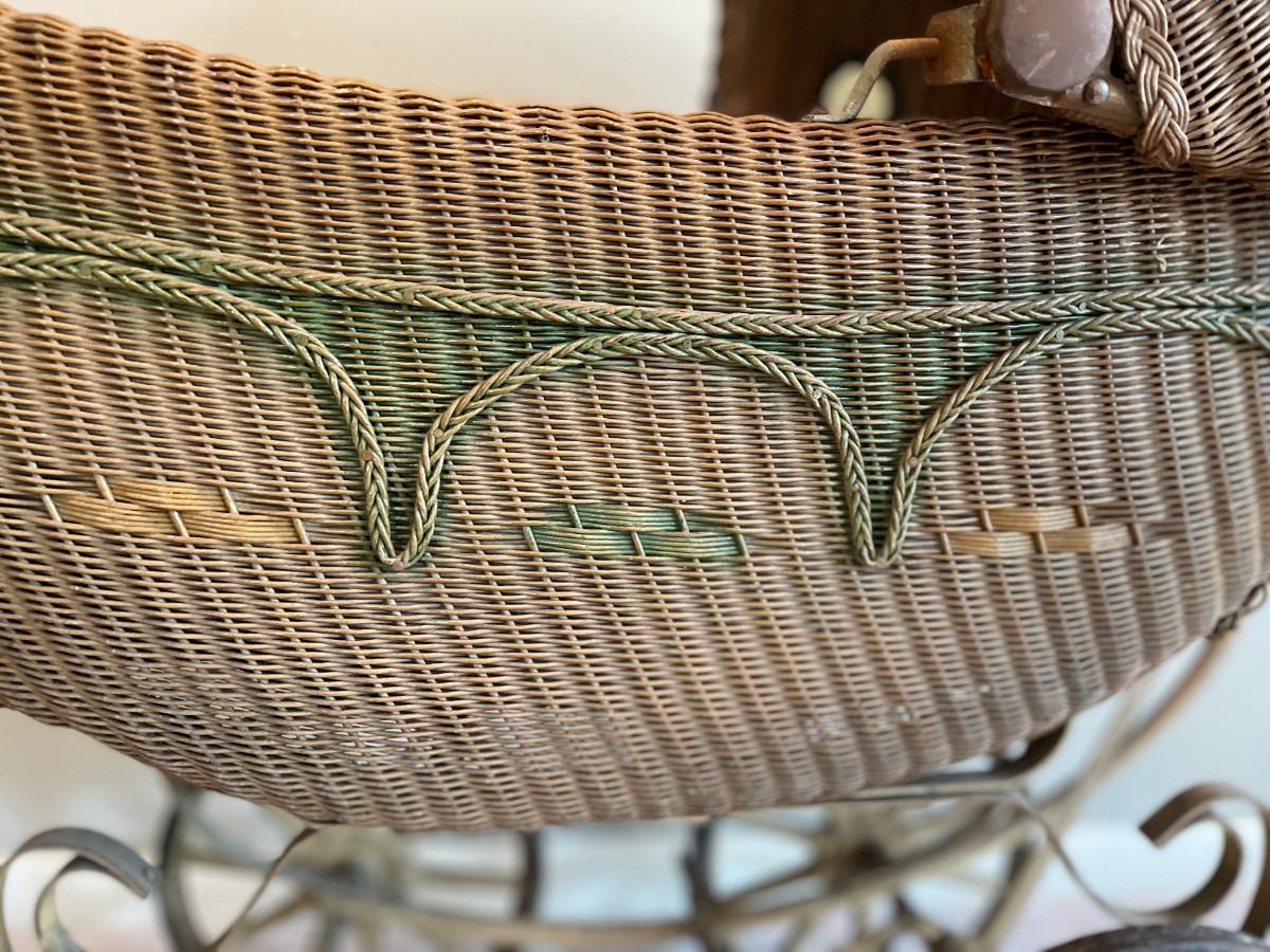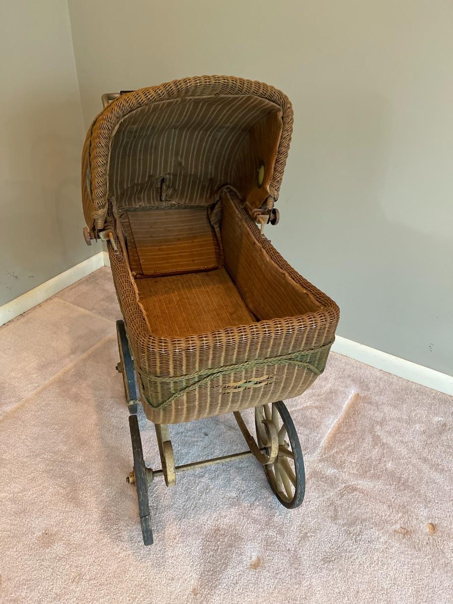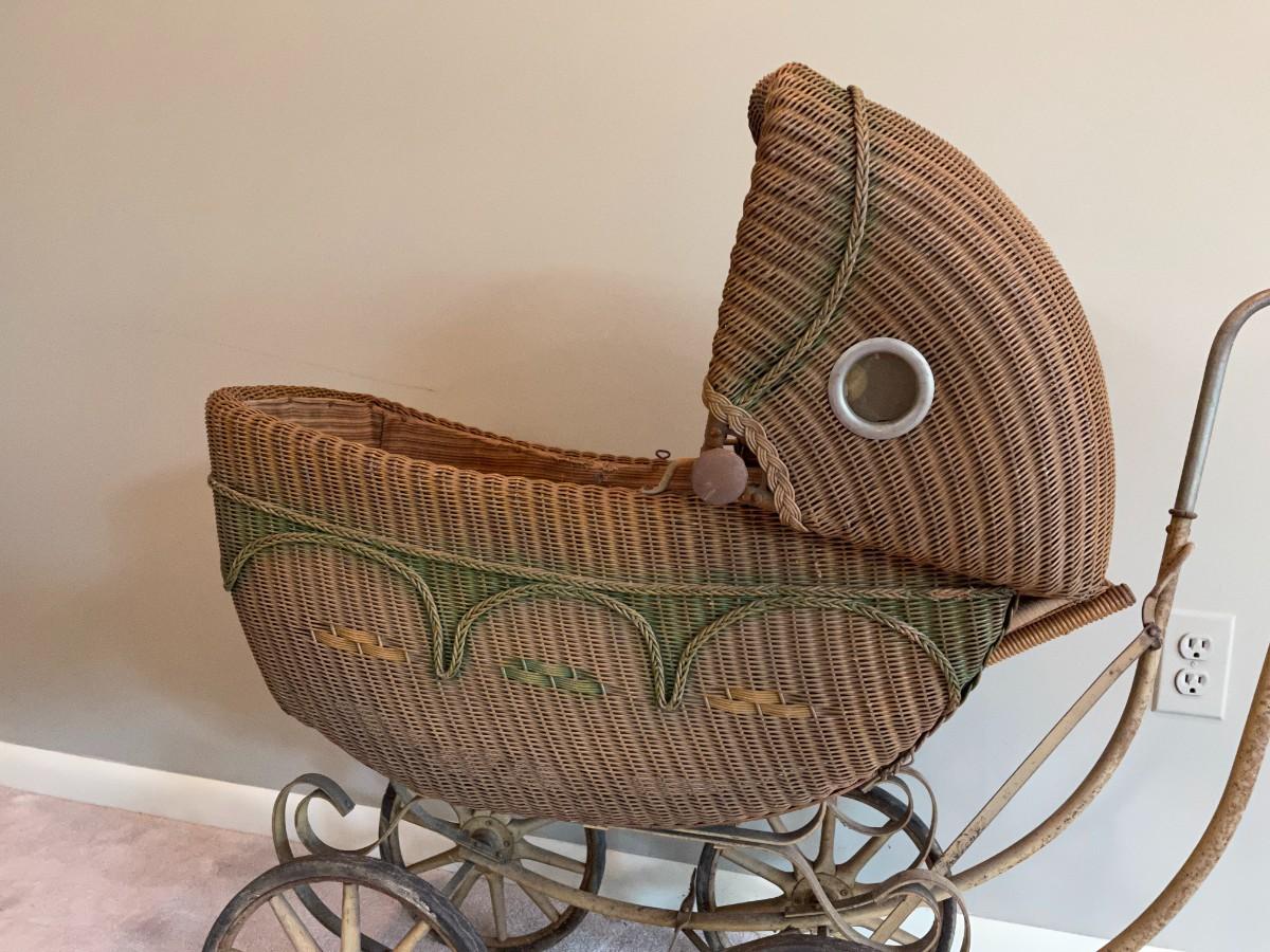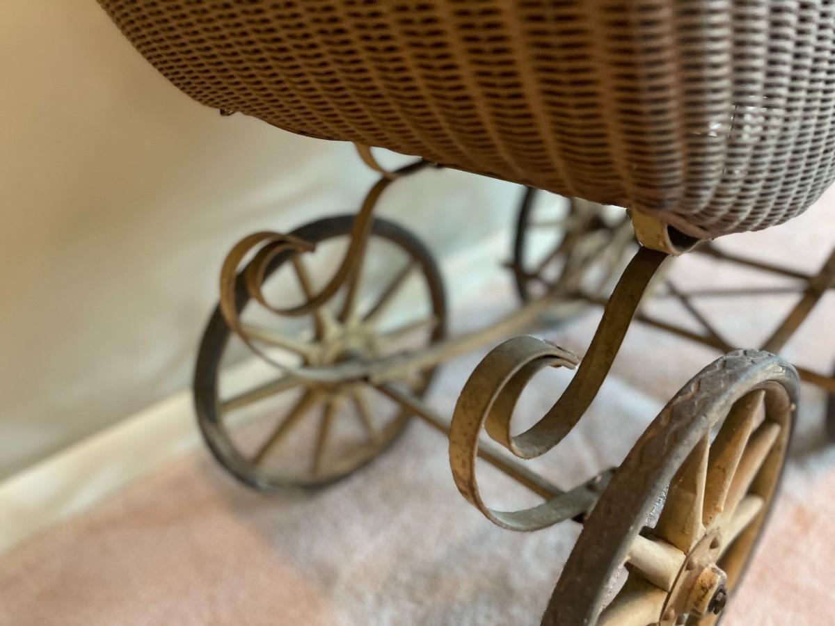 Antique wicker pram. Please examine photos carefully as the visor part is crooked. 37" long x 30" high x 17" wide. # 887