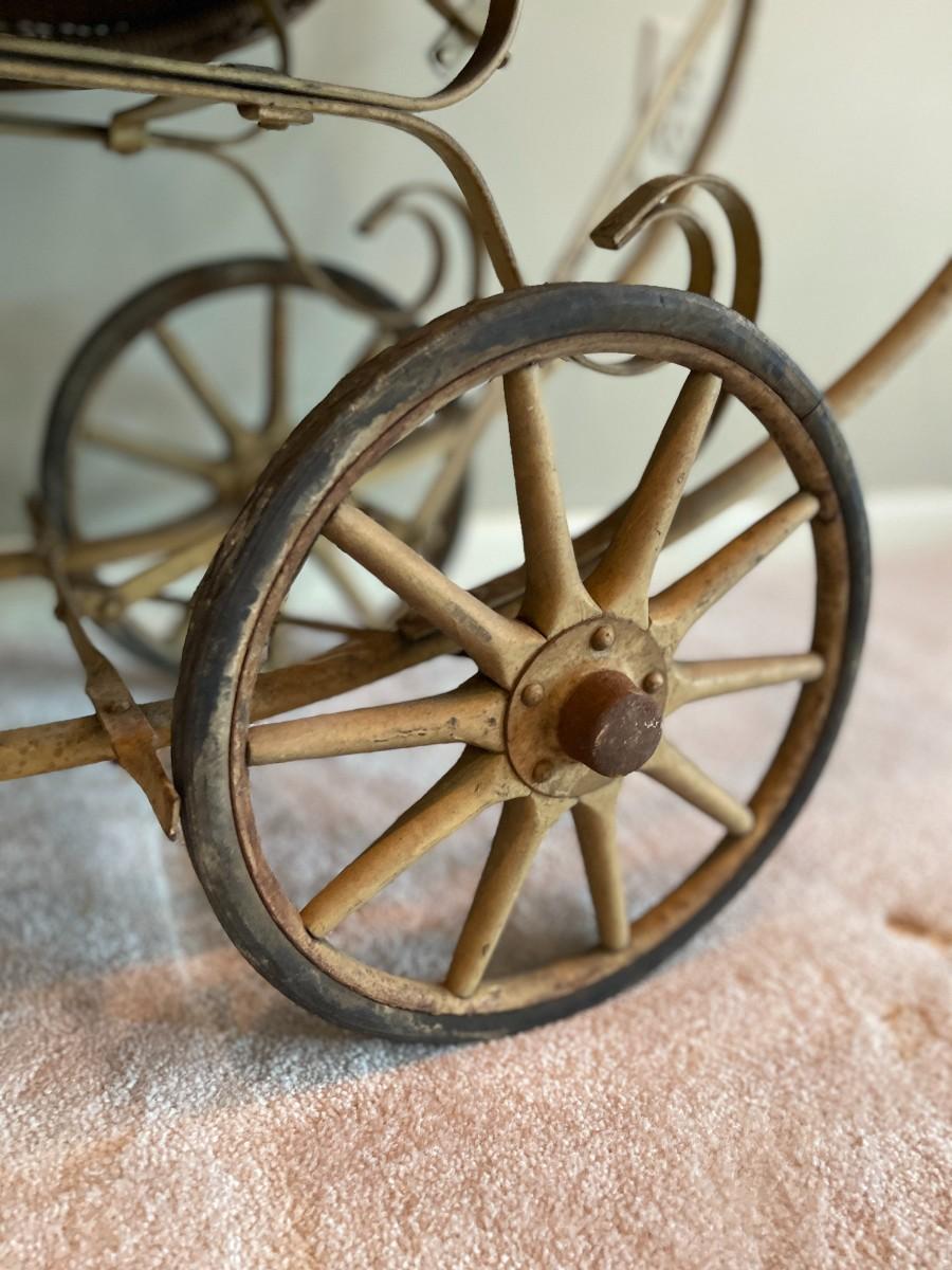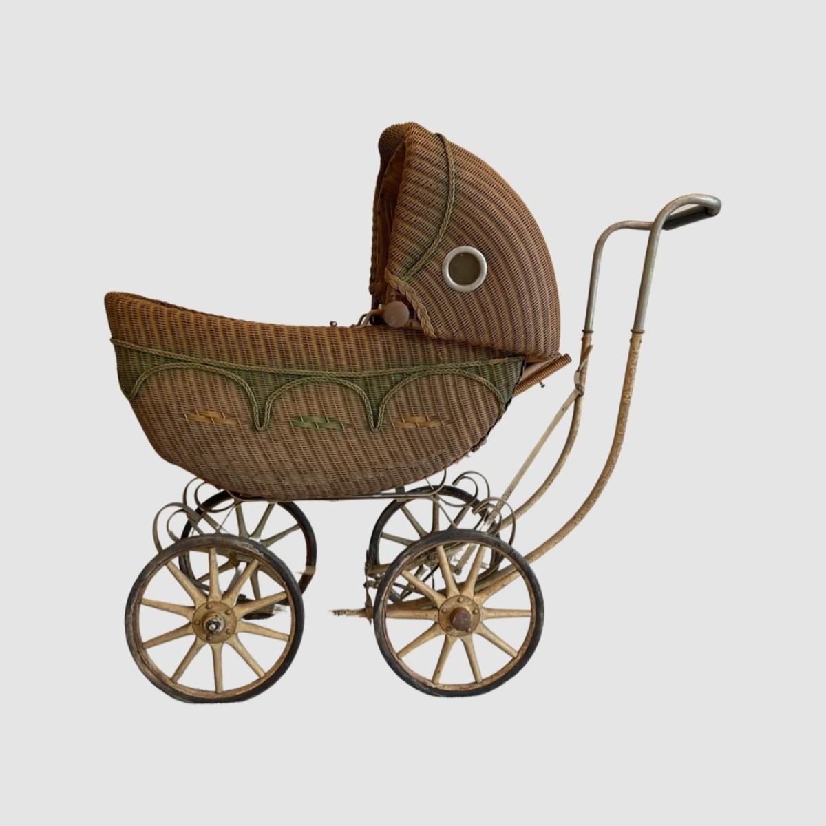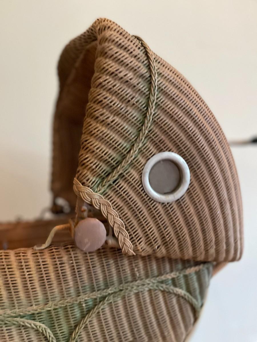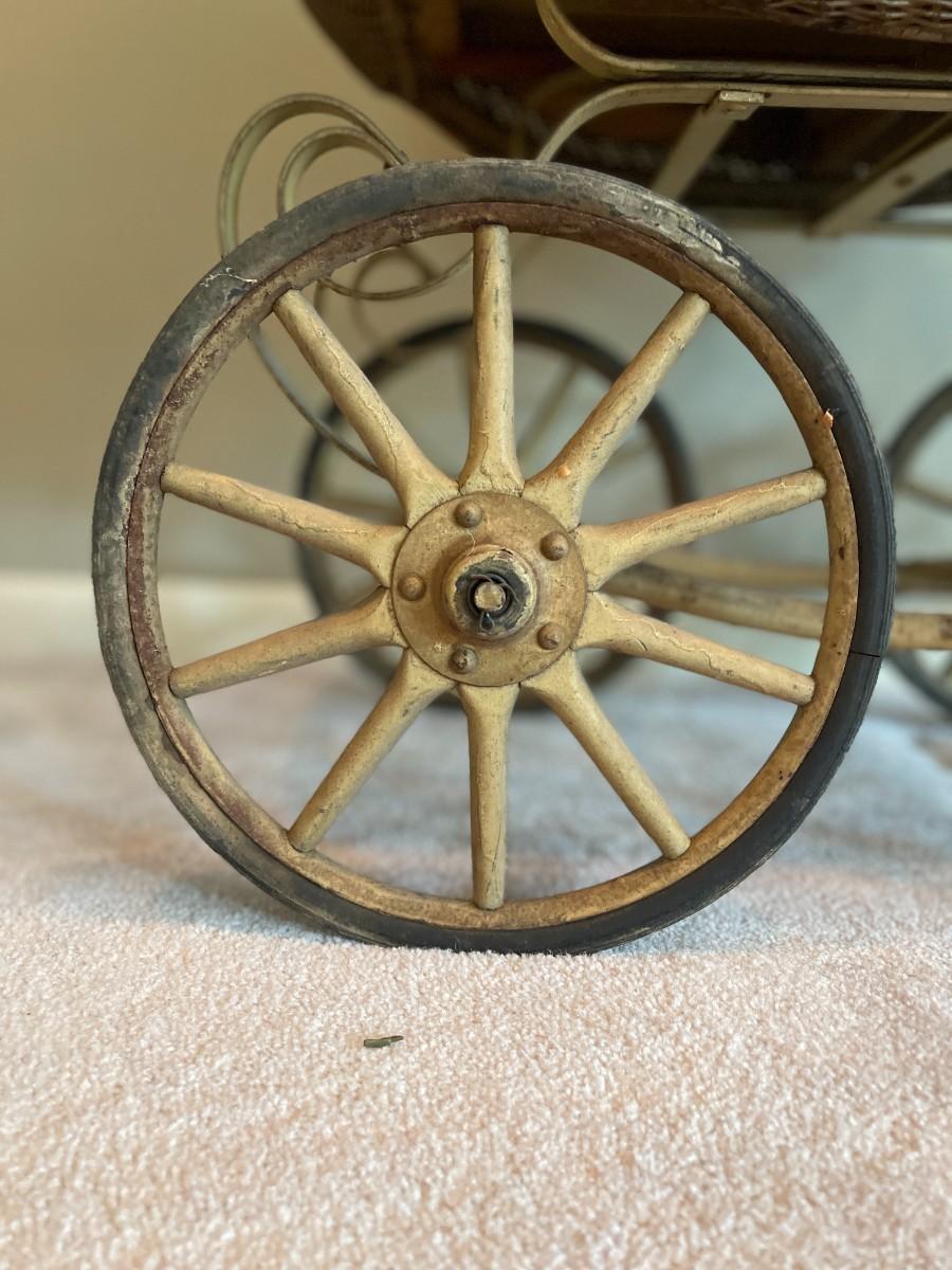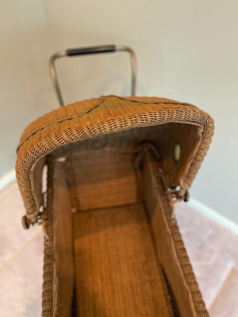 Antique wicker pram. Please examine photos carefully as the visor part is crooked. 37" long x 30" high x 17" wide. # 887