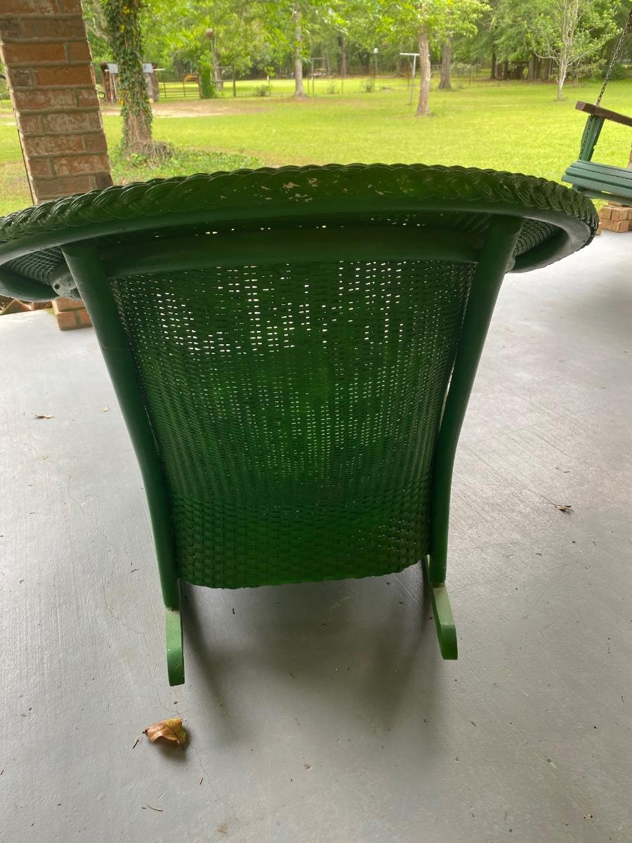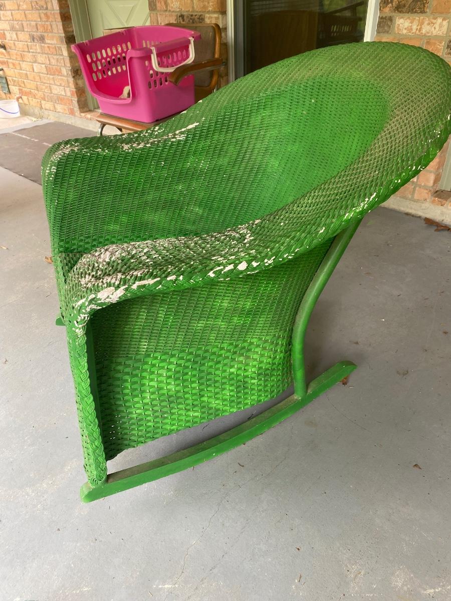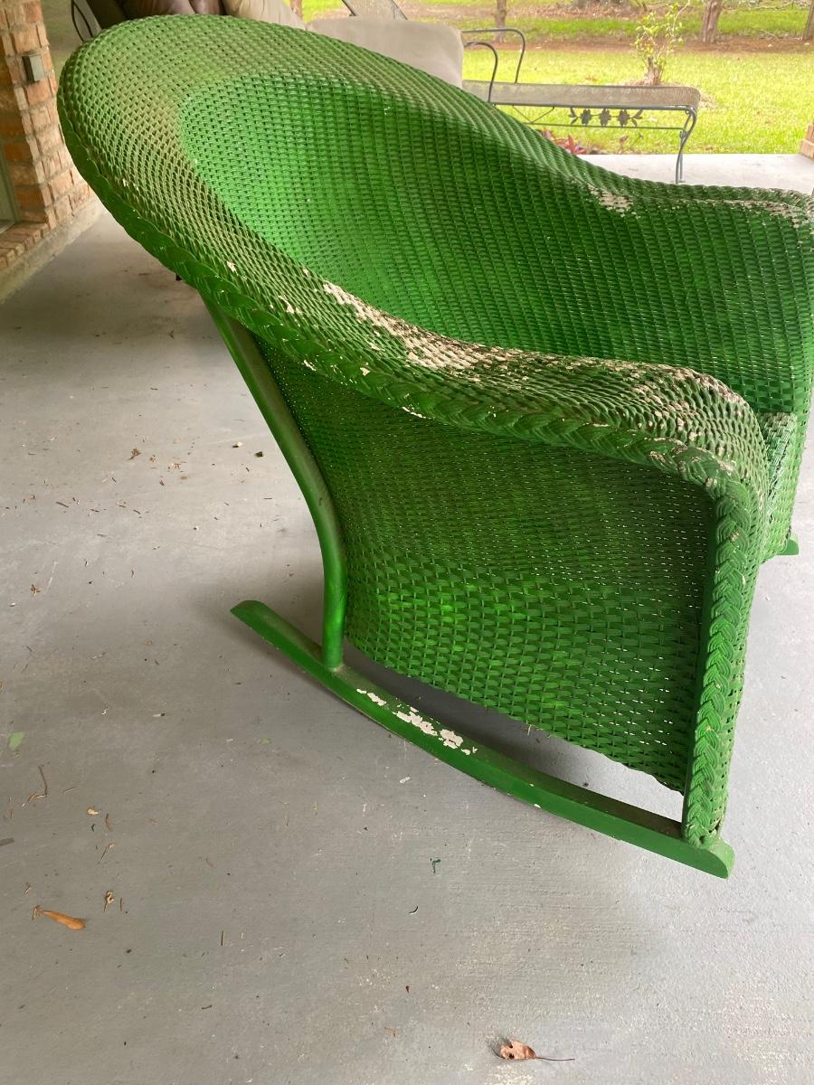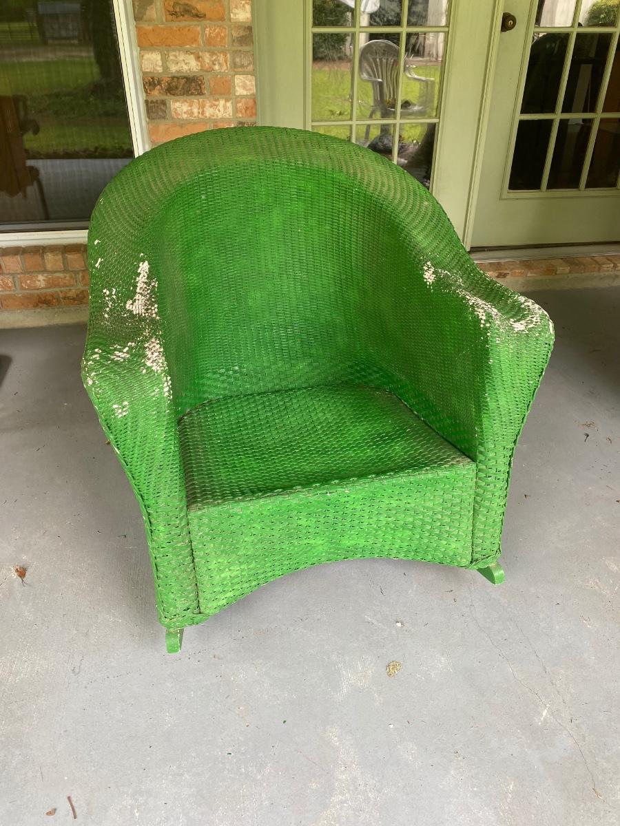 Antique wicker rocking chair. Good vintage condition, with paint loss. Approx 33W x 33-1/2H x 33D