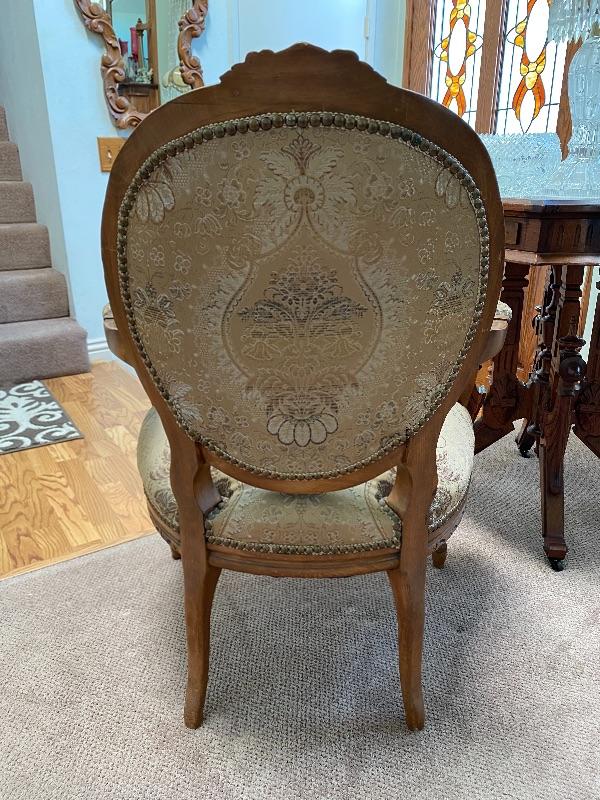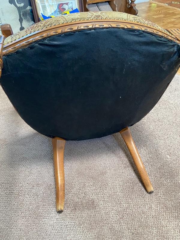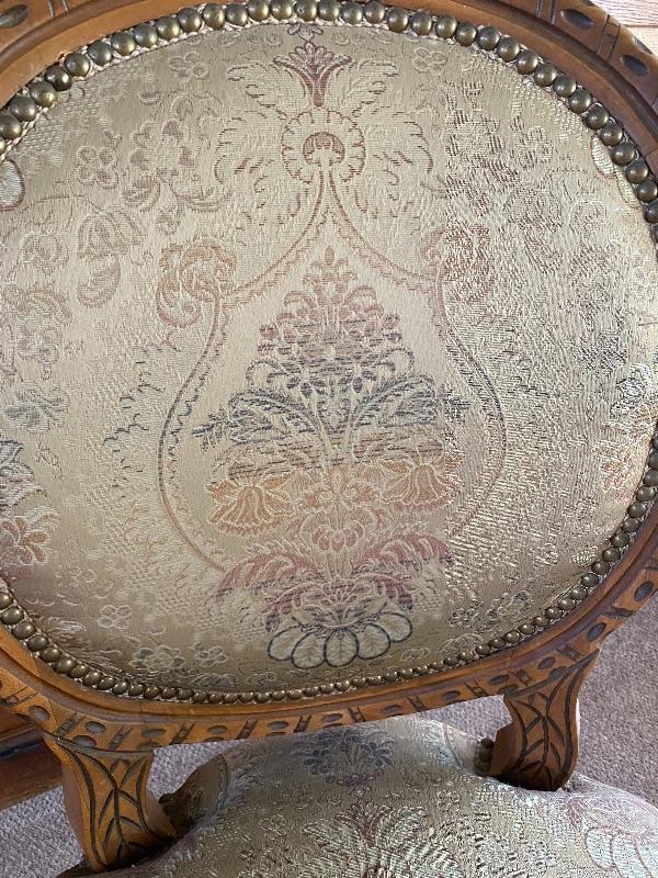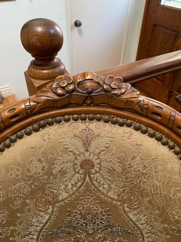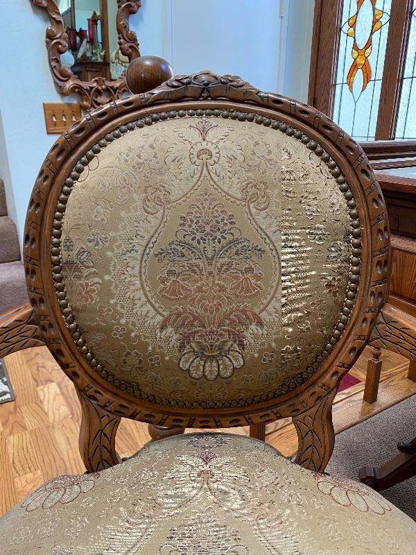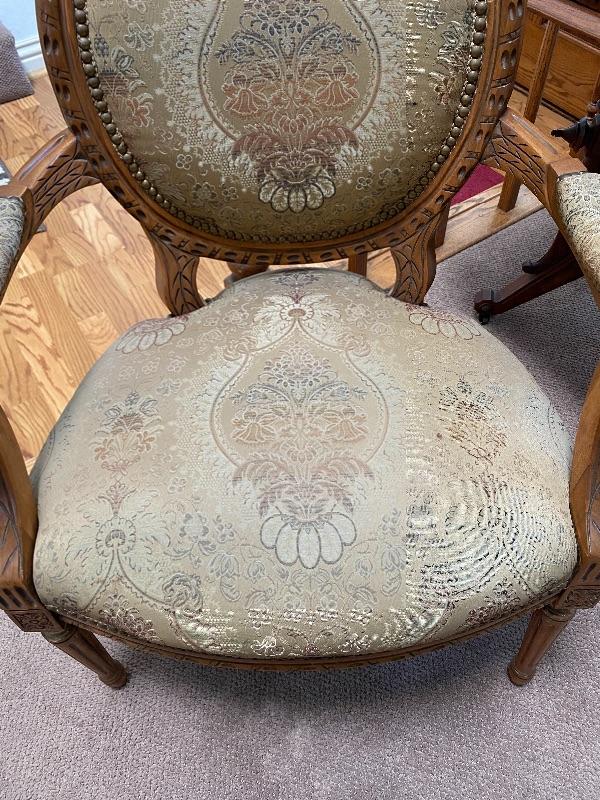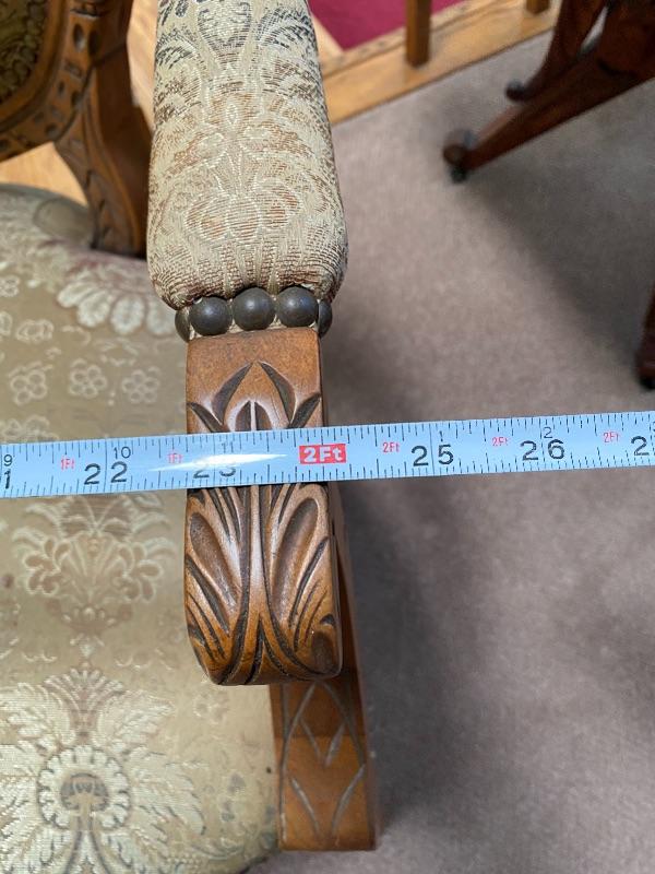 Antique pair of arm chairs. Medium finish oak with carved details. Beige colored upholstery has a faint pale multicolor pattern in it. Seats sit low and are wider then a standard chair. One chair has had repairs done to the front legs. About 24" wide and 3' tall. No obvious spots or holes.
