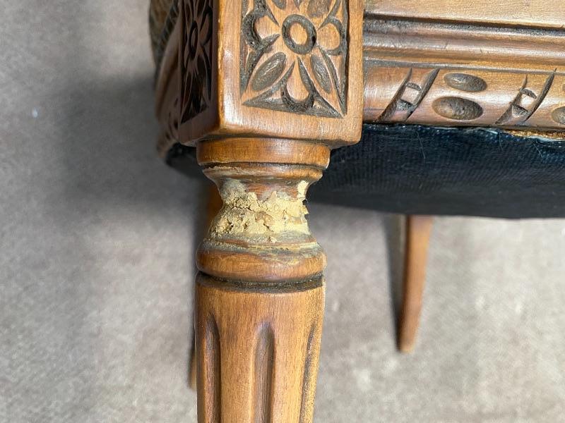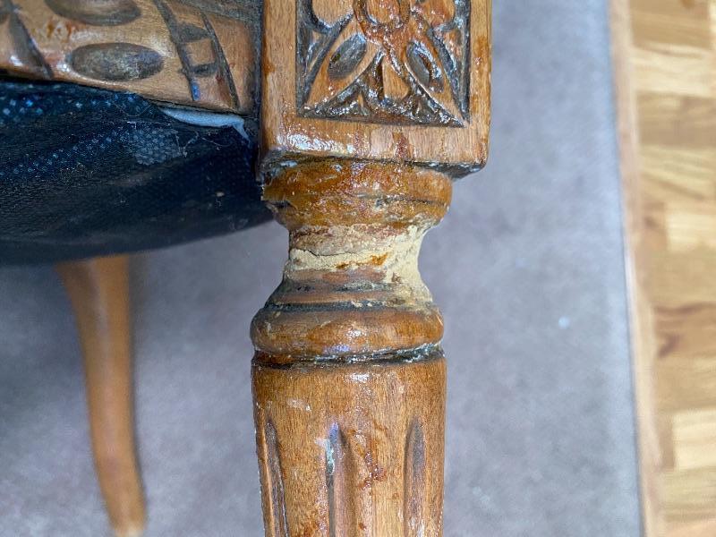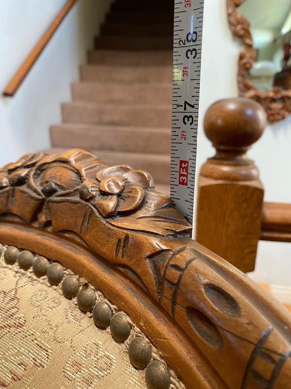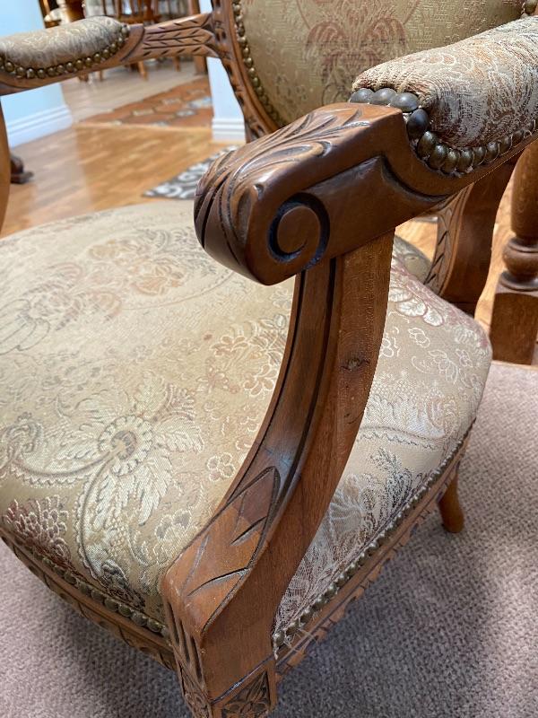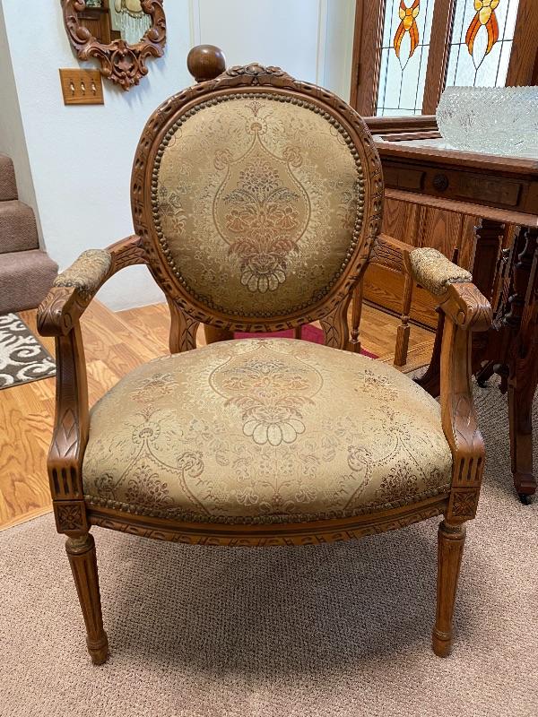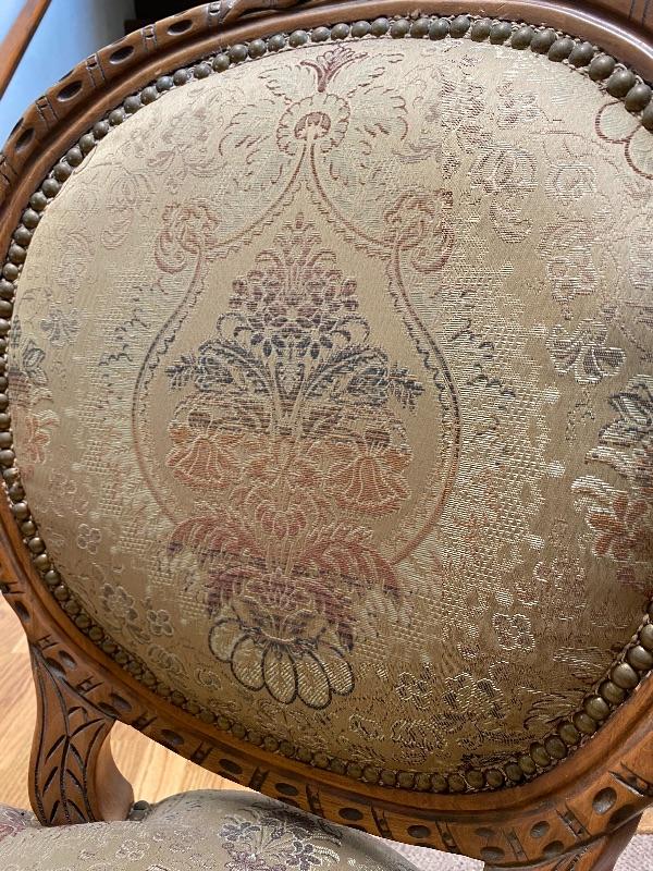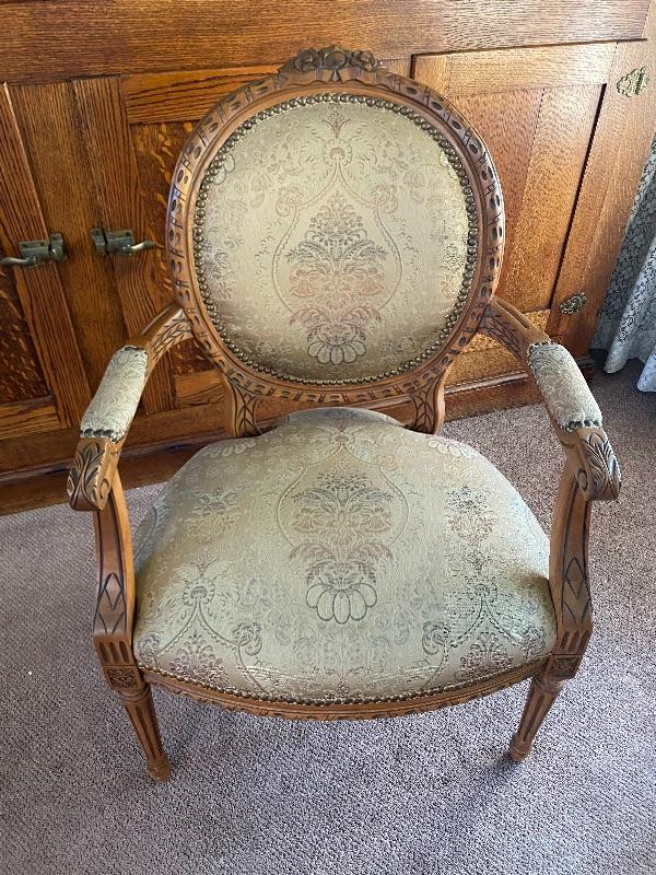 Antique pair of arm chairs. Medium finish oak with carved details. Beige colored upholstery has a faint pale multicolor pattern in it. Seats sit low and are wider then a standard chair. One chair has had repairs done to the front legs. About 24" wide and 3' tall. No obvious spots or holes.